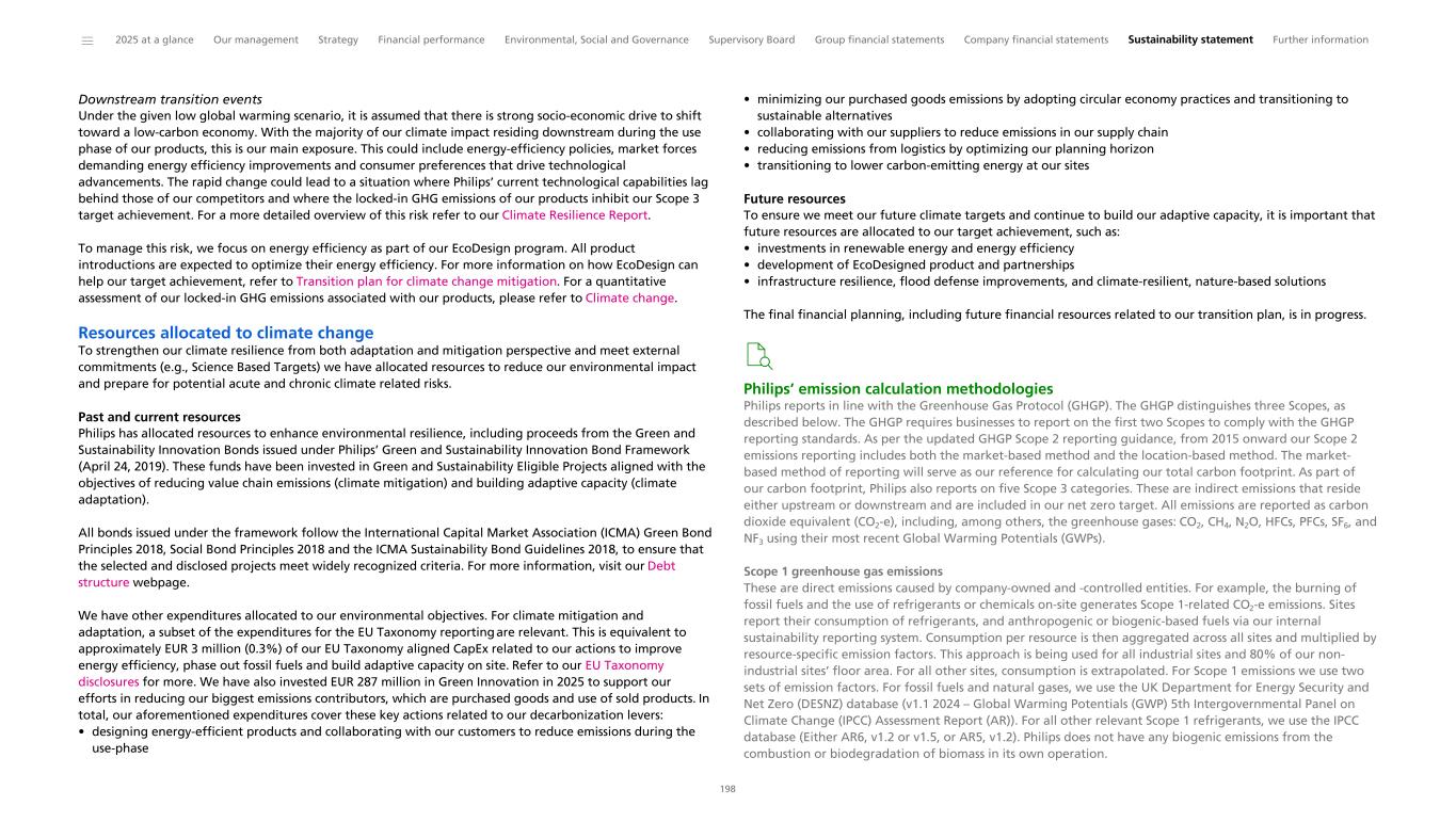 ESRS-2 General disclosure Minimum disclosure requirement – Metrics MDR-M – Metrics in relation to material sustainability matters Sustainability statement: Tracking our 2025 ESG program Sustainability statement: Double Materiality Assessment 169 175 ⁴ Minimum disclosure requirement – Targets MDR-T – Tracking effectiveness of policies and actions through targets Sustainability statement: Tracking our 2025 ESG program Sustainability statement: Double Materiality Assessment 169 175 ⁴ ESRS E1 Climate change Disclosure requirement related to ESRS 2 GOV-3 Integration of sustainability-related performance in incentive schemes Remuneration Report Remuneration Report 80 84 Limited Assurance Disclosure Requirement E1-1 – Transition plan for climate change mitigation EUCL/P3/BRR Climate change: Philips transition plan 192 Limited Assurance Disclosure Requirement related to ESRS 2 SBM-3 – Material impacts, risks and opportunities and their interaction with strategy and business model 1,2,3,4 Governance: Working with stakeholders and advocacy ESG governance, strategy and policies: Strategy Sustainability statement: IRO table Climate change: Impact, risk and opportunity management, excluding paragraphs Transition plan for climate change mitigation 58 173 177 192 Reasonable Assurance Disclosure requirement related to ESRS 2 IRO-1 – Description of the processes to identify and assess material climate-related impacts, risks and opportunities Governance: Working with stakeholders and advocacy Sustainability statement: Double Materiality Assessment Climate change: Impact, risk and opportunity management, excluding paragraph Transition plan for climate change mitigation 58 175 192 Reasonable Assurance Disclosure Requirement E1-2 – Policies related to climate change mitigation and adaptation Double Materiality Assessment: Policy Overview Climate change: Policies, metrics and targets 185 187 Reasonable Assurance Disclosure Requirement E1-3 – Actions and resources in relation to climate change policies Climate change: Actions associated with climate change Climate change: Resources allocated to climate change 188 198 Limited Assurance Disclosure Requirement E1-4 – Targets related to climate change mitigation and adaptation SFDR/P3/BRR Climate change: Policies, metrics and targets Climate change: Designing energy-efficient products 187 192 Limited Assurance Disclosure Requirement E1-5 – Energy consumption and mix SFDR Climate change: Energy consumption and mix 188 Reasonable Assurance Disclosure Requirement E1-6 – Gross Scopes 1, 2, 3 and Total GHG emissions SFDR/P3/BRR Environmental: Climate change Climate change: Gross Scopes 1, 2, 3 and Total GHG emissions 43 189 Reasonable Assurance Disclosure Requirement E1-7 – GHG removals and GHG mitigation projects financed through carbon credits EUCL Climate change: Philips’ GHG removals and GHG mitigation projects financed through carbon credits 191 Reasonable Assurance Disclosure Requirement E1-8 – Internal carbon pricing Climate change: Philips’ Internal carbon pricing 192 Reasonable Assurance Disclosure Requirement E1-9 – Anticipated financial effects from material physical and transition risks and potential climate-related opportunities P3/BRR Philips makes use of the phase-in provision CSRD Topic 1 CSRD Disclosure requirement Other EU legislation 2 Reference Pages 3 Assurance level 4 ______ 2025 at a glance Our management Strategy Financial performance Environmental, Social and Governance Supervisory Board Group financial statements Company financial statements Sustainability statement Further information 243 1 Disclosure requirements and related datapoints derived from other EU legislation listed in Appendix B of ESRS 2 which Philips deems material have been included in the cross-reference table. 2 EU Climate Law (EUCL), Sustainable Finance Disclosure Regulation (SFDR), Climate Benchmark Standards Regulation (BRR), EBA Pillar 3 Disclosure Requirements (P3). 3 The page references a specific element of information which addresses the relevant datapoint prescribed by the corresponding Disclosure Requirement. 4 For the level of assurance PwC provides for each element of MDR, we refer to the topical sections where the MDRs are related to for the applicable assurance level.