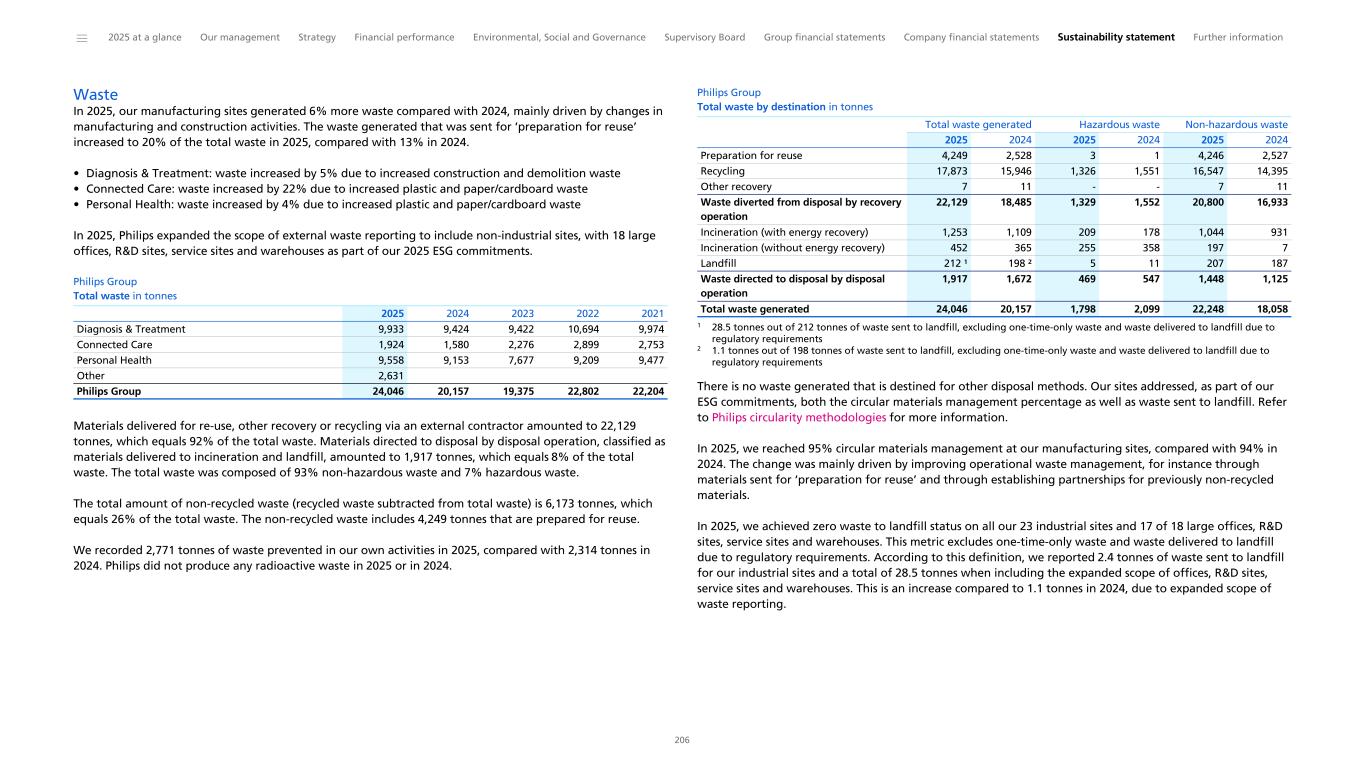 Note III Other environmental information Sustainable Operations Our Sustainable Operations program relates to improving the environmental performance of our manufacturing facilities and focus on most of the contributors to climate change, circular economy and biodiversity and ecosystem services loss, addressing also, for example, water, recycling of waste and chemical substances. Of the topics described below, water and pollution are not material topics as per the 2025 DMA. Philips Group Sustainable sites Total CO₂ from manufacturing ¹ 0 kilotonnes 0 kilotonnes 0 kilotonnes Water withdrawal ² 696,791 m³ 753,508 m³ 5% reduction Zero waste to landfill 0.0 % 2.6 % less than 0.5% Circular Materials Management 95 % 90 % 95 % Hazardous substances emissions 1,198 kilos 2,465 kilos 25% reduction VOC emissions 63 tonnes 79 tonnes 10% reduction Actual 2025 Baseline year 2020 Target 2025 1 Net carbon footprint, includes offsets 2 Baseline 2019 Water Total water withdrawal in 2025 was 696,791 m3, a 4% increase compared with 2024 and a 8% reduction compared with 2019 (pre-COVID level). Diagnosis & Treatment, which consumes 47% of Philips’ total water usage, recorded a 1% reduction, mainly caused by water efficiency improvements and a water recovery system installed in a site in Costa Rica. Personal Health recorded a 2% increase, as a result of increased manufacturing activities at a site in Indonesia. Connected Care showed an increase of 23%, due to relocation of one of our manufacturing sites in China. Annually, we undertake thorough assessments of both our operational sites and strategic suppliers to address potential water-related risks. Even though not considered as material in our DMA, we recognize the importance of responsible water management. We utilize publicly accessible tools such as the Aqueduct Water Risk Atlas by WRI and WWF Water Risk Filter to define and respond to these risks. This comprehensive process evaluates the vulnerability of our sites to various risks, including water stress. While Philips is not a water-intensive organization, this practice ensures the uninterrupted continuity of our operations and the provision of high-quality Water, Sanitation and Hygiene (WASH) services at all our sites. Among our facilities, two locations in India and Costa Rica have been identified as exposed to substantive financial and strategic risks from heavy precipitation. Sea-level rise does not currently present a high priority risk to any site, however, locations in the Netherlands, Germany and Indonesia continue to be monitored due to their proximity to low-lying areas. Furthermore, across the US, India, China, Israel, Germany, and the Netherlands, six sites are in regions with extremely high-water stress and three sites are in regions with high water stress. We are proud to have again received an ’A’ score for disclosure transparency on water security in the CDP Europe 2025, demonstrating our ongoing commitment to water risk management and sustainability practices. Philips Group Water withdrawal in thousands of m3 Diagnosis & Treatment 331 333 324 310 337 Connected Care 108 88 99 111 119 Personal Health 258 252 286 302 282 Philips Group 697 673 709 723 738 2025 2024 2023 2022 2021 In 2025, 93% of water was purchased and 7% was extracted from groundwater wells. Hazardous substances emissions Compared to heavy industry, our sites have relatively few chemical emissions, and we have voluntary targets to reduce them. However, most of our manufacturing operations have processes that result in some emissions to air and water. Therefore, we carefully monitor all emissions and are working to limit hazardous chemical and VOC emissions. Many of these decisions happen at the product and process design stage. Philips Group Hazardous substances emissions in kilograms Diagnosis & Treatment 131 162 158 175 181 Connected Care 710 708 781 863 1,239 Personal Health 357 345 362 510 1,242 Philips Group 1,198 1,216 1,300 1,548 2,662 2025 2024 2023 2022 2021 At Philips, we want to track the impact of chemical substances on a life-cycle basis and, based on a risk-level classification and precautionary principle, to ensure implementation in an active and practical way. The Classified Substances List (CSL) has been set up to manage, restrict, control and/or monitor chemical substances according to regulation requirements and/or known risks. In our CSL, we label substances with known harmful effects on health and the environment as 'Risk Level II'. This classification requires action to minimize exposure and emissions. In 2025, we continued our efforts to adopt safer chemicals, reducing exposure to carcinogenic, mutagenic, and reprotoxic hazards at our industrial sites. The hazardous substances emissions amounted to 1,198 kg in 2025, which is a 1% reduction compared with 1,216 kg in 2024. In the Diagnosis & Treatment segment the emissions decreased by 19% due to efficiency improvements in manufacturing processes in ______ 2025 at a glance Our management Strategy Financial performance Environmental, Social and Governance Supervisory Board Group financial statements Company financial statements Sustainability statement Further information 210