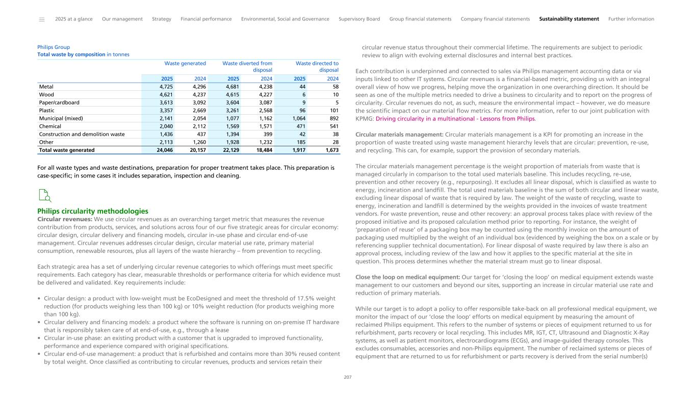 Philips Group Total waste by composition in tonnes 2025 2024 2025 2024 2025 2024 Metal 4,725 4,296 4,681 4,238 44 58 Wood 4,621 4,237 4,615 4,227 6 10 Paper/cardboard 3,613 3,092 3,604 3,087 9 5 Plastic 3,357 2,669 3,261 2,568 96 101 Municipal (mixed) 2,141 2,054 1,077 1,162 1,064 892 Chemical 2,040 2,112 1,569 1,571 471 541 Construction and demolition waste 1,436 437 1,394 399 42 38 Other 2,113 1,260 1,928 1,232 185 28 Total waste generated 24,046 20,157 22,129 18,484 1,917 1,673 Waste generated Waste diverted from disposal Waste directed to disposal For all waste types and waste destinations, preparation for proper treatment takes place. This preparation is case-specific; in some cases it includes separation, inspection and cleaning. Philips circularity methodologies Circular revenues: We use circular revenues as an overarching target metric that measures the revenue contribution from products, services, and solutions across four of our five strategic areas for circular economy: circular design, circular delivery and financing models, circular in-use phase and circular end-of-use management. Circular revenues addresses circular design, circular material use rate, primary material consumption, renewable resources, plus all layers of the waste hierarchy – from prevention to recycling. Each strategic area has a set of underlying circular revenue categories to which offerings must meet specific requirements. Each category has clear, measurable thresholds or performance criteria for which evidence must be delivered and validated. Key requirements include: • Circular design: a product with low-weight must be EcoDesigned and meet the threshold of 17.5% weight reduction (for products weighing less than 100 kg) or 10% weight reduction (for products weighing more than 100 kg). • Circular delivery and financing models: a product where the software is running on on-premise IT hardware that is responsibly taken care of at end-of-use, e.g., through a lease • Circular in-use phase: an existing product with a customer that is upgraded to improved functionality, performance and experience compared with original specifications. • Circular end-of-use management: a product that is refurbished and contains more than 30% reused content by total weight. Once classified as contributing to circular revenues, products and services retain their circular revenue status throughout their commercial lifetime. The requirements are subject to periodic review to align with evolving external disclosures and internal best practices. Each contribution is underpinned and connected to sales via Philips management accounting data or via inputs linked to other IT systems. Circular revenues is a financial-based metric, providing us with an integral overall view of how we progress, helping move the organization in one overarching direction. It should be seen as one of the multiple metrics needed to drive a business to circularity and to report on the progress of circularity. Circular revenues do not, as such, measure the environmental impact – however, we do measure the scientific impact on our material flow metrics. For more information, refer to our joint publication with KPMG: Driving circularity in a multinational - Lessons from Philips. Circular materials management: Circular materials management is a KPI for promoting an increase in the proportion of waste treated using waste management hierarchy levels that are circular: prevention, re-use, and recycling. This can, for example, support the provision of secondary materials. The circular materials management percentage is the weight proportion of materials from waste that is managed circularly in comparison to the total used materials baseline. This includes recycling, re-use, prevention and other recovery (e.g., repurposing). It excludes all linear disposal, which is classified as waste to energy, incineration and landfill. The total used materials baseline is the sum of both circular and linear waste, excluding linear disposal of waste that is required by law. The weight of the waste of recycling, waste to energy, incineration and landfill is determined by the weights provided in the invoices of waste treatment vendors. For waste prevention, reuse and other recovery: an approval process takes place with review of the proposed initiative and its proposed calculation method prior to reporting. For instance, the weight of ‘preparation of reuse’ of a packaging box may be counted using the monthly invoice on the amount of packaging used multiplied by the weight of an individual box (evidenced by weighing the box on a scale or by referencing supplier technical documentation). For linear disposal of waste required by law there is also an approval process, including review of the law and how it applies to the specific material at the site in question. This process determines whether the material stream must go to linear disposal. Close the loop on medical equipment: Our target for ‘closing the loop’ on medical equipment extends waste management to our customers and beyond our sites, supporting an increase in circular material use rate and reduction of primary materials. While our target is to adopt a policy to offer responsible take-back on all professional medical equipment, we monitor the impact of our ‘close the loop’ efforts on medical equipment by measuring the amount of reclaimed Philips equipment. This refers to the number of systems or pieces of equipment returned to us for refurbishment, parts recovery or local recycling. This includes MR, IGT, CT, Ultrasound and Diagnostic X-Ray systems, as well as patient monitors, electrocardiograms (ECGs), and image-guided therapy consoles. This excludes consumables, accessories and non-Philips equipment. The number of reclaimed systems or pieces of equipment that are returned to us for refurbishment or parts recovery is derived from the serial number(s) ______ 2025 at a glance Our management Strategy Financi