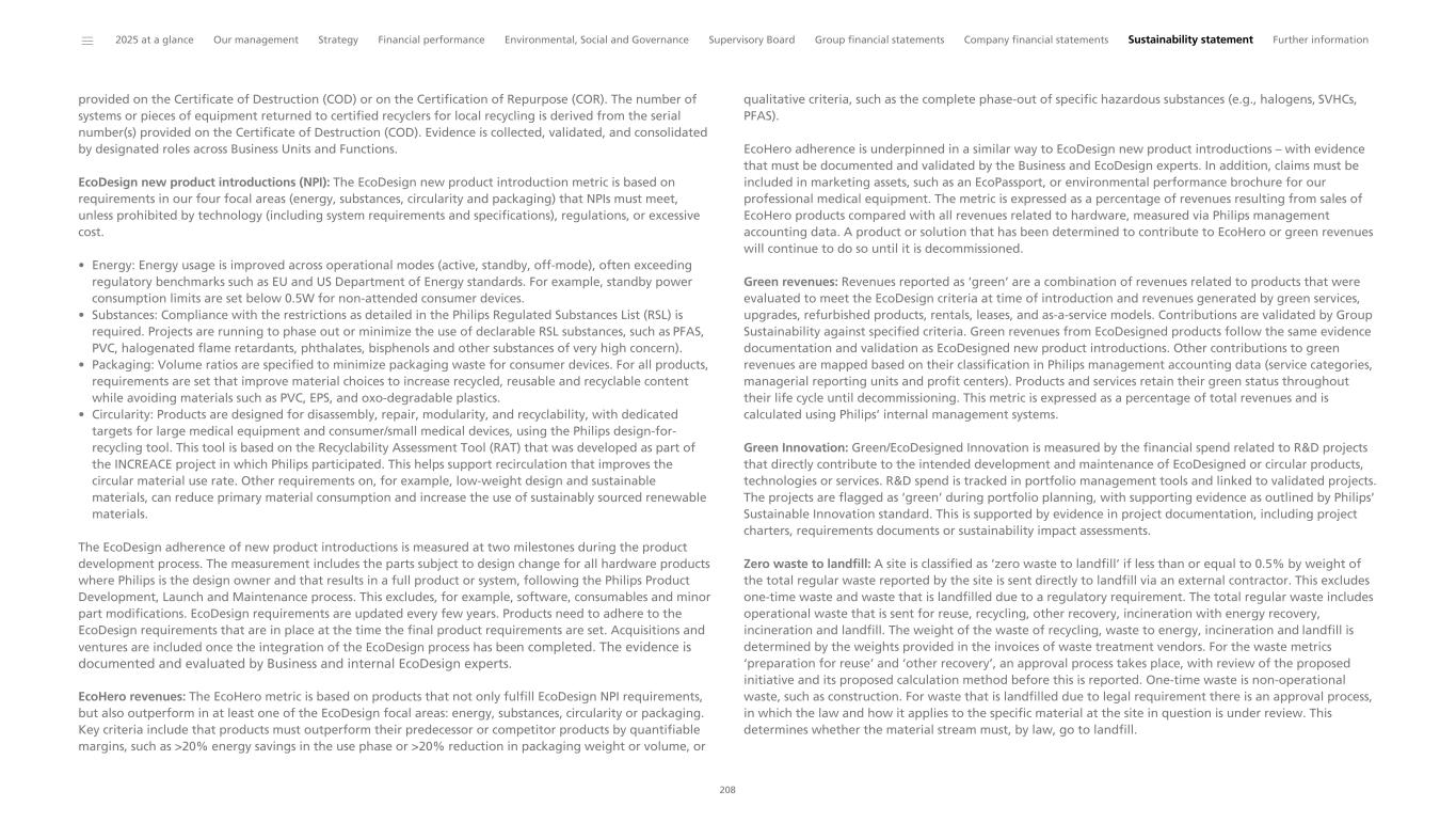 provided on the Certificate of Destruction (COD) or on the Certification of Repurpose (COR). The number of systems or pieces of equipment returned to certified recyclers for local recycling is derived from the serial number(s) provided on the Certificate of Destruction (COD). Evidence is collected, validated, and consolidated by designated roles across Business Units and Functions. EcoDesign new product introductions (NPI): The EcoDesign new product introduction metric is based on requirements in our four focal areas (energy, substances, circularity and packaging) that NPIs must meet, unless prohibited by technology (including system requirements and specifications), regulations, or excessive cost. • Energy: Energy usage is improved across operational modes (active, standby, off-mode), often exceeding regulatory benchmarks such as EU and US Department of Energy standards. For example, standby power consumption limits are set below 0.5W for non-attended consumer devices. • Substances: Compliance with the restrictions as detailed in the Philips Regulated Substances List (RSL) is required. Projects are running to phase out or minimize the use of declarable RSL substances, such as PFAS, PVC, halogenated flame retardants, phthalates, bisphenols and other substances of very high concern). • Packaging: Volume ratios are specified to minimize packaging waste for consumer devices. For all products, requirements are set that improve material choices to increase recycled, reusable and recyclable content while avoiding materials such as PVC, EPS, and oxo-degradable plastics. • Circularity: Products are designed for disassembly, repair, modularity, and recyclability, with dedicated targets for large medical equipment and consumer/small medical devices, using the Philips design-for- recycling tool. This tool is based on the Recyclability Assessment Tool (RAT) that was developed as part of the INCREACE project in which Philips participated. This helps support recirculation that improves the circular material use rate. Other requirements on, for example, low-weight design and sustainable materials, can reduce primary material consumption and increase the use of sustainably sourced renewable materials. The EcoDesign adherence of new product introductions is measured at two milestones during the product development process. The measurement includes the parts subject to design change for all hardware products where Philips is the design owner and that results in a full product or system, following the Philips Product Development, Launch and Maintenance process. This excludes, for example, software, consumables and minor part modifications. EcoDesign requirements are updated every few years. Products need to adhere to the EcoDesign requirements that are in place at the time the final product requirements are set. Acquisitions and ventures are included once the integration of the EcoDesign process has been completed. The evidence is documented and evaluated by Business and internal EcoDesign experts. EcoHero revenues: The EcoHero metric is based on products that not only fulfill EcoDesign NPI requirements, but also outperform in at least one of the EcoDesign focal areas: energy, substances, circularity or packaging. Key criteria include that products must outperform their predecessor or competitor products by quantifiable margins, such as >20% energy savings in the use phase or >20% reduction in packaging weight or volume, or qualitative criteria, such as the complete phase-out of specific hazardous substances (e.g., halogens, SVHCs, PFAS). EcoHero adherence is underpinned in a similar way to EcoDesign new product introductions – with evidence that must be documented and validated by the Business and EcoDesign experts. In addition, claims must be included in marketing assets, such as an EcoPassport, or environmental performance brochure for our professional medical equipment. The metric is expressed as a percentage of revenues resulting from sales of EcoHero products compared with all revenues related to hardware, measured via Philips management accounting data. A product or solution that has been determined to contribute to EcoHero or green revenues will continue to do so until it is decommissioned. Green revenues: Revenues reported as ‘green’ are a combination of revenues related to products that were evaluated to meet the EcoDesign criteria at time of introduction and revenues generated by green services, upgrades, refurbished products, rentals, leases, and as-a-service models. Contributions are validated by Group Sustainability against specified criteria. Green revenues from EcoDesigned products follow the same evidence documentation and validation as EcoDesigned new product introductions. Other contributions to green revenues are mapped based on their classification in Philips management accounting data (service categories, managerial reporting units and profit centers). Products and services retain their green status throughout their life cycle until decommissioning. This metric is expressed as a percentage of total revenues and is calculated using Philips’ internal management systems. Green Innovation: Green/EcoDesigned Innovation is measured by the financial spend related to R&D projects that directly contribute to the intended development and maintenance of EcoDesigned or circular products, technologies or services. R&D spend is tracked in portfolio management tools and linked to validated projects. The projects are flagged as ‘green’ during portfolio planning, with supporting evidence as outlined by Philips’ Sustainable Innovation standard. This is supported by evidence in project documentation, including project charters, requirements documents or sustainability impact assessments. Zero waste to landfill: A site is classified as ‘zero waste to landfill’ if less than or equal to 0.5% by weight of the total regular waste reported by the site is sent directly to landfill via