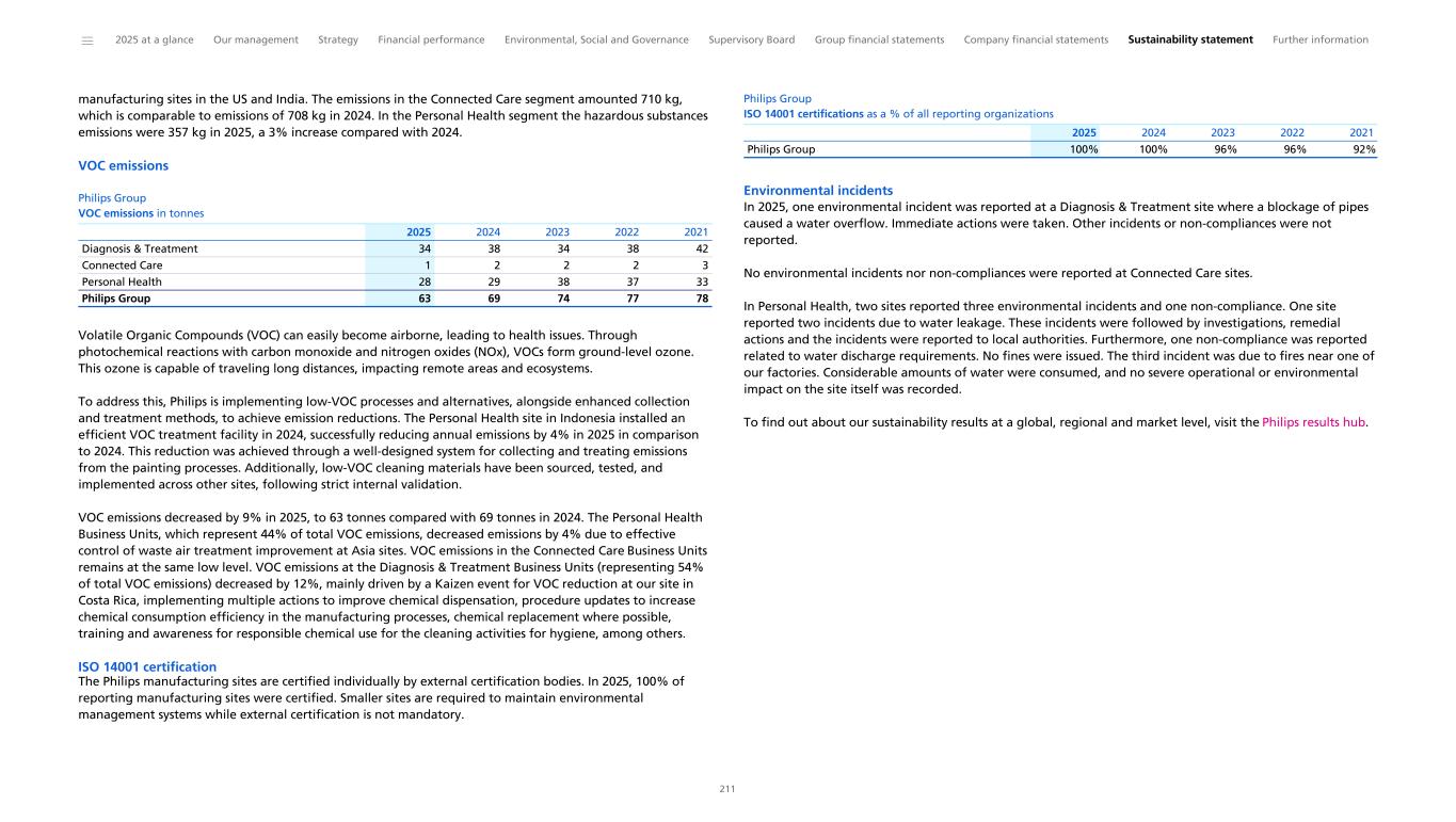 manufacturing sites in the US and India. The emissions in the Connected Care segment amounted 710 kg, which is comparable to emissions of 708 kg in 2024. In the Personal Health segment the hazardous substances emissions were 357 kg in 2025, a 3% increase compared with 2024. VOC emissions Philips Group VOC emissions in tonnes Diagnosis & Treatment 34 38 34 38 42 Connected Care 1 2 2 2 3 Personal Health 28 29 38 37 33 Philips Group 63 69 74 77 78 2025 2024 2023 2022 2021 Volatile Organic Compounds (VOC) can easily become airborne, leading to health issues. Through photochemical reactions with carbon monoxide and nitrogen oxides (NOx), VOCs form ground-level ozone. This ozone is capable of traveling long distances, impacting remote areas and ecosystems. To address this, Philips is implementing low-VOC processes and alternatives, alongside enhanced collection and treatment methods, to achieve emission reductions. The Personal Health site in Indonesia installed an efficient VOC treatment facility in 2024, successfully reducing annual emissions by 4% in 2025 in comparison to 2024. This reduction was achieved through a well-designed system for collecting and treating emissions from the painting processes. Additionally, low-VOC cleaning materials have been sourced, tested, and implemented across other sites, following strict internal validation. VOC emissions decreased by 9% in 2025, to 63 tonnes compared with 69 tonnes in 2024. The Personal Health Business Units, which represent 44% of total VOC emissions, decreased emissions by 4% due to effective control of waste air treatment improvement at Asia sites. VOC emissions in the Connected Care Business Units remains at the same low level. VOC emissions at the Diagnosis & Treatment Business Units (representing 54% of total VOC emissions) decreased by 12%, mainly driven by a Kaizen event for VOC reduction at our site in Costa Rica, implementing multiple actions to improve chemical dispensation, procedure updates to increase chemical consumption efficiency in the manufacturing processes, chemical replacement where possible, training and awareness for responsible chemical use for the cleaning activities for hygiene, among others. ISO 14001 certification The Philips manufacturing sites are certified individually by external certification bodies. In 2025, 100% of reporting manufacturing sites were certified. Smaller sites are required to maintain environmental management systems while external certification is not mandatory. Philips Group ISO 14001 certifications as a % of all reporting organizations Philips Group 100% 100% 96% 96% 92% 2025 2024 2023 2022 2021 Environmental incidents In 2025, one environmental incident was reported at a Diagnosis & Treatment site where a blockage of pipes caused a water overflow. Immediate actions were taken. Other incidents or non-compliances were not reported. No environmental incidents nor non-compliances were reported at Connected Care sites. In Personal Health, two sites reported three environmental incidents and one non-compliance. One site reported two incidents due to water leakage. These incidents were followed by investigations, remedial actions and the incidents were reported to local authorities. Furthermore, one non-compliance was reported related to water discharge requirements. No fines were issued. The third incident was due to fires near one of our factories. Considerable amounts of water were consumed, and no severe operational or environmental impact on the site itself was recorded. To find out about our sustainability results at a global, regional and market level, visit the Philips results hub. ______ 2025 at a glance Our management Strategy Financial performance Environmental, Social and Governance Supervisory Board Group financial statements Company financial statements Sustainability statement Further information 211