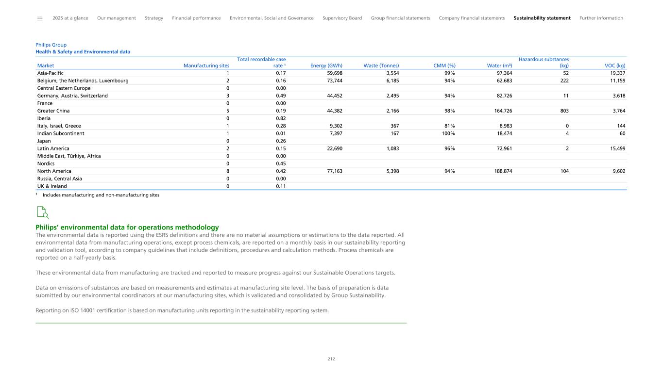 Philips Group Health & Safety and Environmental data Asia-Pacific 1 0.17 59,698 3,554 99% 97,364 52 19,337 Belgium, the Netherlands, Luxembourg 2 0.16 73,744 6,185 94% 62,683 222 11,159 Central Eastern Europe 0 0.00 Germany, Austria, Switzerland 3 0.49 44,452 2,495 94% 82,726 11 3,618 France 0 0.00 Greater China 5 0.19 44,382 2,166 98% 164,726 803 3,764 Iberia 0 0.82 Italy, Israel, Greece 1 0.28 9,302 367 81% 8,983 0 144 Indian Subcontinent 1 0.01 7,397 167 100% 18,474 4 60 Japan 0 0.26 Latin America 2 0.15 22,690 1,083 96% 72,961 2 15,499 Middle East, Türkiye, Africa 0 0.00 Nordics 0 0.45 North America 8 0.42 77,163 5,398 94% 188,874 104 9,602 Russia, Central Asia 0 0.00 UK & Ireland 0 0.11 Market Manufacturing sites Total recordable case rate ¹ Energy (GWh) Waste (Tonnes) CMM (%) Water (m³) Hazardous substances (kg) VOC (kg) 1 Includes manufacturing and non-manufacturing sites Philips’ environmental data for operations methodology The environmental data is reported using the ESRS definitions and there are no material assumptions or estimations to the data reported. All environmental data from manufacturing operations, except process chemicals, are reported on a monthly basis in our sustainability reporting and validation tool, according to company guidelines that include definitions, procedures and calculation methods. Process chemicals are reported on a half-yearly basis. These environmental data from manufacturing are tracked and reported to measure progress against our Sustainable Operations targets. Data on emissions of substances are based on measurements and estimates at manufacturing site level. The basis of preparation is data submitted by our environmental coordinators at our manufacturing sites, which is validated and consolidated by Group Sustainability. Reporting on ISO 14001 certification is based on manufacturing units reporting in the sustainability reporting system. ______ 2025 at a glance Our management Strategy Financial performance Environmental, Social and Governance Supervisory Board Group financial statements Company financial statements Sustainability statement Further information 212