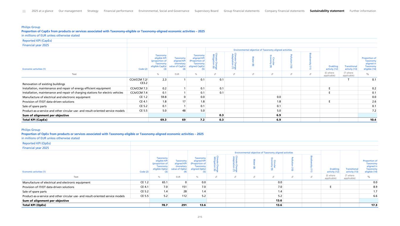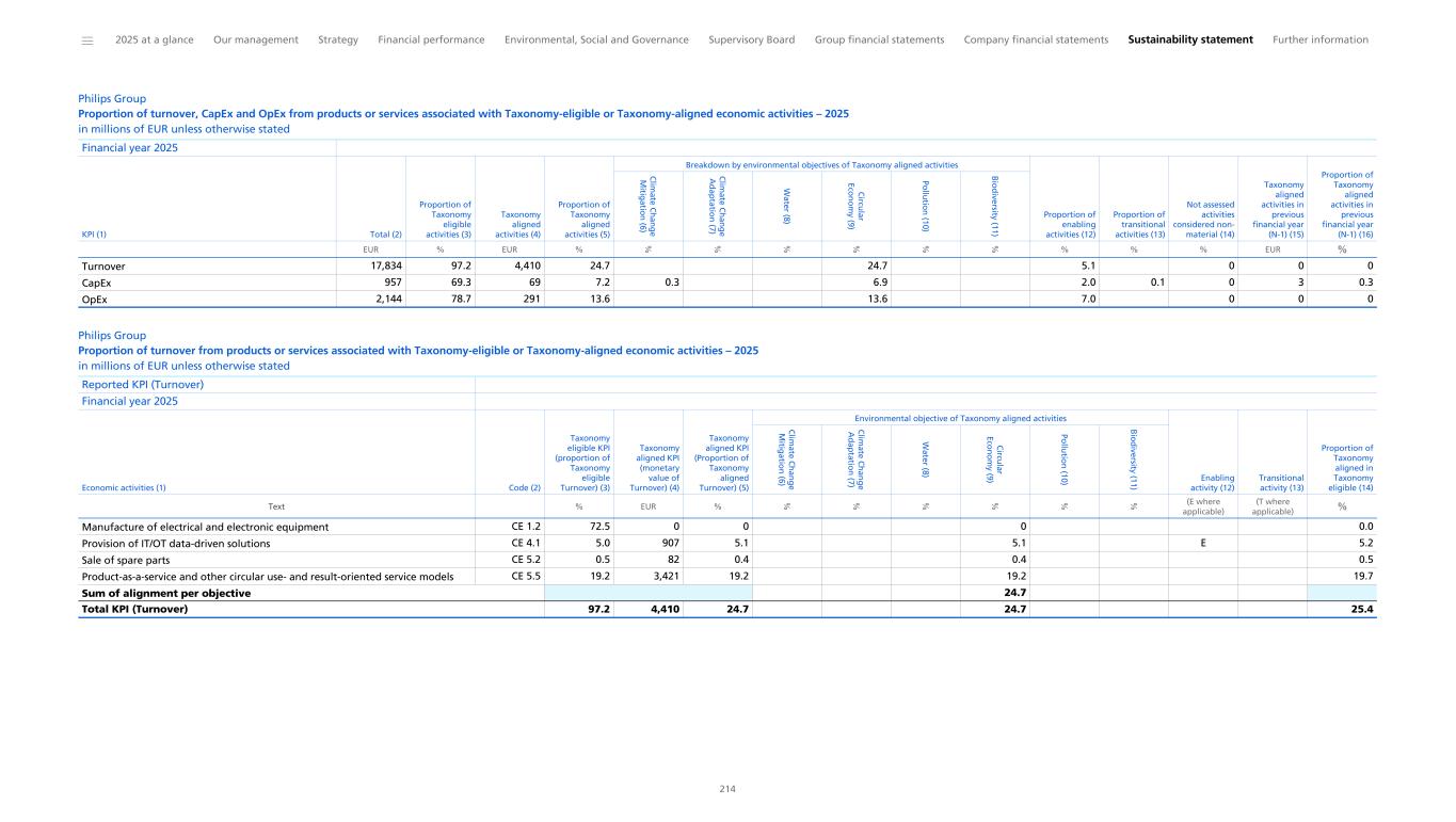 Philips Group Proportion of turnover, CapEx and OpEx from products or services associated with Taxonomy-eligible or Taxonomy-aligned economic activities – 2025 in millions of EUR unless otherwise stated Financial year 2025 KPI (1) Total (2) Proportion of Taxonomy eligible activities (3) Taxonomy aligned activities (4) Proportion of Taxonomy aligned activities (5) Breakdown by environmental objectives of Taxonomy aligned activities Proportion of enabling activities (12) Proportion of transitional activities (13) Not assessed activities considered non- material (14) Taxonomy aligned activities in previous financial year (N-1) (15) Proportion of Taxonomy aligned activities in previous financial year (N-1) (16) C lim ate C h an g e M itig atio n (6) C lim ate C h an g e A d ap tatio n (7) W ater (8) C ircu lar Eco n o m y (9) Po llu tio n (10) B io d iversity (11) EUR % EUR % % % % % % % % % % EUR % Turnover 17,834 97.2 4,410 24.7 24.7 5.1 0 0 0 CapEx 957 69.3 69 7.2 0.3 6.9 2.0 0.1 0 3 0.3 OpEx 2,144 78.7 291 13.6 13.6 7.0 0 0 0 Philips Group Proportion of turnover from products or services associated with Taxonomy-eligible or Taxonomy-aligned economic activities – 2025 in millions of EUR unless otherwise stated Reported KPI (Turnover) Financial year 2025 Economic activities (1) Code (2) Taxonomy eligible KPI (proportion of Taxonomy eligible Turnover) (3) Taxonomy aligned KPI (monetary value of Turnover) (4) Taxonomy aligned KPI (Proportion of Taxonomy aligned Turnover) (5) Environmental objective of Taxonomy aligned activities Enabling activity (12) Transitional activity (13) Proportion of Taxonomy aligned in Taxonomy eligible (14) C lim ate C h an g e M itig atio n (6) C lim ate C h an g e A d ap tatio n (7) W ater (8) C ircu lar Eco n o m y (9) Po llu tio n (10) B io d iversity (11) Text % EUR % % % % % % % (E where applicable) (T where applicable) % Manufacture of electrical and electronic equipment CE 1.2 72.5 0 0 0 0.0 Provision of IT/OT data-driven solutions CE 4.1 5.0 907 5.1 5.1 E 5.2 Sale of spare parts CE 5.2 0.5 82 0.4 0.4 0.5 Product-as-a-service and other circular use- and result-oriented service models CE 5.5 19.2 3,421 19.2 19.2 19.7 Sum of alignment per objective 24.7 Total KPI (Turnover) 97.2 4,410 24.7 24.7 25.4 ______ 2025 at a glance Our management Strategy Financial performance Environmental, Social and Governance Supervisory Board Group financial statements Company financial statements Sustainability statement Further information 214
