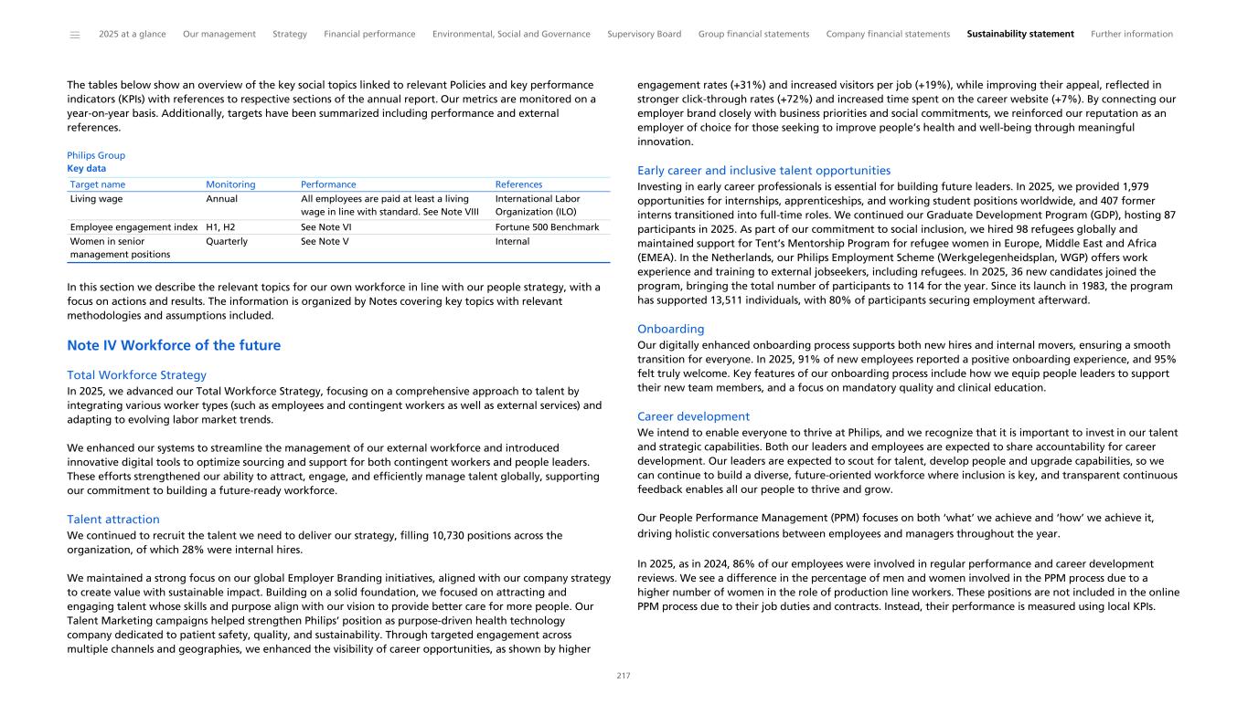 The tables below show an overview of the key social topics linked to relevant Policies and key performance indicators (KPIs) with references to respective sections of the annual report. Our metrics are monitored on a year-on-year basis. Additionally, targets have been summarized including performance and external references. Philips Group Key data Living wage Annual All employees are paid at least a living wage in line with standard. See Note VIII International Labor Organization (ILO) Employee engagement index H1, H2 See Note VI Fortune 500 Benchmark Women in senior management positions Quarterly See Note V Internal Target name Monitoring Performance References In this section we describe the relevant topics for our own workforce in line with our people strategy, with a focus on actions and results. The information is organized by Notes covering key topics with relevant methodologies and assumptions included. Note IV Workforce of the future Total Workforce Strategy In 2025, we advanced our Total Workforce Strategy, focusing on a comprehensive approach to talent by integrating various worker types (such as employees and contingent workers as well as external services) and adapting to evolving labor market trends. We enhanced our systems to streamline the management of our external workforce and introduced innovative digital tools to optimize sourcing and support for both contingent workers and people leaders. These efforts strengthened our ability to attract, engage, and efficiently manage talent globally, supporting our commitment to building a future-ready workforce. Talent attraction We continued to recruit the talent we need to deliver our strategy, filling 10,730 positions across the organization, of which 28% were internal hires. We maintained a strong focus on our global Employer Branding initiatives, aligned with our company strategy to create value with sustainable impact. Building on a solid foundation, we focused on attracting and engaging talent whose skills and purpose align with our vision to provide better care for more people. Our Talent Marketing campaigns helped strengthen Philips’ position as purpose-driven health technology company dedicated to patient safety, quality, and sustainability. Through targeted engagement across multiple channels and geographies, we enhanced the visibility of career opportunities, as shown by higher engagement rates (+31%) and increased visitors per job (+19%), while improving their appeal, reflected in stronger click-through rates (+72%) and increased time spent on the career website (+7%). By connecting our employer brand closely with business priorities and social commitments, we reinforced our reputation as an employer of choice for those seeking to improve people’s health and well-being through meaningful innovation. Early career and inclusive talent opportunities Investing in early career professionals is essential for building future leaders. In 2025, we provided 1,979 opportunities for internships, apprenticeships, and working student positions worldwide, and 407 former interns transitioned into full-time roles. We continued our Graduate Development Program (GDP), hosting 87 participants in 2025. As part of our commitment to social inclusion, we hired 98 refugees globally and maintained support for Tent’s Mentorship Program for refugee women in Europe, Middle East and Africa (EMEA). In the Netherlands, our Philips Employment Scheme (Werkgelegenheidsplan, WGP) offers work experience and training to external jobseekers, including refugees. In 2025, 36 new candidates joined the program, bringing the total number of participants to 114 for the year. Since its launch in 1983, the program has supported 13,511 individuals, with 80% of participants securing employment afterward. Onboarding Our digitally enhanced onboarding process supports both new hires and internal movers, ensuring a smooth transition for everyone. In 2025, 91% of new employees reported a positive onboarding experience, and 95% felt truly welcome. Key features of our onboarding process include how we equip people leaders to support their new team members, and a focus on mandatory quality and clinical education. Career development We intend to enable everyone to thrive at Philips, and we recognize that it is important to invest in our talent and strategic capabilities. Both our leaders and employees are expected to share accountability for career development. Our leaders are expected to scout for talent, develop people and upgrade capabilities, so we can continue to build a diverse, future-oriented workforce where inclusion is key, and transparent continuous feedback enables all our people to thrive and grow. Our People Performance Management (PPM) focuses on both ‘what’ we achieve and ‘how’ we achieve it, driving holistic conversations between employees and managers throughout the year. In 2025, as in 2024, 86% of our employees were involved in regular performance and career development reviews. We see a difference in the percentage of men and women involved in the PPM process due to a higher number of women in the role of production line workers. These positions are not included in the online PPM process due to their job duties and contracts. Instead, their performance is measured using local KPIs. ______ 2025 at a glance Our management Strategy Financial performance Environmental, Social and Governance Supervisory Board Group financial statements Company financial statements Sustainability statement Further information 217