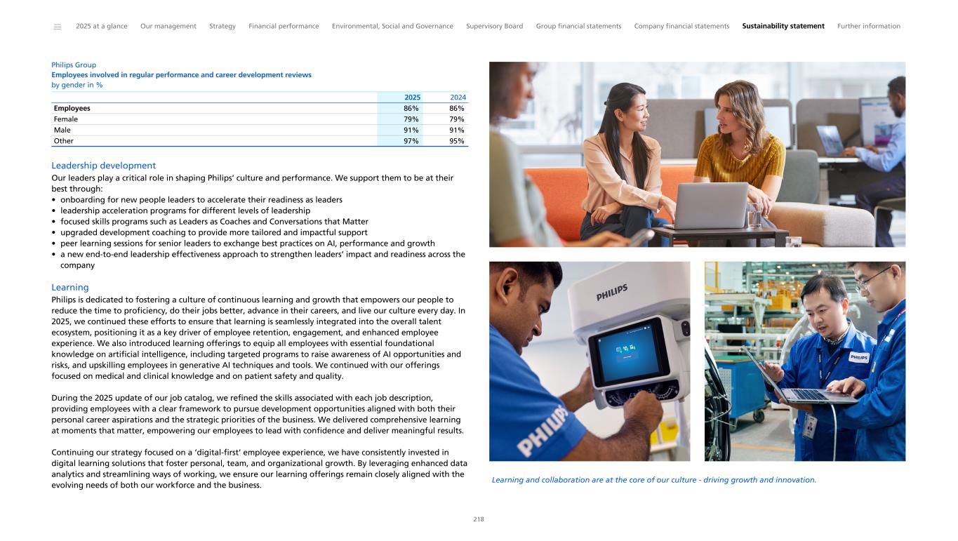 Philips Group Employees involved in regular performance and career development reviews by gender in % Employees 86% 86% Female 79% 79% Male 91% 91% Other 97% 95% 2025 2024 Leadership development Our leaders play a critical role in shaping Philips’ culture and performance. We support them to be at their best through: • onboarding for new people leaders to accelerate their readiness as leaders • leadership acceleration programs for different levels of leadership • focused skills programs such as Leaders as Coaches and Conversations that Matter • upgraded development coaching to provide more tailored and impactful support • peer learning sessions for senior leaders to exchange best practices on AI, performance and growth • a new end-to-end leadership effectiveness approach to strengthen leaders’ impact and readiness across the company Learning Philips is dedicated to fostering a culture of continuous learning and growth that empowers our people to reduce the time to proficiency, do their jobs better, advance in their careers, and live our culture every day. In 2025, we continued these efforts to ensure that learning is seamlessly integrated into the overall talent ecosystem, positioning it as a key driver of employee retention, engagement, and enhanced employee experience. We also introduced learning offerings to equip all employees with essential foundational knowledge on artificial intelligence, including targeted programs to raise awareness of AI opportunities and risks, and upskilling employees in generative AI techniques and tools. We continued with our offerings focused on medical and clinical knowledge and on patient safety and quality. During the 2025 update of our job catalog, we refined the skills associated with each job description, providing employees with a clear framework to pursue development opportunities aligned with both their personal career aspirations and the strategic priorities of the business. We delivered comprehensive learning at moments that matter, empowering our employees to lead with confidence and deliver meaningful results. Continuing our strategy focused on a ‘digital-first’ employee experience, we have consistently invested in digital learning solutions that foster personal, team, and organizational growth. By leveraging enhanced data analytics and streamlining ways of working, we ensure our learning offerings remain closely aligned with the evolving needs of both our workforce and the business. Learning and collaboration are at the core of our culture - driving growth and innovation. ______ 2025 at a glance Our management Strategy Financial performance Environmental, Social and Governance Supervisory Board Group financial statements Company financial statements Sustainability statement Further information 218