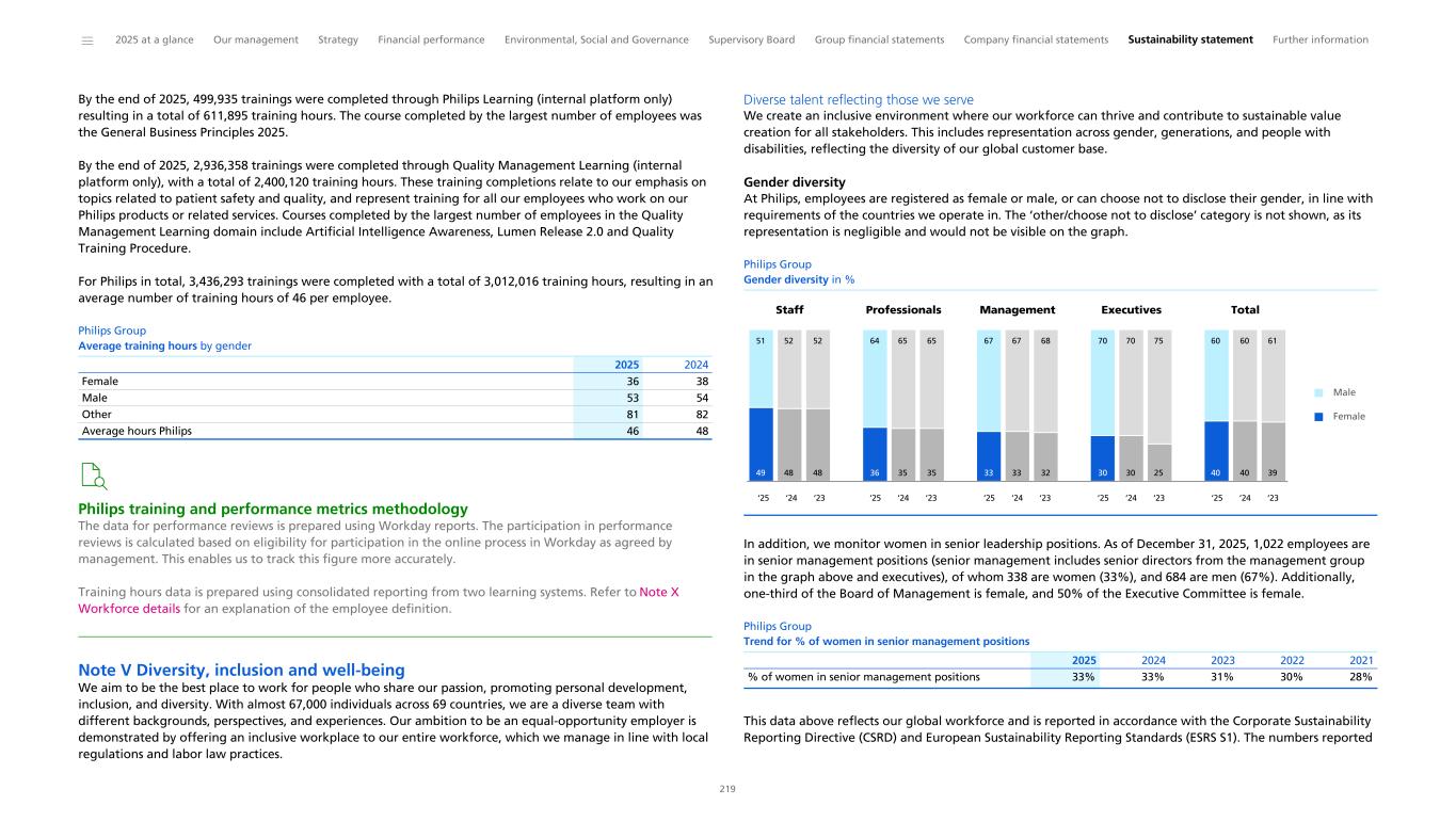 By the end of 2025, 499,935 trainings were completed through Philips Learning (internal platform only) resulting in a total of 611,895 training hours. The course completed by the largest number of employees was the General Business Principles 2025. By the end of 2025, 2,936,358 trainings were completed through Quality Management Learning (internal platform only), with a total of 2,400,120 training hours. These training completions relate to our emphasis on topics related to patient safety and quality, and represent training for all our employees who work on our Philips products or related services. Courses completed by the largest number of employees in the Quality Management Learning domain include Artificial Intelligence Awareness, Lumen Release 2.0 and Quality Training Procedure. For Philips in total, 3,436,293 trainings were completed with a total of 3,012,016 training hours, resulting in an average number of training hours of 46 per employee. Philips Group Average training hours by gender 2025 2024 Female 36 38 Male 53 54 Other 81 82 Average hours Philips 46 48 Philips training and performance metrics methodology The data for performance reviews is prepared using Workday reports. The participation in performance reviews is calculated based on eligibility for participation in the online process in Workday as agreed by management. This enables us to track this figure more accurately. Training hours data is prepared using consolidated reporting from two learning systems. Refer to Note X Workforce details for an explanation of the employee definition. Note V Diversity, inclusion and well-being We aim to be the best place to work for people who share our passion, promoting personal development, inclusion, and diversity. With almost 67,000 individuals across 69 countries, we are a diverse team with different backgrounds, perspectives, and experiences. Our ambition to be an equal-opportunity employer is demonstrated by offering an inclusive workplace to our entire workforce, which we manage in line with local regulations and labor law practices. Diverse talent reflecting those we serve We create an inclusive environment where our workforce can thrive and contribute to sustainable value creation for all stakeholders. This includes representation across gender, generations, and people with disabilities, reflecting the diversity of our global customer base. Gender diversity At Philips, employees are registered as female or male, or can choose not to disclose their gender, in line with requirements of the countries we operate in. The ‘other/choose not to disclose’ category is not shown, as its representation is negligible and would not be visible on the graph. Philips Group Gender diversity in % Staff Professionals Management Executives Total 49 48 48 36 35 35 33 33 32 30 30 25 40 40 39 51 52 52 64 65 65 67 67 68 70 70 75 60 60 61 Male Female ‘25 ‘24 ‘23 ‘25 ‘24 ‘23 ‘25 ‘24 ‘23 ‘25 ‘24 ‘23 ‘25 ‘24 ‘23 In addition, we monitor women in senior leadership positions. As of December 31, 2025, 1,022 employees are in senior management positions (senior management includes senior directors from the management group in the graph above and executives), of whom 338 are women (33%), and 684 are men (67%). Additionally, one-third of the Board of Management is female, and 50% of the Executive Committee is female. Philips Group Trend for % of women in senior management positions % of women in senior management positions 33% 33% 31% 30% 28% 2025 2024 2023 2022 2021 This data above reflects our global workforce and is reported in accordance with the Corporate Sustainability Reporting Directive (CSRD) and European Sustainability Reporting Standards (ESRS S1). The numbers reported ______ 2025 at a glance Our management Strategy Financial performance Environmental, Social and Governance Supervisory Board Group financial statements Company financial statements Sustainability statement Further information 219