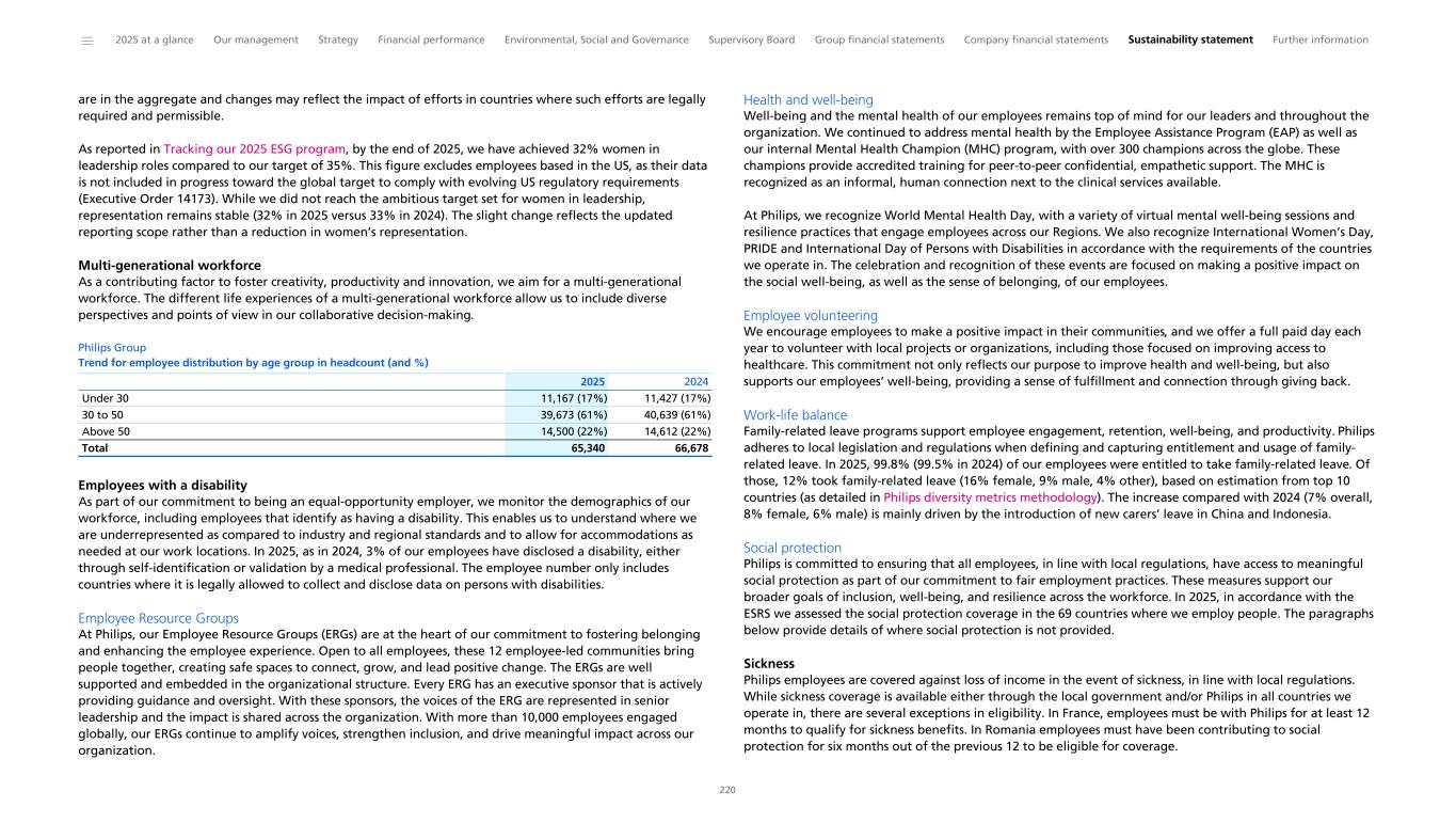 are in the aggregate and changes may reflect the impact of efforts in countries where such efforts are legally required and permissible. As reported in Tracking our 2025 ESG program, by the end of 2025, we have achieved 32% women in leadership roles compared to our target of 35%. This figure excludes employees based in the US, as their data is not included in progress toward the global target to comply with evolving US regulatory requirements (Executive Order 14173). While we did not reach the ambitious target set for women in leadership, representation remains stable (32% in 2025 versus 33% in 2024). The slight change reflects the updated reporting scope rather than a reduction in women’s representation. Multi-generational workforce As a contributing factor to foster creativity, productivity and innovation, we aim for a multi-generational workforce. The different life experiences of a multi-generational workforce allow us to include diverse perspectives and points of view in our collaborative decision-making. Philips Group Trend for employee distribution by age group in headcount (and %) 2025 2024 Under 30 11,167 (17%) 11,427 (17%) 30 to 50 39,673 (61%) 40,639 (61%) Above 50 14,500 (22%) 14,612 (22%) Total 65,340 66,678 Employees with a disability As part of our commitment to being an equal-opportunity employer, we monitor the demographics of our workforce, including employees that identify as having a disability. This enables us to understand where we are underrepresented as compared to industry and regional standards and to allow for accommodations as needed at our work locations. In 2025, as in 2024, 3% of our employees have disclosed a disability, either through self-identification or validation by a medical professional. The employee number only includes countries where it is legally allowed to collect and disclose data on persons with disabilities. Employee Resource Groups At Philips, our Employee Resource Groups (ERGs) are at the heart of our commitment to fostering belonging and enhancing the employee experience. Open to all employees, these 12 employee-led communities bring people together, creating safe spaces to connect, grow, and lead positive change. The ERGs are well supported and embedded in the organizational structure. Every ERG has an executive sponsor that is actively providing guidance and oversight. With these sponsors, the voices of the ERG are represented in senior leadership and the impact is shared across the organization. With more than 10,000 employees engaged globally, our ERGs continue to amplify voices, strengthen inclusion, and drive meaningful impact across our organization. Health and well-being Well-being and the mental health of our employees remains top of mind for our leaders and throughout the organization. We continued to address mental health by the Employee Assistance Program (EAP) as well as our internal Mental Health Champion (MHC) program, with over 300 champions across the globe. These champions provide accredited training for peer-to-peer confidential, empathetic support. The MHC is recognized as an informal, human connection next to the clinical services available. At Philips, we recognize World Mental Health Day, with a variety of virtual mental well-being sessions and resilience practices that engage employees across our Regions. We also recognize International Women’s Day, PRIDE and International Day of Persons with Disabilities in accordance with the requirements of the countries we operate in. The celebration and recognition of these events are focused on making a positive impact on the social well-being, as well as the sense of belonging, of our employees. Employee volunteering We encourage employees to make a positive impact in their communities, and we offer a full paid day each year to volunteer with local projects or organizations, including those focused on improving access to healthcare. This commitment not only reflects our purpose to improve health and well-being, but also supports our employees’ well-being, providing a sense of fulfillment and connection through giving back. Work-life balance Family-related leave programs support employee engagement, retention, well-being, and productivity. Philips adheres to local legislation and regulations when defining and capturing entitlement and usage of family- related leave. In 2025, 99.8% (99.5% in 2024) of our employees were entitled to take family-related leave. Of those, 12% took family-related leave (16% female, 9% male, 4% other), based on estimation from top 10 countries (as detailed in Philips diversity metrics methodology). The increase compared with 2024 (7% overall, 8% female, 6% male) is mainly driven by the introduction of new carers’ leave in China and Indonesia. Social protection Philips is committed to ensuring that all employees, in line with local regulations, have access to meaningful social protection as part of our commitment to fair employment practices. These measures support our broader goals of inclusion, well-being, and resilience across the workforce. In 2025, in accordance with the ESRS we assessed the social protection coverage in the 69 countries where we employ people. The paragraphs below provide details of where social protection is not provided. Sickness Philips employees are covered against loss of income in the event of sickness, in line with local regulations. While sickness coverage is available either through the local government and/or Philips in all countries we operate in, there are several exceptions in eligibility. In France, employees must be with Philips for at least 12 months to qualify for sickness benefits. In Romania employees must have been contributing to social protection for six months out of the previous 12 to be eligible for coverage. ______ 2025 at a glance Our management Strategy Financial performance Environmental, Social and Governance Supervisory Board Group financial statements Company financial statements Sustaina
