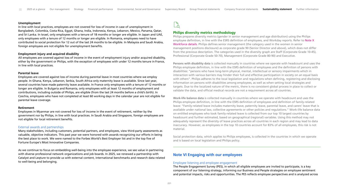 Unemployment In line with local practices, employees are not covered for loss of income in case of unemployment in Bangladesh, Colombia, Costa Rica, Egypt, Ghana, India, Indonesia, Kenya, Lebanon, Mexico, Panama, Qatar, and Sri Lanka. In Israel, only employees with a tenure of 18 months or longer are eligible. In Japan and UAE, only employees with a tenure of 12 months or longer are eligible. In Romania, employees need to have contributed to social protection for 12 out of the last 24 months to be eligible. In Malaysia and Saudi Arabia, foreign employees are not eligible for unemployment benefits. Employment injury and acquired disability All employees are covered against loss of income in the event of employment injury and/or acquired disability, either by the government or Philips, with the exception of employees with under 12 months tenure in France, in line with local practices. Parental leave Employees are covered against loss of income during parental leave in most countries where we employ people. In Ghana, Kenya, Lebanon, Serbia, South Africa only maternity leave is available. Since last year, several countries have made paternity leave available. In France only employees with a tenure of 12 months or longer are eligible. In Bulgaria and Romania, only employees with at least 12 months of employment and contributions, including outside of Philips, are eligible (from the last 24 months before a child's birth). In Czechia, employees who have not completed at least 60 working days in the calendar year are not eligible for parental leave coverage. Retirement Employees in Myanmar are not covered for loss of income in the event of retirement, neither by the government nor by Philips, in line with local practices. In Saudi Arabia and Singapore, foreign employees are not eligible for local retirement benefits. External awards and partnerships Many stakeholders, including customers, potential partners, and employees, view third-party assessments as valuable, objective indicators. This past year we were honored with awards recognizing our efforts in being the best place to work. We were named to the Forbes World’s Best Employer list and in the top five of Fortune Europe's Most Innovative Companies. As we continue to focus on embedding well-being into the employee experience, we see value in partnering with diverse professional network organizations and job boards. In 2025, we renewed a partnership with Catalyst and Leqture to provide us with external content, international benchmarks and research data related to well-being and belonging. Philips diversity metrics methodology Philips prepares diversity metrics (gender in senior management and age distribution) using the Philips employee definition, in line with the ESRS definition of employees, and Workday reports. Refer to Note X Workforce details. Philips defines senior management (the category used in the women in senior management positions disclosure) as corporate grade 90 (Senior Director and above), which does not differ from the previous description. The categories used in the diversity graph are Staff (Corporate Grade 10-45), Professional (Corporate Grade 50-70), Management (Corporate Grade 80-90) and Executive. Persons with disability data is collected manually in countries where we operate with headcount and uses the Philips employee definition, in line with the ESRS definition of employees and the definition of persons with disabilities: “persons who have long-term physical, mental, intellectual or sensory impairments which in interaction with various barriers may hinder their full and effective participation in society on an equal basis with others”. Philips adheres to the local legislation and regulations when defining, registering and disclosing information on persons with disabilities among employees, as well as when setting local strategies and targets. Due to the localized nature of the metric, there is no consistent global process in place to collect or validate the data, and official medical records are not a requirement across all countries. Work-life balance data is collected manually in countries where we operate with headcount and uses the Philips employee definition, in line with the ESRS definition of employees and definition of family-related leave: “Family-related leave includes maternity leave, paternity leave, parental leave, and carers’ leave that is available under national law, collective agreements or other policies and regulations.” Work-life balance data on entitled employees who took family-related leave is collected from our top 10 largest countries by headcount and further estimated, based on geographical (regional) variables. Using this method may not adequately represent the diversity of leave practices across all countries in each region and may lead to data inaccuracy. However, as employees in the top 10 countries account for 83% of all employees, this risk is not material. Social protection data, which applies to Philips employees, is collected in the countries in which we operate and is based on local legislation and Philips policy. Note VI Engaging with our employees Employee listening and employee engagement The People Engagement Survey (PES), in which all eligible employees are invited to participate, is a key component of our listening strategy, informing our Business and People strategies on employee sentiment and potential impacts, risks and opportunities. The PES reflects employee perspectives and is analyzed across ______ 2025 at a glance Our management Strategy Financial performance Environmental, Social and Governance Supervisory Board Group financial statements Company financial statements Sustainability statement Further information 221
