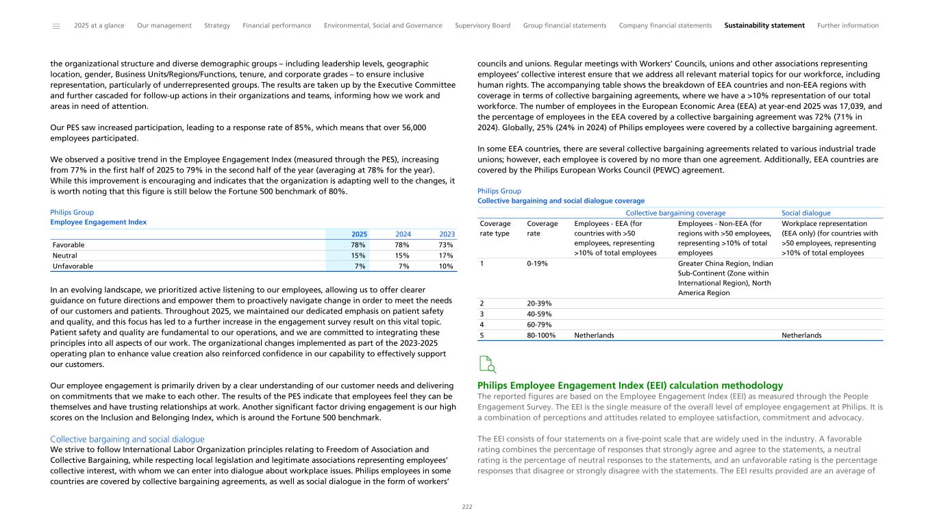 the organizational structure and diverse demographic groups – including leadership levels, geographic location, gender, Business Units/Regions/Functions, tenure, and corporate grades – to ensure inclusive representation, particularly of underrepresented groups. The results are taken up by the Executive Committee and further cascaded for follow-up actions in their organizations and teams, informing how we work and areas in need of attention. Our PES saw increased participation, leading to a response rate of 85%, which means that over 56,000 employees participated. We observed a positive trend in the Employee Engagement Index (measured through the PES), increasing from 77% in the first half of 2025 to 79% in the second half of the year (averaging at 78% for the year). While this improvement is encouraging and indicates that the organization is adapting well to the changes, it is worth noting that this figure is still below the Fortune 500 benchmark of 80%. Philips Group Employee Engagement Index Favorable 78% 78% 73% Neutral 15% 15% 17% Unfavorable 7% 7% 10% 2025 2024 2023 In an evolving landscape, we prioritized active listening to our employees, allowing us to offer clearer guidance on future directions and empower them to proactively navigate change in order to meet the needs of our customers and patients. Throughout 2025, we maintained our dedicated emphasis on patient safety and quality, and this focus has led to a further increase in the engagement survey result on this vital topic. Patient safety and quality are fundamental to our operations, and we are committed to integrating these principles into all aspects of our work. The organizational changes implemented as part of the 2023-2025 operating plan to enhance value creation also reinforced confidence in our capability to effectively support our customers. Our employee engagement is primarily driven by a clear understanding of our customer needs and delivering on commitments that we make to each other. The results of the PES indicate that employees feel they can be themselves and have trusting relationships at work. Another significant factor driving engagement is our high scores on the Inclusion and Belonging Index, which is around the Fortune 500 benchmark. Collective bargaining and social dialogue We strive to follow International Labor Organization principles relating to Freedom of Association and Collective Bargaining, while respecting local legislation and legitimate associations representing employees’ collective interest, with whom we can enter into dialogue about workplace issues. Philips employees in some countries are covered by collective bargaining agreements, as well as social dialogue in the form of workers’ councils and unions. Regular meetings with Workers’ Councils, unions and other associations representing employees’ collective interest ensure that we address all relevant material topics for our workforce, including human rights. The accompanying table shows the breakdown of EEA countries and non-EEA regions with coverage in terms of collective bargaining agreements, where we have a >10% representation of our total workforce. The number of employees in the European Economic Area (EEA) at year-end 2025 was 17,039, and the percentage of employees in the EEA covered by a collective bargaining agreement was 72% (71% in 2024). Globally, 25% (24% in 2024) of Philips employees were covered by a collective bargaining agreement. In some EEA countries, there are several collective bargaining agreements related to various industrial trade unions; however, each employee is covered by no more than one agreement. Additionally, EEA countries are covered by the Philips European Works Council (PEWC) agreement. Philips Group Collective bargaining and social dialogue coverage Coverage rate type Coverage rate Employees - EEA (for countries with >50 employees, representing >10% of total employees Employees - Non-EEA (for regions with >50 employees, representing >10% of total employees Workplace representation (EEA only) (for countries with >50 employees, representing >10% of total employees 1 0-19% Greater China Region, Indian Sub-Continent (Zone within International Region), North America Region 2 20-39% 3 40-59% 4 60-79% 5 80-100% Netherlands Netherlands Collective bargaining coverage Social dialogue Philips Employee Engagement Index (EEI) calculation methodology The reported figures are based on the Employee Engagement Index (EEI) as measured through the People Engagement Survey. The EEI is the single measure of the overall level of employee engagement at Philips. It is a combination of perceptions and attitudes related to employee satisfaction, commitment and advocacy. The EEI consists of four statements on a five-point scale that are widely used in the industry. A favorable rating combines the percentage of responses that strongly agree and agree to the statements, a neutral rating is the percentage of neutral responses to the statements, and an unfavorable rating is the percentage responses that disagree or strongly disagree with the statements. The EEI results provided are an average of ______ 2025 at a glance Our management Strategy Financial performance Environmental, Social and Governance Supervisory Board Group financial statements Company financial statements Sustainability statement Further information 222
