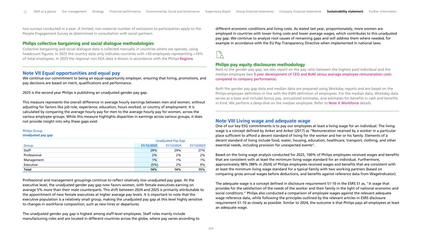 two surveys conducted in a year. A limited, non-material number of exclusions to participation apply to the People Engagement Survey as determined in consultation with social partners. Philips collective bargaining and social dialogue methodologies Collective bargaining and social dialogue data is collected manually in countries where we operate, using headcount figures. In 2025 the country data only indicates countries with >50 employees representing >10% of total employees. In 2025 the regional non-EEA data is shown in accordance with the Philips Regions. Note VII Equal opportunities and equal pay We continue our commitment to being an equal-opportunity employer, ensuring that hiring, promotions, and pay decisions are based on merit, qualifications and performance. 2025 is the second year Philips is publishing an unadjusted gender pay gap. This measure represents the overall difference in average hourly earnings between men and women, without adjusting for factors like job role, experience, education, hours worked, or country of employment. It is calculated by comparing the average hourly pay for men to the average hourly pay for women, across the various employee groups. While this measure highlights disparities in earnings across various groups, it does not provide insight into why these gaps exist. Philips Group Unadjusted pay gap Staff 29% 29% 27% Professional 2% 2% 2% Management 1% 1% 1% Executive (5%) 2% 9% Total 14% 14% 15% Unadjusted Pay Gap Group 31/12/2025 31/12/2024 31/12/2023 Professional and management groupings continue to reflect relatively low unadjusted pay gaps. At the executive level, the unadjusted gender pay gap now favors women, with female executives earning on average 5% more than their male counterparts. This shift between 2024 and 2025 is primarily attributable to the appointment of new female executives at higher average pay levels. It is important to note that the executive population is a relatively small group, making the unadjusted pay gap at this level highly sensitive to changes in workforce composition, such as new hires or departures. The unadjusted gender pay gap is highest among staff-level employees. Staff roles mainly include manufacturing roles and are located in different countries across the globe, where pay varies according to different economic conditions and living costs. As stated last year, proportionately, more women are employed in countries with lower living costs and lower average wages, which contributes to this unadjusted pay gap. We continue to analyze root causes of remaining gaps and will address them where needed, for example in accordance with the EU Pay Transparency Directive when implemented in national laws. Philips pay equity disclosures methodology Next to the gender pay gap, we also report on the pay ratio between the highest paid individual and the median employee (see 5-year development of CEO and BoM versus average employee remuneration costs compared to company performance). Both the gender pay gap data and median data are prepared using Workday reports and are based on the Philips employee definition in line with the ESRS definition of employees. For the median data, Workday data serves as a base and includes bonus pay, annualized estimates, and estimates for benefits in cash and benefits in kind. We perform a deep-dive on the median employee. Refer to Note X Workforce details. Note VIII Living wage and adequate wage One of our key ESG commitments is to pay our employees at least a living wage for an individual. The living wage is a concept defined by Anker and Anker (2017) as “Remuneration received by a worker in a particular place sufficient to afford a decent standard of living for the worker and her or his family. Elements of a decent standard of living include food, water, housing, education, healthcare, transport, clothing, and other essential needs, including provision for unexpected events”. Based on the living wage analysis conducted for 2025, 100% of Philips employees received wages and benefits that are consistent with at least the minimum living wage standard for an individual. Furthermore, approximately 98% (98% in 2024) of Philips employees received wages and benefits that are consistent with at least the minimum living wage standard for a typical family with two working partners (based on comparing gross annual wages before deductions, and benefits against reference data from WageIndicator). The adequate wage is a concept defined in disclosure requirement S1-10 in the ESRS S1 as, “A wage that provides for the satisfaction of the needs of the worker and their family in the light of national economic and social conditions.” Philips also conducted a comparison of employee wages against the relevant adequate wage reference data, while following the principles outlined by the relevant articles in ESRS disclosure requirement S1-10 as closely as possible. Similar to 2024, the outcome is that Philips pays all employees at least an adequate wage. ______ 2025 at a glance Our management Strategy Financial performance Environmental, Social and Governance Supervisory Board Group financial statements Company financial statements Sustainability statement Further information 223