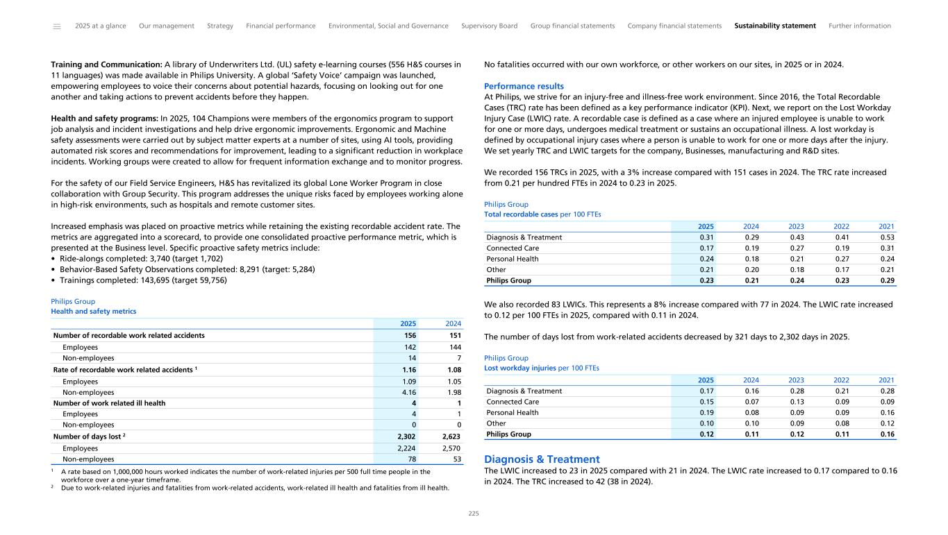 Training and Communication: A library of Underwriters Ltd. (UL) safety e-learning courses (556 H&S courses in 11 languages) was made available in Philips University. A global ‘Safety Voice’ campaign was launched, empowering employees to voice their concerns about potential hazards, focusing on looking out for one another and taking actions to prevent accidents before they happen. Health and safety programs: In 2025, 104 Champions were members of the ergonomics program to support job analysis and incident investigations and help drive ergonomic improvements. Ergonomic and Machine safety assessments were carried out by subject matter experts at a number of sites, using AI tools, providing automated risk scores and recommendations for improvement, leading to a significant reduction in workplace incidents. Working groups were created to allow for frequent information exchange and to monitor progress. For the safety of our Field Service Engineers, H&S has revitalized its global Lone Worker Program in close collaboration with Group Security. This program addresses the unique risks faced by employees working alone in high-risk environments, such as hospitals and remote customer sites. Increased emphasis was placed on proactive metrics while retaining the existing recordable accident rate. The metrics are aggregated into a scorecard, to provide one consolidated proactive performance metric, which is presented at the Business level. Specific proactive safety metrics include: • Ride-alongs completed: 3,740 (target 1,702) • Behavior-Based Safety Observations completed: 8,291 (target: 5,284) • Trainings completed: 143,695 (target 59,756) Philips Group Health and safety metrics Number of recordable work related accidents 156 151 Employees 142 144 Non-employees 14 7 Rate of recordable work related accidents 1 1.16 1.08 Employees 1.09 1.05 Non-employees 4.16 1.98 Number of work related ill health 4 1 Employees 4 1 Non-employees 0 0 Number of days lost 2 2,302 2,623 Employees 2,224 2,570 Non-employees 78 53 2025 2024 1 A rate based on 1,000,000 hours worked indicates the number of work-related injuries per 500 full time people in the workforce over a one-year timeframe. 2 Due to work-related injuries and fatalities from work-related accidents, work-related ill health and fatalities from ill health. No fatalities occurred with our own workforce, or other workers on our sites, in 2025 or in 2024. Performance results At Philips, we strive for an injury-free and illness-free work environment. Since 2016, the Total Recordable Cases (TRC) rate has been defined as a key performance indicator (KPI). Next, we report on the Lost Workday Injury Case (LWIC) rate. A recordable case is defined as a case where an injured employee is unable to work for one or more days, undergoes medical treatment or sustains an occupational illness. A lost workday is defined by occupational injury cases where a person is unable to work for one or more days after the injury. We set yearly TRC and LWIC targets for the company, Businesses, manufacturing and R&D sites. We recorded 156 TRCs in 2025, with a 3% increase compared with 151 cases in 2024. The TRC rate increased from 0.21 per hundred FTEs in 2024 to 0.23 in 2025. Philips Group Total recordable cases per 100 FTEs Diagnosis & Treatment 0.31 0.29 0.43 0.41 0.53 Connected Care 0.17 0.19 0.27 0.19 0.31 Personal Health 0.24 0.18 0.21 0.27 0.24 Other 0.21 0.20 0.18 0.17 0.21 Philips Group 0.23 0.21 0.24 0.23 0.29 2025 2024 2023 2022 2021 We also recorded 83 LWICs. This represents a 8% increase compared with 77 in 2024. The LWIC rate increased to 0.12 per 100 FTEs in 2025, compared with 0.11 in 2024. The number of days lost from work-related accidents decreased by 321 days to 2,302 days in 2025. Philips Group Lost workday injuries per 100 FTEs Diagnosis & Treatment 0.17 0.16 0.28 0.21 0.28 Connected Care 0.15 0.07 0.13 0.09 0.09 Personal Health 0.19 0.08 0.09 0.09 0.16 Other 0.10 0.10 0.09 0.08 0.12 Philips Group 0.12 0.11 0.12 0.11 0.16 2025 2024 2023 2022 2021 Diagnosis & Treatment The LWIC increased to 23 in 2025 compared with 21 in 2024. The LWIC rate increased to 0.17 compared to 0.16 in 2024. The TRC increased to 42 (38 in 2024). ______ 2025 at a glance Our management Strategy Financial performance Environmental, Social and Governance Supervisory Board Group financial statements Company financial statements Sustainability statement Further information 225
