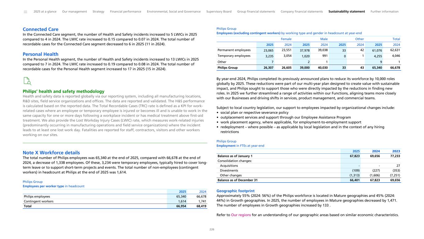 Connected Care In the Connected Care segment, the number of Health and Safety incidents increased to 5 LWICs in 2025 compared to 4 in 2024. The LWIC rate increased to 0.15 compared to 0.07 in 2024. The total number of recordable cases for the Connected Care segment decreased to 6 in 2025 (11 in 2024). Personal Health In the Personal Health segment, the number of Health and Safety incidents increased to 13 LWICs in 2025 compared to 7 in 2024. The LWIC rate increased to 0.19 compared to 0.08 in 2024. The total number of recordable cases for the Personal Health segment increased to 17 in 2025 (15 in 2024). Philips’ health and safety methodology Health and safety data is reported globally via our reporting system, including all manufacturing locations, R&D sites, field service organizations and offices. The data are reported and validated. The H&S performance is calculated based on the reported data. The Total Recordable Cases (TRC) rate is defined as a KPI for work- related cases where an employee or temporary employee is injured or becomes ill and is unable to work in the same capacity for one or more days following a workplace incident or has medical treatment above first-aid treatment. We also provide the Lost Workday Injury Cases (LWIC) rate, which measures work-related injuries (predominantly occurring in manufacturing operations and field service organizations) where the incident leads to at least one lost work day. Fatalities are reported for staff, contractors, visitors and other workers working on our sites. Note X Workforce details The total number of Philips employees was 65,340 at the end of 2025, compared with 66,678 at the end of 2024, a decrease of 1,338 employees. Of these, 3,234 were temporary employees, typically hired to cover long- term leave or to support short-term projects and events. The total number of non-employees (contingent workers) in headcount at Philips at the end of 2025 was 1,614. Philips Group Employees per worker type in headcount Philips employees 65,340 66,678 Contingent workers 1,614 1,741 Total 66,954 68,419 2025 2024 Philips Group Employees (excluding contingent workers) by working type and gender in headcount at year-end 2025 2024 2025 2024 2025 2024 2025 2024 Permanent employees 23,065 23,551 37,978 39,038 33 42 61,076 62,631 Temporary employees 3,235 3,054 1,020 991 0 1 4,255 4,046 Other 7 2 1 9 1 Philips Group 26,307 26,605 39,000 40,030 33 43 65,340 66,678 Female Male Other Total By year-end 2024, Philips completed its previously announced plans to reduce its workforce by 10,000 roles globally by 2025. These reductions were part of our multi-year plan designed to create value with sustainable impact, and Philips sought to support those who were directly impacted by the reductions in finding new roles. In 2025 we further streamlined a range of activities within our Functions, aligning teams more closely with our Businesses and driving shifts in services, product management, and commercial teams. Subject to local country legislation, our support to employees impacted by organizational changes include: • social plan or respective severance policy • outplacement services and support through our Employee Assistance Program • work placement agency, where applicable, for employment-to-employment support • redeployment – where possible – as applicable by local legislation and in the context of any hiring restrictions Philips Group Employment in FTEs at year-end Balance as of January 1 67,823 69,656 77,233 Consolidation changes: Acquisitions - - 27 Divestments (109) (227) (353) Other changes (1,313) (1,606) (7,251) Balance as of December 31 66,401 67,823 69,656 2025 2024 2023 Geographic footprint Approximately 55% (2024: 56%) of the Philips workforce is located in Mature geographies and 45% (2024: 44%) in Growth geographies. In 2025, the number of employees in Mature geographies decreased by 1,471. The number of employees in Growth geographies increased by 133 . Refer to Our regions for an understanding of our geographic areas based on similar economic characteristics. ______ 2025 at a glance Our management Strategy Financial performance Environmental, Social and Governance Supervisory Board Group financial statements Company financial statements Sustainability statement Further information 226