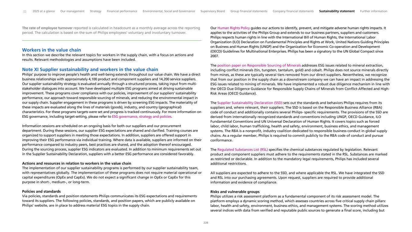 The rate of employee turnover reported is calculated in headcount as a monthly average across the reporting period. The calculation is based on the sum of Philips employees’ voluntary and involuntary turnover. Workers in the value chain In this section we describe the relevant topics for workers in the supply chain, with a focus on actions and results. Relevant methodologies and assumptions have been included. Note XI Supplier sustainability and workers in the value chain Philips’ purpose to improve people’s health and well-being extends throughout our value chain. We have a direct business relationships with approximately 4,100 product and component suppliers and 14,200 service suppliers. Our supplier sustainability strategy is evaluated annually through a structured process, taking input from multi- stakeholder dialogues into account. We have developed multiple ESG programs aimed at driving sustainable improvement. These programs cover compliance with our policies, improvement of our suppliers’ sustainability performance, our approach toward responsible sourcing of minerals, and reducing the environmental impact in our supply chain. Supplier engagement in these programs is driven by screening ESG impacts. The materiality of these impacts are evaluated along the lines of materials (goods), industry, and country (geographical) characteristics. For these programs targets were set and progress is tracked continuously. For more information on ESG governance, including target-setting, please refer to ESG governance, strategy and policies. Information sessions are scheduled on an ongoing basis for both our suppliers and our procurement department. During these sessions, our supplier ESG expectations are shared and clarified. Training courses are organized to support suppliers in meeting those expectations. In addition, suppliers are offered support in improving their ESG performance via individual training. Where data is available, suppliers are informed on their performance compared to industry peers, best practices are shared, and the adoption thereof encouraged. During the sourcing process, supplier ESG indicators are evaluated. In addition to minimum requirements set out in the Supplier Sustainability Declaration, suppliers with a better ESG performance are considered favorably. Actions and resources in relation to workers in the value chain The implementation of our supplier sustainability programs is performed by our supplier sustainability team, with representatives globally. The implementation of these programs does not require material operational or capital expenditures (OpEx and CapEx). We do not expect a significant change in OpEx or CapEx for this purpose in short-, medium-, or long-term. Policies and standards Via policies, standards and position statements Philips communicates its ESG expectations and requirements toward its suppliers. The following policies, standards, and position papers, which are publicly available on Philips’ website, are in place to address material ESG topics in the supply chain. Our Human Rights Policy guides our actions to identify, prevent, and mitigate adverse human rights impacts. It applies to the activities of the Philips Group and extends to our business partners, suppliers and customers. Philips respects human rights in line with the International Bill of Human Rights, the International Labor Organization (ILO) Declaration on Fundamental Principles and Rights at Work, United Nations Guiding Principles on Business and Human Rights (UNGP) and the Organization for Economic Co-operation and Development (OECD) Guidelines for Multinational Enterprises. Philips has been a signatory to the UN Global Compact since 2007. The position paper on Responsible Sourcing of Minerals addresses ESG issues related to mineral extraction, including conflict minerals (tin, tungsten, tantalum, gold) and cobalt. Philips does not source minerals directly from mines, as these are typically several tiers removed from our direct suppliers. Nevertheless, we recognize that from our position in the supply chain as a downstream company we can have an impact in addressing the ESG issues related to mining of minerals. We have implemented a robust due diligence mechanism in line with the OECD Due Diligence Guidance for Responsible Supply Chains of Minerals from Conflict-Affected and High- Risk Areas (OECD Guidance). The Supplier Sustainability Declaration (SSD) sets out the standards and behaviors Philips requires from its suppliers and, where relevant, their suppliers. The SSD is based on the Responsible Business Alliance (RBA) code of conduct and additionally contains several Philips- specific requirements. The provisions of the SSD are derived from internationally recognized standards and conventions including UNGP, OECD Guidance, ILO Fundamental Conventions and UN Universal Declaration of Human Rights. It covers topics such as forced labor, child labor, human trafficking, health and safety, environment, business ethics, and management systems. The RBA is a nonprofit, industry coalition dedicated to responsible business conduct in global supply chains. As a regular member, Philips is required to commit publicly to the RBA code of conduct and pursue conformance. The Regulated Substances List (RSL) specifies the chemical substances regulated by legislation. Relevant product and component suppliers must adhere to the requirements stated in the RSL. Substances are marked as restricted or declarable. In addition to the mandatory legal requirements, Philips has included several additional restrictions. All suppliers are expected to adhere to the SSD, and where applicable the RSL. We have integrated the SSD and RSL into our purchasing agreements. Upon request, suppliers are required to provide additional information and evidence of compliance. Risks and vulnerable groups Philips utilizes a risk assessment platform as a fundamental component of its risk assessment model. The p