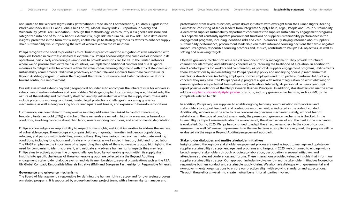 not limited to the Workers Rights Index (International Trade Union Confederation), Children’s Rights in the Workplace Index (UNICEF and Global Child Forum), Global Slavery Index - Proportion in Slavery and Vulnerability (Walk Free Foundation). Through this methodology, each country is assigned a risk score and categorized into one of four risk bands: extreme risk, high risk, medium risk, or low risk. These data-driven insights, presented in the form of risk maps, enable Philips to strategically focus its efforts to enhance supply chain sustainability while improving the lives of workers within the value chain. Philips recognizes the need to prioritize ethical business practices and the mitigation of risks associated with suppliers located in countries classified as extreme risk. Philips acknowledges the complexities inherent in its operations, particularly concerning its ambitions to provide access to care for all. In the limited instances where we do procure from extreme risk countries, we implement additional controls and due diligence measures to mitigate risks for workers within the value chain, ensuring alignment with ethical standards and sustainability commitments. Philips has proactively enrolled relevant suppliers from these countries in its Beyond Auditing program to assess them against the frame of reference and foster collaborative efforts toward continuous improvement. Our risk assessment extends beyond geographical boundaries to encompass the inherent risks for workers in value chain in certain industries and commodities. While geographic location may play a significant role, the nature of the industry and commodity itself can amplify vulnerabilities within the supply chain. These risks include precarious working conditions, limited legal protections, challenges in accessing grievance mechanisms, as well as long working hours, inadequate rest breaks, and exposure to hazardous conditions. Furthermore, our commitment to responsible sourcing addresses risks linked to conflict minerals (tin, tungsten, tantalum, gold [3TG]) and cobalt. These minerals are mined in high-risk areas under hazardous conditions, involving concerns about child labor, unsafe working conditions, and environmental degradation. Philips acknowledges our responsibility to respect human rights, making it imperative to address the welfare of vulnerable groups. These groups encompass children, migrants, minorities, indigenous populations, refugees, and persons with disabilities, among others. They face various risks, such as inadequate working conditions, including long hours and unsafe environments, as well as discrimination, child and forced labor. The UNGP emphasize the importance of safeguarding the rights of these vulnerable groups, highlighting the need for companies to identify, prevent, and mitigate any adverse human rights impacts they may face. Philips aims to actively address the unique challenges faced by vulnerable groups within its supply chain. Insights into specific challenges of these vulnerable groups are collected via the Beyond Auditing engagement, stakeholder dialogue events, and via its memberships to several organizations such as the RBA, UN Global Compact, Responsible Minerals Initiative (RMI) and European Partnership for Responsible Minerals. Governance and grievance mechanisms The Board of Management is responsible for defining the human rights strategy and for overseeing progress on related programs. It is supported by a cross-functional project team, with a human rights manager and professionals from several functions, which drives initiatives with oversight from the Human Rights Steering Committee, consisting of senior leaders from Integrated Supply Chain, Legal, People and Group Sustainability. A dedicated supplier sustainability department coordinates the supplier sustainability engagement programs. This department constantly updates procurement functions on suppliers’ sustainability performance in the engagement programs, including identified risks and Zero Tolerances. By staying informed about suppliers’ sustainability performance, procurement leadership can make informed sourcing decisions that avoid negative impact, strengthen responsible sourcing practices and, as such, contribute to Philips’ ESG objectives, as well as setting and reviewing targets. Effective grievance mechanisms are a critical component of risk management. They provide structured channels for identifying and addressing concerns early, reducing the likelihood of escalation. In addition to direct contact points for workers and communities, as part of its supplier engagement programs, Philips meets these expectations by implementing the Philips SpeakUp policy and underlying SpeakUp mechanism that enables its stakeholders (including employees, former employees and third parties) to inform Philips of any concerns they may have. The Philips SpeakUp program aligns with relevant legislation on whistleblowing to ensure reporters are protected from (attempted) retaliation. Internally, its personnel can (anonymously) report possible violations of the Philips General Business Principles. In addition, stakeholders can use the email address supplier.sustainability@philips.com or existing industry grievance mechanisms, such as RMI, to file complaints related to 3TG. In addition, Philips requires suppliers to enable ongoing two-way communication with workers and stakeholders to support feedback and continuous improvement, as indicated in the code of conduct. Additionally, workers must be able to raise concerns via grievance mechanisms safely, without fear of retaliation. In the code of conduct assessments, the presence of grievance mechanisms is checked. In the Human Rights Impact assessments also the awareness of, the effectiveness of and the trust in the mechanism is evaluated. During 2025, Philips has continued to adapt the effectiveness check to the code of conduct assessment as well. Whenever improvements in th