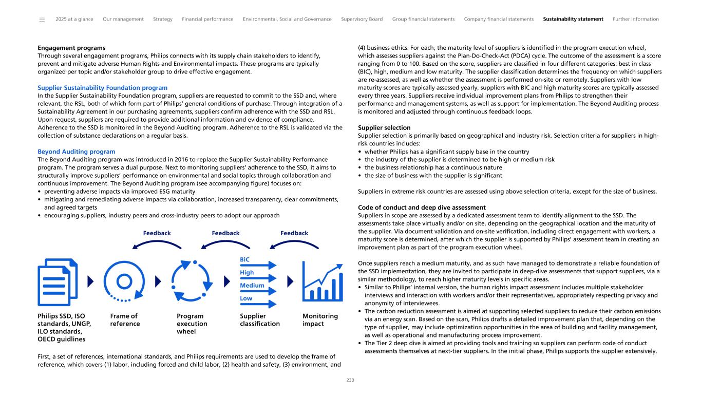 Engagement programs Through several engagement programs, Philips connects with its supply chain stakeholders to identify, prevent and mitigate adverse Human Rights and Environmental impacts. These programs are typically organized per topic and/or stakeholder group to drive effective engagement. Supplier Sustainability Foundation program In the Supplier Sustainability Foundation program, suppliers are requested to commit to the SSD and, where relevant, the RSL, both of which form part of Philips’ general conditions of purchase. Through integration of a Sustainability Agreement in our purchasing agreements, suppliers confirm adherence with the SSD and RSL. Upon request, suppliers are required to provide additional information and evidence of compliance. Adherence to the SSD is monitored in the Beyond Auditing program. Adherence to the RSL is validated via the collection of substance declarations on a regular basis. Beyond Auditing program The Beyond Auditing program was introduced in 2016 to replace the Supplier Sustainability Performance program. The program serves a dual purpose. Next to monitoring suppliers’ adherence to the SSD, it aims to structurally improve suppliers’ performance on environmental and social topics through collaboration and continuous improvement. The Beyond Auditing program (see accompanying figure) focuses on: • preventing adverse impacts via improved ESG maturity • mitigating and remediating adverse impacts via collaboration, increased transparency, clear commitments, and agreed targets • encouraging suppliers, industry peers and cross-industry peers to adopt our approach First, a set of references, international standards, and Philips requirements are used to develop the frame of reference, which covers (1) labor, including forced and child labor, (2) health and safety, (3) environment, and (4) business ethics. For each, the maturity level of suppliers is identified in the program execution wheel, which assesses suppliers against the Plan-Do-Check-Act (PDCA) cycle. The outcome of the assessment is a score ranging from 0 to 100. Based on the score, suppliers are classified in four different categories: best in class (BIC), high, medium and low maturity. The supplier classification determines the frequency on which suppliers are re-assessed, as well as whether the assessment is performed on-site or remotely. Suppliers with low maturity scores are typically assessed yearly, suppliers with BIC and high maturity scores are typically assessed every three years. Suppliers receive individual improvement plans from Philips to strengthen their performance and management systems, as well as support for implementation. The Beyond Auditing process is monitored and adjusted through continuous feedback loops. Supplier selection Supplier selection is primarily based on geographical and industry risk. Selection criteria for suppliers in high- risk countries includes: • whether Philips has a significant supply base in the country • the industry of the supplier is determined to be high or medium risk • the business relationship has a continuous nature • the size of business with the supplier is significant Suppliers in extreme risk countries are assessed using above selection criteria, except for the size of business. Code of conduct and deep dive assessment Suppliers in scope are assessed by a dedicated assessment team to identify alignment to the SSD. The assessments take place virtually and/or on site, depending on the geographical location and the maturity of the supplier. Via document validation and on-site verification, including direct engagement with workers, a maturity score is determined, after which the supplier is supported by Philips’ assessment team in creating an improvement plan as part of the program execution wheel. Once suppliers reach a medium maturity, and as such have managed to demonstrate a reliable foundation of the SSD implementation, they are invited to participate in deep-dive assessments that support suppliers, via a similar methodology, to reach higher maturity levels in specific areas. • Similar to Philips’ internal version, the human rights impact assessment includes multiple stakeholder interviews and interaction with workers and/or their representatives, appropriately respecting privacy and anonymity of interviewees. • The carbon reduction assessment is aimed at supporting selected suppliers to reduce their carbon emissions via an energy scan. Based on the scan, Philips drafts a detailed improvement plan that, depending on the type of supplier, may include optimization opportunities in the area of building and facility management, as well as operational and manufacturing process improvement. • The Tier 2 deep dive is aimed at providing tools and training so suppliers can perform code of conduct assessments themselves at next-tier suppliers. In the initial phase, Philips supports the supplier extensively. ______ 2025 at a glance Our management Strategy Financial performance Environmental, Social and Governance Supervisory Board Group financial statements Company financial statements Sustainability statement Further information 230