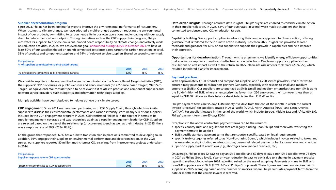 Supplier decarbonization program Since 2003, Philips has been looking for ways to improve the environmental performance of its suppliers. When it comes to climate change, we have adopted a multi-pronged approach: reducing the environmental impact of our products, committing to carbon neutrality in our own operations, and engaging with our supply chain to reduce their carbon footprint. Through initiatives such as the CDP supply chain program, Philips motivates its suppliers to disclose emissions, embed board responsibility on climate change, and actively work on reduction activities. In 2025, we achieved our goal, announced during COP26 in October 2021, to have at least 50% of our suppliers (based on spend) committed to science-based targets for carbon reduction. In total, 38% of product and component suppliers and 74% of relevant service suppliers (based on spend) committed. Philips Group % of suppliers committed to science-based targets 2025 2024 2023 % of suppliers committed to Science Based Targets 52% 48% 46% We consider suppliers to have committed when communicated via the Science Based Targets initiative (SBTi), the suppliers’ CDP disclosures, or public websites and announcements (on a ’Science Based Target’, ’Net Zero Target’, or equivalent). We consider spend to be relevant if it relates to product and component suppliers and relevant service providers, such as logistics and information technology suppliers. Multiple activities have been deployed to help us achieve this climate target. CDP engagement: Since 2011 we have been partnering with CDP Supply Chain, through which we invite suppliers to disclose their environmental performance and carbon intensity. With nearly 500 of our suppliers included in the CDP engagement program in 2025, CDP confirmed Philips is in the top tier in terms of its supplier engagement coverage and was recognized again as a supplier engagement leader by CDP. Suppliers are selected based on the size of the relationship (procurement spend) as well as their industry. In 2025, there was a response rate of 90% (2024: 88%). Of the group that responded, 69% has a climate transition plan in place or is committed to developing so. In addition, 39% engages their suppliers on environmental performance and decarbonization. In the 2025 survey, our suppliers reported 80 million metric tonnes CO2-e savings from improvement projects undertaken in 2024. Philips Group Supplier response rate to CDP questionnaire 2025 2024 2023 Supplier response rate to CDP questionnaire 90% 88% 93% Data-driven insights: Through accurate data insights, Philips’ buyers are enabled to consider climate action in their supplier selection. In 2025, 52% of our purchases (in spend) were made at suppliers that have committed to science-based CO2-e reduction targets. Capability building: We support suppliers in advancing their company approach to climate action, offering guidance that is tailored to their climate action maturity. Based on 2025 insights, we provided tailored feedback and guidance for 68% of our suppliers to support their growth in capabilities and help improve their approach. Opportunities for decarbonization: Through on-site assessments we identify energy efficiency opportunities that enable our suppliers to make cost-effective carbon reductions. Our team supports suppliers in their calculations on cost impact as well as the return. In 2025, 20 on-site assessments took place (2024: 22), which resulted in tailored plans for improvement. Payment practices With approximately 4,100 product and component suppliers and 14,200 service providers, Philips strives to ensure timely payments to its business partners (vendors), especially with respect to small and medium enterprises (SMEs). Our suppliers are categorized as SMEs (small and medium enterprises) and non-SMEs using the EU definition of SME, where an enterprise has fewer than 250 employees, their turnover is less than or equal to EUR 50 million, or their balance sheet total is less than EUR 43 million. Philips’ payment terms are 95 days EOM (ninety-five days from the end of the month in which the correct invoice is received) for suppliers located in Asia Pacific (APAC), North America (NAM) and Latin America (LATAM). For suppliers located in the rest of the world, which include Europe, Middle East and Africa (EMEA), Philips’ payment terms are 65 days EOM. Exceptions to the above contractual payment terms can be the result of: • specific country rules and regulations that are legally binding upon Philips and therewith restricting the payment terms to be applied • SME-specific standard payment terms that are country specific, based on legal requirements • specific (sub-)categories referred to as ‘Non-Purchasing Spend’, which includes invoices related to taxes, and sales-related costs, including rebates, customs, personnel related payments, banks, donations, and charities • Specific supply market conditions (e.g., shortages, local market practices, etc.) On average, Philips takes 52 days to pay an SME supplier and 62 days to pay a non-SME supplier (was 78 days in 2024 at Philips Group level). Year-on-year reduction in days to pay is due to a change in payment practice reporting methodology, where 2024 reporting relied on the use of sampling. Payments on-time to SME and non-SME suppliers are at 92% (2024: 96% at Philips Group level). These figures are based on invoices paid to suppliers in 2025 averaging based on the number of invoices, where Philips calculates payment terms from the date or month that the correct invoice is received. ______ 2025 at a glance Our management Strategy Financial performance Environmental, Social and Governance Supervisory Board Group financial statements Company financial statements Sustainability statement Further information 233