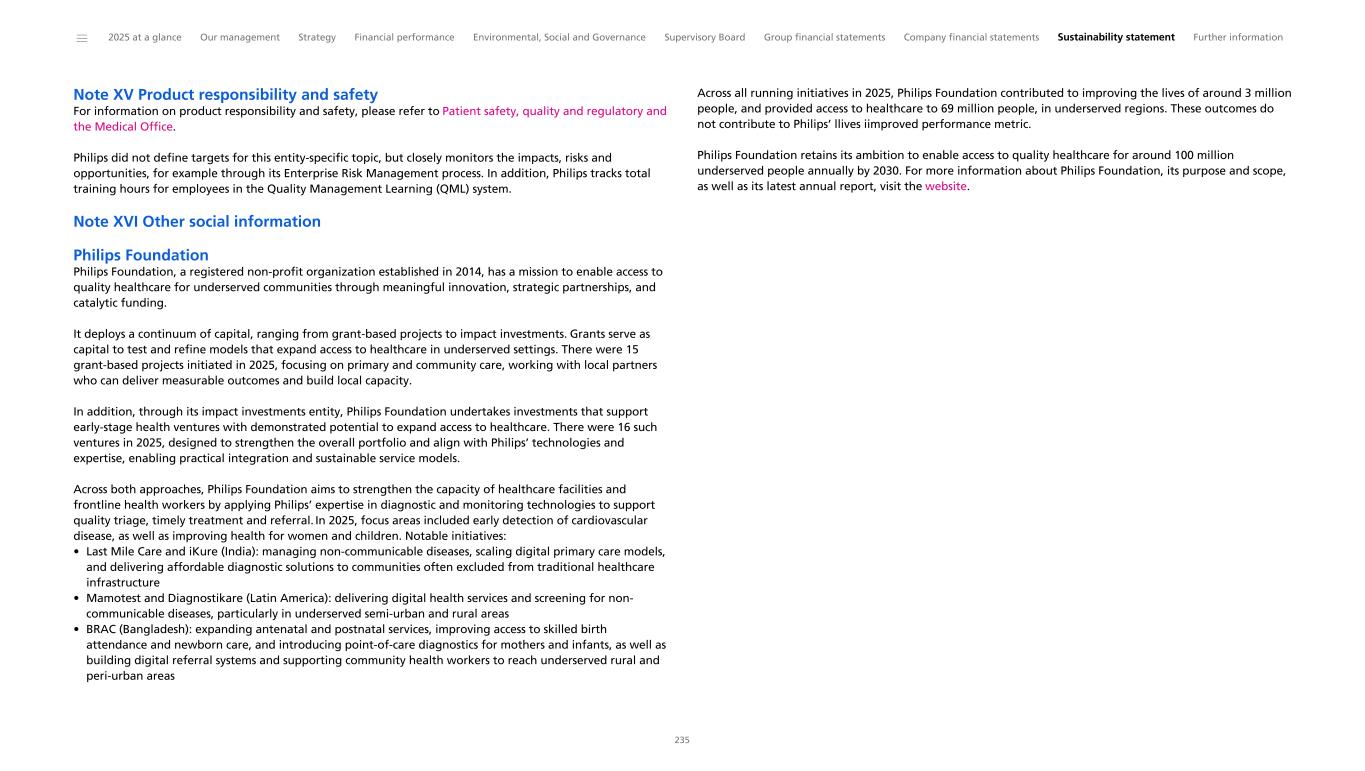 Note XV Product responsibility and safety For information on product responsibility and safety, please refer to Patient safety, quality and regulatory and the Medical Office. Philips did not define targets for this entity-specific topic, but closely monitors the impacts, risks and opportunities, for example through its Enterprise Risk Management process. In addition, Philips tracks total training hours for employees in the Quality Management Learning (QML) system. Note XVI Other social information Philips Foundation Philips Foundation, a registered non-profit organization established in 2014, has a mission to enable access to quality healthcare for underserved communities through meaningful innovation, strategic partnerships, and catalytic funding. It deploys a continuum of capital, ranging from grant-based projects to impact investments. Grants serve as capital to test and refine models that expand access to healthcare in underserved settings. There were 15 grant-based projects initiated in 2025, focusing on primary and community care, working with local partners who can deliver measurable outcomes and build local capacity. In addition, through its impact investments entity, Philips Foundation undertakes investments that support early-stage health ventures with demonstrated potential to expand access to healthcare. There were 16 such ventures in 2025, designed to strengthen the overall portfolio and align with Philips’ technologies and expertise, enabling practical integration and sustainable service models. Across both approaches, Philips Foundation aims to strengthen the capacity of healthcare facilities and frontline health workers by applying Philips’ expertise in diagnostic and monitoring technologies to support quality triage, timely treatment and referral. In 2025, focus areas included early detection of cardiovascular disease, as well as improving health for women and children. Notable initiatives: • Last Mile Care and iKure (India): managing non-communicable diseases, scaling digital primary care models, and delivering affordable diagnostic solutions to communities often excluded from traditional healthcare infrastructure • Mamotest and Diagnostikare (Latin America): delivering digital health services and screening for non- communicable diseases, particularly in underserved semi-urban and rural areas • BRAC (Bangladesh): expanding antenatal and postnatal services, improving access to skilled birth attendance and newborn care, and introducing point-of-care diagnostics for mothers and infants, as well as building digital referral systems and supporting community health workers to reach underserved rural and peri-urban areas Across all running initiatives in 2025, Philips Foundation contributed to improving the lives of around 3 million people, and provided access to healthcare to 69 million people, in underserved regions. These outcomes do not contribute to Philips’ llives iimproved performance metric. Philips Foundation retains its ambition to enable access to quality healthcare for around 100 million underserved people annually by 2030. For more information about Philips Foundation, its purpose and scope, as well as its latest annual report, visit the website. ______ 2025 at a glance Our management Strategy Financial performance Environmental, Social and Governance Supervisory Board Group financial statements Company financial statements Sustainability statement Further information 235