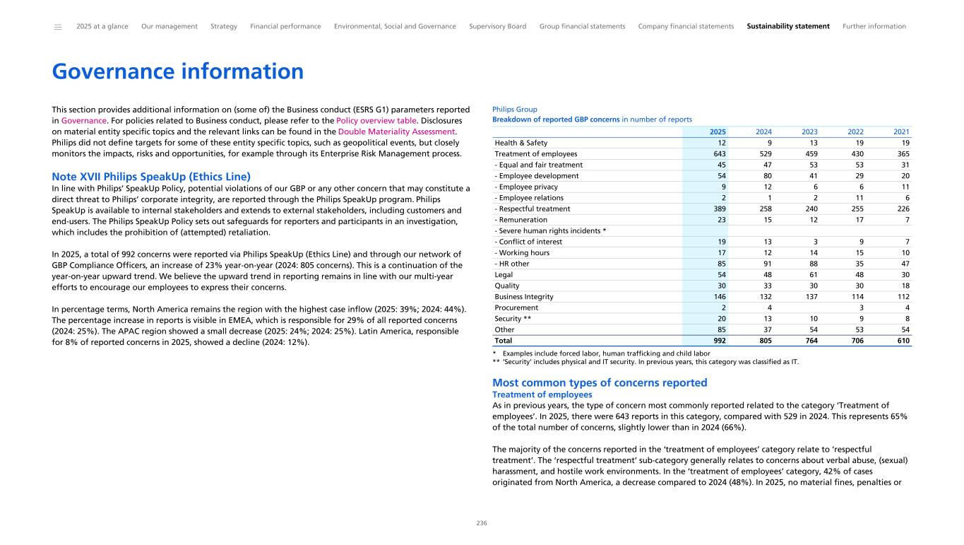 Governance information This section provides additional information on (some of) the Business conduct (ESRS G1) parameters reported in Governance. For policies related to Business conduct, please refer to the Policy overview table. Disclosures on material entity specific topics and the relevant links can be found in the Double Materiality Assessment. Philips did not define targets for some of these entity specific topics, such as geopolitical events, but closely monitors the impacts, risks and opportunities, for example through its Enterprise Risk Management process. Note XVII Philips SpeakUp (Ethics Line) In line with Philips’ SpeakUp Policy, potential violations of our GBP or any other concern that may constitute a direct threat to Philips’ corporate integrity, are reported through the Philips SpeakUp program. Philips SpeakUp is available to internal stakeholders and extends to external stakeholders, including customers and end-users. The Philips SpeakUp Policy sets out safeguards for reporters and participants in an investigation, which includes the prohibition of (attempted) retaliation. In 2025, a total of 992 concerns were reported via Philips SpeakUp (Ethics Line) and through our network of GBP Compliance Officers, an increase of 23% year-on-year (2024: 805 concerns). This is a continuation of the year-on-year upward trend. We believe the upward trend in reporting remains in line with our multi-year efforts to encourage our employees to express their concerns. In percentage terms, North America remains the region with the highest case inflow (2025: 39%; 2024: 44%). The percentage increase in reports is visible in EMEA, which is responsible for 29% of all reported concerns (2024: 25%). The APAC region showed a small decrease (2025: 24%; 2024: 25%). Latin America, responsible for 8% of reported concerns in 2025, showed a decline (2024: 12%). Philips Group Breakdown of reported GBP concerns in number of reports Health & Safety 12 9 13 19 19 Treatment of employees 643 529 459 430 365 - Equal and fair treatment 45 47 53 53 31 - Employee development 54 80 41 29 20 - Employee privacy 9 12 6 6 11 - Employee relations 2 1 2 11 6 - Respectful treatment 389 258 240 255 226 - Remuneration 23 15 12 17 7 - Severe human rights incidents * - Conflict of interest 19 13 3 9 7 - Working hours 17 12 14 15 10 - HR other 85 91 88 35 47 Legal 54 48 61 48 30 Quality 30 33 30 30 18 Business Integrity 146 132 137 114 112 Procurement 2 4 3 4 Security ** 20 13 10 9 8 Other 85 37 54 53 54 Total 992 805 764 706 610 2025 2024 2023 2022 2021 * Examples include forced labor, human trafficking and child labor ** ‘Security’ includes physical and IT security. In previous years, this category was classified as IT. Most common types of concerns reported Treatment of employees As in previous years, the type of concern most commonly reported related to the category ‘Treatment of employees’. In 2025, there were 643 reports in this category, compared with 529 in 2024. This represents 65% of the total number of concerns, slightly lower than in 2024 (66%). The majority of the concerns reported in the ‘treatment of employees’ category relate to ‘respectful treatment’. The ‘respectful treatment’ sub-category generally relates to concerns about verbal abuse, (sexual) harassment, and hostile work environments. In the ‘treatment of employees’ category, 42% of cases originated from North America, a decrease compared to 2024 (48%). In 2025, no material fines, penalties or ______ 2025 at a glance Our management Strategy Financial performance Environmental, Social and Governance Supervisory Board Group financial statements Company financial statements Sustainability statement Further information 236