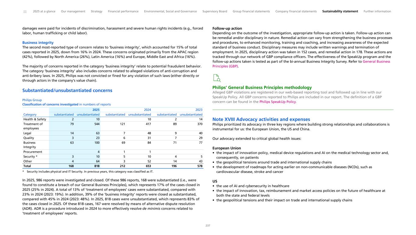 damages were paid for incidents of discrimination, harassment and severe human rights incidents (e.g., forced labor, human trafficking or child labor). Business integrity The second most-reported type of concern relates to ‘business integrity’, which accounted for 15% of total cases reported in 2025, down from 16% in 2024. These concerns originated primarily from the APAC region (42%), followed by North America (26%), Latin America (16%) and Europe, Middle East and Africa (16%). The majority of concerns reported in the category ‘business integrity’ relate to potential fraudulent behavior. The category ‘business integrity’ also includes concerns related to alleged violations of anti-corruption and anti-bribery laws. In 2025, Philips was not convicted or fined for any violation of such laws (either directly or through actors in the company’s value chain). Substantiated/unsubstantiated concerns Philips Group Classification of concerns investigated in numbers of reports Health & Safety 2 10 10 2 14 Treatment of employees 79 544 121 417 89 370 Legal 14 63 7 48 9 40 Quality 3 23 6 31 7 29 Business Integrity 63 100 69 84 71 77 Procurement 4 1 1 Security * 3 10 5 10 4 5 Other 4 64 3 52 14 43 Total 168 818 212 653 196 578 2025 2024 2023 Category substantiated unsubstantiated substantiated unsubstantiated substantiated unsubstantiated * Security includes physical and IT Security. In previous years, this category was classified as IT. In 2025, 986 reports were investigated and closed. Of these 986 reports, 168 were substantiated (i.e., were found to constitute a breach of our General Business Principles), which represents 17% of the cases closed in 2025 (25% in 2024). A total of 13% of ‘treatment of employees’ cases were substantiated, compared with 23% in 2024 (2023: 19%). In addition, 39% of the ‘business integrity’ reports were closed as substantiated, compared with 45% in 2024 (2023: 48%). In 2025, 818 cases were unsubstantiated, which represents 83% of the cases closed in 2025. Of these 818 cases, 167 were resolved by means of alternative dispute resolution (ADR). ADR is a procedure introduced in 2024 to more effectively resolve de minimis concerns related to 'treatment of employees' reports. Follow-up action Depending on the outcome of the investigation, appropriate follow-up action is taken. Follow-up action can be remedial and/or disciplinary in nature. Remedial action can vary from strengthening the business processes and procedures, to enhanced monitoring, training and coaching, and increasing awareness of the expected standard of business conduct. Disciplinary measures may include written warnings and termination of employment. In 2025, disciplinary action was taken in 152 cases, and remedial action in 178. These actions are tracked through our network of GBP compliance officers. The effectiveness of the SpeakUp program and the follow-up actions taken is tested as part of the bi-annual Business Integrity Survey. Refer to General Business Principles (GBP). Philips’ General Business Principles methodology Alleged GBP violations are registered in our web-based reporting tool and followed up in line with our SpeakUp Policy. All GBP concerns reported to Philips are included in our report. The definition of a GBP concern can be found in the Philips SpeakUp Policy. Note XVIII Advocacy activities and expenses Philips prioritized its advocacy in three key regions where building strong relationships and collaborations is instrumental for us: the European Union, the US and China. Our advocacy extended to critical global health issues: European Union • the impact of innovation policy, medical device regulations and AI on the medical technology sector and, consequently, on patients • the geopolitical tensions around trade and international supply chains • the development of roadmaps for acting earlier on non-communicable diseases (NCDs), such as cardiovascular disease, stroke and cancer US • the use of AI and cybersecurity in healthcare • the impact of innovation, tax, reimbursement and market access policies on the future of healthcare at both the state and federal levels • the geopolitical tensions and their impact on trade and international supply chains ______ 2025 at a glance Our management Strategy Financial performance Environmental, Social and Governance Supervisory Board Group financial statements Company financial statements Sustainability statement Further information 237
