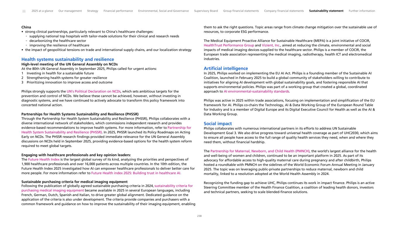 China • strong clinical partnerships, particularly relevant to China’s healthcare challenges: ◦ supplying national top hospitals with tailor-made solutions for their clinical and research needs ◦ decarbonizing the healthcare sector ◦ improving the resilience of healthcare • the impact of geopolitical tensions on trade and international supply chains, and our localization strategy Health systems sustainability and resilience High-level meeting of the UN General Assembly on NCDs At the 80th UN General Assembly in September 2025, Philips called for urgent actions: 1 Investing in health for a sustainable future 2 Strengthening health systems for greater resilience 3 Prioritizing innovation to improve access and outcome Philips strongly supports the UN’s Political Declaration on NCDs, which sets ambitious targets for the prevention and control of NCDs. We believe these cannot be achieved, however, without investing in diagnostic systems, and we have continued to actively advocate to transform this policy framework into concerted national action. Partnerships for Health Systems Sustainability and Resilience (PHSSR) Through the Partnership for Health System Sustainability and Resilience (PHSSR), Philips collaborates with a diverse international network of stakeholders, which commissions independent research and provides evidence-based recommendations to improve health systems. For more information, refer to Partnership for Health System Sustainability and Resilience (PHSSR). In 2025, PHSSR launched its Policy Roadmaps on Acting Early on NCDs. The PHSSR research findings provided immediate relevance for the UN General Assembly discussions on NCDs held in September 2025, providing evidence-based options for the health system reform required to meet global targets. Engaging with healthcare professionals and key opinion leaders: The Future Health Index is the largest global survey of its kind, analyzing the priorities and perspectives of 1,900 healthcare professionals and over 16,000 patients across multiple countries. In the 10th edition, the Future Health Index 2025 investigated how AI can empower healthcare professionals to deliver better care for more people. For more information refer to Future Health index 2025: Building trust in healthcare AI. Sustainable purchasing criteria for medical imaging equipment Following the publication of globally agreed sustainable purchasing criteria in 2024, sustainability criteria for purchasing medical imaging equipment became available in 2025 in several European languages, including French, German, Dutch, Spanish and Italian, to drive greater global alignment. Dedicated guidance on the application of the criteria is also under development. The criteria provide companies and purchasers with a common framework and guidance on how to improve the sustainability of their imaging equipment, enabling them to ask the right questions. Topic areas range from climate change mitigation over the sustainable use of resources, to corporate ESG performance. The Medical Equipment Proactive Alliance for Sustainable Healthcare (MEPA) is a joint initiative of COCIR, HealthTrust Performance Group and Vizient, Inc., aimed at reducing the climate, environmental and social impacts of medical imaging devices supplied to the healthcare sector. Philips is a member of COCIR, the European trade association representing the medical imaging, radiotherapy, health ICT and electromedical industries. Artificial intelligence In 2025, Philips worked on implementing the EU AI Act. Philips is a founding member of the Sustainable AI Coalition, launched in February 2025 to build a global community of stakeholders willing to contribute to initiatives for aligning AI development with global sustainability goals, and fostering responsible AI that supports environmental policies. Philips was part of a working group that created a global, coordinated approach to AI environmental-sustainability standards. Philips was active in 2025 within trade associations, focusing on implementation and simplification of the EU framework for AI. Philips co-chairs the Technology, AI & Data Working Group of the European Round Table for Industry and is a member of Digital Europe and its Digital Executive Council for Health as well as the AI & Data Working Group. Social impact Philips collaborates with numerous international partners in its efforts to address UN Sustainable Development Goal 3. We also drive progress toward universal health coverage as part of UHC2030, which aims to ensure all people have access to the full range of quality health services they need, when and where they need them, without financial hardship. The Partnership for Maternal, Newborn, and Child Health (PMNCH), the world’s largest alliance for the health and well-being of women and children, continued to be an important platform in 2025. As part of its advocacy for affordable access to high-quality maternal care during pregnancy and after childbirth, Philips hosted a roundtable with PMNCH on the sidelines of the World Economic Forum Annual Meeting in January 2025. The topic was on leveraging public-private partnerships to reduce maternal, newborn and child mortality, linked to a resolution adopted at the World Health Assembly in 2024. Recognizing the funding gap to achieve UHC, Philips continues its work in impact finance. Philips is an active Steering Committee member of the Health Finance Coalition, a coalition of leading health donors, investors and technical partners, seeking to scale blended-finance solutions. ______ 2025 at a glance Our management Strategy Financial performance Environmental, Social and Governance Supervisory Board Group financial statements Company financial statements Sustainability statement Further information 238