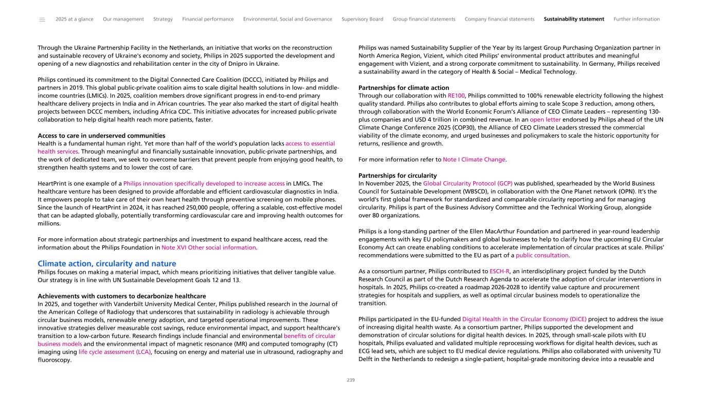 Through the Ukraine Partnership Facility in the Netherlands, an initiative that works on the reconstruction and sustainable recovery of Ukraine's economy and society, Philips in 2025 supported the development and opening of a new diagnostics and rehabilitation center in the city of Dnipro in Ukraine. Philips continued its commitment to the Digital Connected Care Coalition (DCCC), initiated by Philips and partners in 2019. This global public-private coalition aims to scale digital health solutions in low- and middle- income countries (LMICs). In 2025, coalition members drove significant progress in end-to-end primary healthcare delivery projects in India and in African countries. The year also marked the start of digital health projects between DCCC members, including Africa CDC. This initiative advocates for increased public-private collaboration to help digital health reach more patients, faster. Access to care in underserved communities Health is a fundamental human right. Yet more than half of the world’s population lacks access to essential health services. Through meaningful and financially sustainable innovation, public-private partnerships, and the work of dedicated team, we seek to overcome barriers that prevent people from enjoying good health, to strengthen health systems and to lower the cost of care. HeartPrint is one example of a Philips innovation specifically developed to increase access in LMICs. The healthcare venture has been designed to provide affordable and efficient cardiovascular diagnostics in India. It empowers people to take care of their own heart health through preventive screening on mobile phones. Since the launch of HeartPrint in 2024, it has reached 250,000 people, offering a scalable, cost-effective model that can be adapted globally, potentially transforming cardiovascular care and improving health outcomes for millions. For more information about strategic partnerships and investment to expand healthcare access, read the information about the Philips Foundation in Note XVI Other social information. Climate action, circularity and nature Philips focuses on making a material impact, which means prioritizing initiatives that deliver tangible value. Our strategy is in line with UN Sustainable Development Goals 12 and 13. Achievements with customers to decarbonize healthcare In 2025, and together with Vanderbilt University Medical Center, Philips published research in the Journal of the American College of Radiology that underscores that sustainability in radiology is achievable through circular business models, renewable energy adoption, and targeted operational improvements. These innovative strategies deliver measurable cost savings, reduce environmental impact, and support healthcare’s transition to a low-carbon future. Research findings include financial and environmental benefits of circular business models and the environmental impact of magnetic resonance (MR) and computed tomography (CT) imaging using life cycle assessment (LCA), focusing on energy and material use in ultrasound, radiography and fluoroscopy. Philips was named Sustainability Supplier of the Year by its largest Group Purchasing Organization partner in North America Region, Vizient, which cited Philips’ environmental product attributes and meaningful engagement with Vizient, and a strong corporate commitment to sustainability. In Germany, Philips received a sustainability award in the category of Health & Social – Medical Technology. Partnerships for climate action Through our collaboration with RE100, Philips committed to 100% renewable electricity following the highest quality standard. Philips also contributes to global efforts aiming to scale Scope 3 reduction, among others, through collaboration with the World Economic Forum’s Alliance of CEO Climate Leaders – representing 130- plus companies and USD 4 trillion in combined revenue. In an open letter endorsed by Philips ahead of the UN Climate Change Conference 2025 (COP30), the Alliance of CEO Climate Leaders stressed the commercial viability of the climate economy, and urged businesses and policymakers to scale the historic opportunity for returns, resilience and growth. For more information refer to Note I Climate Change. Partnerships for circularity In November 2025, the Global Circularity Protocol (GCP) was published, spearheaded by the World Business Council for Sustainable Development (WBSCD), in collaboration with the One Planet network (OPN). It’s the world’s first global framework for standardized and comparable circularity reporting and for managing circularity. Philips is part of the Business Advisory Committee and the Technical Working Group, alongside over 80 organizations. Philips is a long-standing partner of the Ellen MacArthur Foundation and partnered in year-round leadership engagements with key EU policymakers and global businesses to help to clarify how the upcoming EU Circular Economy Act can create enabling conditions to accelerate implementation of circular practices at scale. Philips’ recommendations were submitted to the EU as part of a public consultation. As a consortium partner, Philips contributed to ESCH-R, an interdisciplinary project funded by the Dutch Research Council as part of the Dutch Research Agenda to accelerate the adoption of circular interventions in hospitals. In 2025, Philips co-created a roadmap 2026-2028 to identify value capture and procurement strategies for hospitals and suppliers, as well as optimal circular business models to operationalize the transition. Philips participated in the EU-funded Digital Health in the Circular Economy (DiCE) project to address the issue of increasing digital health waste. As a consortium partner, Philips supported the development and demonstration of circular solutions for digital health devices. In 2025, through small-scale pilots with EU hospitals, Philips evaluated and validated multiple reprocessing workflows for digital health