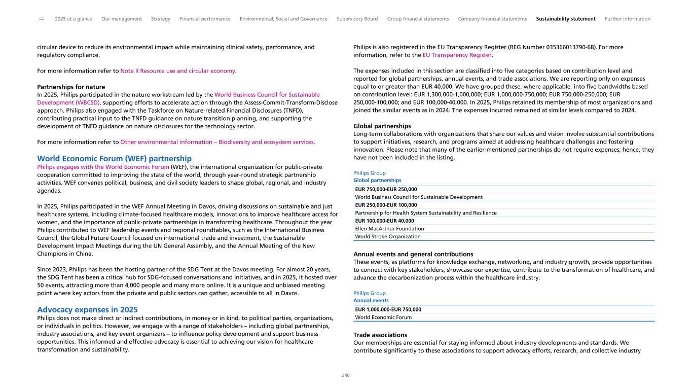 circular device to reduce its environmental impact while maintaining clinical safety, performance, and regulatory compliance. For more information refer to Note II Resource use and circular economy. Partnerships for nature In 2025, Philips participated in the nature workstream led by the World Business Council for Sustainable Development (WBCSD), supporting efforts to accelerate action through the Assess-Commit-Transform-Disclose approach. Philips also engaged with the Taskforce on Nature-related Financial Disclosures (TNFD), contributing practical input to the TNFD guidance on nature transition planning, and supporting the development of TNFD guidance on nature disclosures for the technology sector. For more information refer to Other environmental information – Biodiversity and ecosystem services. World Economic Forum (WEF) partnership Philips engages with the World Economic Forum (WEF), the international organization for public-private cooperation committed to improving the state of the world, through year-round strategic partnership activities. WEF convenes political, business, and civil society leaders to shape global, regional, and industry agendas. In 2025, Philips participated in the WEF Annual Meeting in Davos, driving discussions on sustainable and just healthcare systems, including climate-focused healthcare models, innovations to improve healthcare access for women, and the importance of public-private partnerships in transforming healthcare. Throughout the year Philips contributed to WEF leadership events and regional roundtables, such as the International Business Council, the Global Future Council focused on international trade and investment, the Sustainable Development Impact Meetings during the UN General Assembly, and the Annual Meeting of the New Champions in China. Since 2023, Philips has been the hosting partner of the SDG Tent at the Davos meeting. For almost 20 years, the SDG Tent has been a critical hub for SDG-focused conversations and initiatives, and in 2025, it hosted over 50 events, attracting more than 4,000 people and many more online. It is a unique and unbiased meeting point where key actors from the private and public sectors can gather, accessible to all in Davos. Advocacy expenses in 2025 Philips does not make direct or indirect contributions, in money or in kind, to political parties, organizations, or individuals in politics. However, we engage with a range of stakeholders – including global partnerships, industry associations, and key event organizers – to influence policy development and support business opportunities. This informed and effective advocacy is essential to achieving our vision for healthcare transformation and sustainability. Philips is also registered in the EU Transparency Register (REG Number 035366013790-68). For more information, refer to the EU Transparency Register. The expenses included in this section are classified into five categories based on contribution level and reported for global partnerships, annual events, and trade associations. We are reporting only on expenses equal to or greater than EUR 40,000. We have grouped these, where applicable, into five bandwidths based on contribution level: EUR 1,300,000-1,000,000; EUR 1,000,000-750,000; EUR 750,000-250,000; EUR 250,000-100,000; and EUR 100,000-40,000. In 2025, Philips retained its membership of most organizations and joined the similar events as in 2024. The expenses incurred remained at similar levels compared to 2024. Global partnerships Long-term collaborations with organizations that share our values and vision involve substantial contributions to support initiatives, research, and programs aimed at addressing healthcare challenges and fostering innovation. Please note that many of the earlier-mentioned partnerships do not require expenses; hence, they have not been included in the listing. Philips Group Global partnerships EUR 750,000-EUR 250,000 World Business Council for Sustainable Development EUR 250,000-EUR 100,000 Partnership for Health System Sustainability and Resilience EUR 100,000-EUR 40,000 Ellen MacArthur Foundation World Stroke Organization Annual events and general contributions These events, as platforms for knowledge exchange, networking, and industry growth, provide opportunities to connect with key stakeholders, showcase our expertise, contribute to the transformation of healthcare, and advance the decarbonization process within the healthcare industry. Philips Group Annual events EUR 1,000,000-EUR 750,000 World Economic Forum Trade associations Our memberships are essential for staying informed about industry developments and standards. We contribute significantly to these associations to support advocacy efforts, research, and collective industry ______ 2025 at a glance Our management Strategy Financial performance Environmental, Social and Governance Supervisory Board Group financial statements Company financial statements Sustainability statement Further information 240