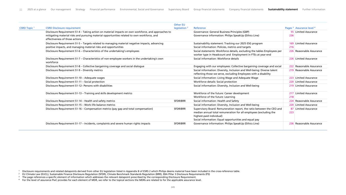 Disclosure Requirement S1-4 – Taking action on material impacts on own workforce, and approaches to mitigating material risks and pursuing material opportunities related to own workforce, and effectiveness of those actions Governance: General Business Principles (GBP) Governance information: Philips SpeakUp (Ethics Line) 55 236 Limited Assurance Disclosure Requirement S1-5 – Targets related to managing material negative impacts, advancing positive impacts, and managing material risks and opportunities Sustainability statement: Tracking our 2025 ESG program Social information: Policies, metrics and targets 169 216 Limited Assurance Disclosure Requirement S1-6 – Characteristics of the undertaking’s employees Social statements: Workforce details, excluding the tables Employees per worker type in Headcount and Employment in FTEs at year-end 226 Reasonable Assurance Disclosure Requirement S1-7 – Characteristics of non-employee workers in the undertaking’s own workforce Social information: Workforce details 226 Limited Assurance Disclosure Requirement S1-8 – Collective bargaining coverage and social dialogue Engaging with our employees: Collective bargaining coverage and social 222 Reasonable Assurance Disclosure Requirement S1-9 – Diversity metrics Social information: Diversity, Inclusion and Well-being: Diverse talent reflecting those we serve, excluding Employees with a disability 219 Reasonable Assurance Disclosure Requirement S1-10 – Adequate wages Social information: Living Wage and Adequate Wage 223 Limited Assurance Disclosure Requirement S1-11 – Social protection Workforce details: Social protection 220 Limited Assurance Disclosure Requirement S1-12– Persons with disabilities Social information: Diversity, Inclusion and Well-being 219 Limited Assurance Disclosure Requirement S1-13 – Training and skills development metrics Workforce of the future: Career development Workforce of the future: Learning 217 218 Limited Assurance Disclosure Requirement S1-14 – Health and safety metrics SFDR/BRR Social information: Health and Safety 224 Reasonable Assurance Disclosure Requirement S1-15 – Work-life balance metrics 1,2,3,4 Social information: Diversity, Inclusion and Well-being 220 Limited Assurance Disclosure Requirement S1-16 – Compensation metrics (pay gap and total compensation) SFDR/BRR Supervisory Board: Remuneration report, the ratio between the CEO and median annual total remuneration for all employees (excluding the highest-paid individual) Social information: Equal opportunities and equal pay 87 223 Limited Assurance Disclosure Requirement S1-17 – Incidents, complaints and severe human rights impacts SFDR/BRR Governance information: Philips SpeakUp (Ethics Line) 236 Reasonable Assurance CSRD Topic 1 CSRD Disclosure requirement Other EU legislation 2 Reference Pages 3 Assurance level 4 ______ 2025 at a glance Our management Strategy Financial performance Environmental, Social and Governance Supervisory Board Group financial statements Company financial statements Sustainability statement Further information 245 1 Disclosure requirements and related datapoints derived from other EU legislation listed in Appendix B of ESRS 2 which Philips deems material have been included in the cross-reference table. 2 EU Climate Law (EUCL), Sustainable Finance Disclosure Regulation (SFDR), Climate Benchmark Standards Regulation (BRR), EBA Pillar 3 Disclosure Requirements (P3) 3 The page references a specific element of information which addresses the relevant datapoint prescribed by the corresponding Disclosure Requirement. 4 For the level of assurance PwC provides for each element of MDR, we refer to the topical sections the MDRs are related to for the applicable assurance level.