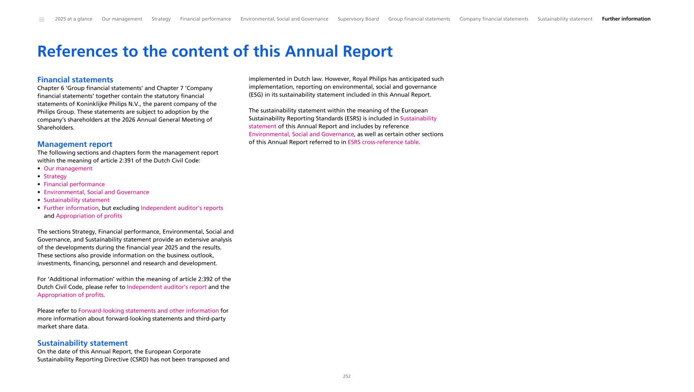 References to the content of this Annual Report Financial statements Chapter 6 ‘Group financial statements’ and Chapter 7 ’Company financial statements’ together contain the statutory financial statements of Koninklijke Philips N.V., the parent company of the Philips Group. These statements are subject to adoption by the company’s shareholders at the 2026 Annual General Meeting of Shareholders. Management report The following sections and chapters form the management report within the meaning of article 2:391 of the Dutch Civil Code: • Our management • Strategy • Financial performance • Environmental, Social and Governance • Sustainability statement • Further information, but excluding Independent auditor’s reports and Appropriation of profits The sections Strategy, Financial performance, Environmental, Social and Governance, and Sustainability statement provide an extensive analysis of the developments during the financial year 2025 and the results. These sections also provide information on the business outlook, investments, financing, personnel and research and development. For ‘Additional information’ within the meaning of article 2:392 of the Dutch Civil Code, please refer to Independent auditor’s report and the Appropriation of profits. Please refer to Forward-looking statements and other information for more information about forward-looking statements and third-party market share data. Sustainability statement On the date of this Annual Report, the European Corporate Sustainability Reporting Directive (CSRD) has not been transposed and implemented in Dutch law. However, Royal Philips has anticipated such implementation, reporting on environmental, social and governance (ESG) in its sustainability statement included in this Annual Report. The sustainability statement within the meaning of the European Sustainability Reporting Standards (ESRS) is included in Sustainability statement of this Annual Report and includes by reference Environmental, Social and Governance, as well as certain other sections of this Annual Report referred to in ESRS cross-reference table. ______ 2025 at a glance Our management Strategy Financial performance Environmental, Social and Governance Supervisory Board Group financial statements Company financial statements Sustainability statement Further information 252