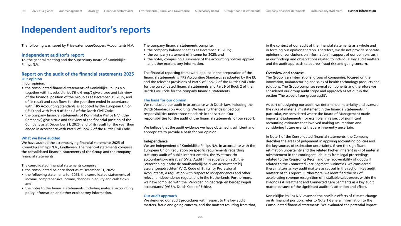 Independent auditor’s reports The following was issued by PricewaterhouseCoopers Accountants N.V. Independent auditor’s report To: the general meeting and the Supervisory Board of Koninklijke Philips N.V. Report on the audit of the financial statements 2025 Our opinion In our opinion: • the consolidated financial statements of Koninklijke Philips N.V. together with its subsidiaries (‘the Group’) give a true and fair view of the financial position of the Group as at December 31, 2025, and of its result and cash flows for the year then ended in accordance with IFRS Accounting Standards as adopted by the European Union (‘EU’) and with Part 9 of Book 2 of the Dutch Civil Code; • the company financial statements of Koninklijke Philips N.V. (‘the Company’) give a true and fair view of the financial position of the Company as at December 31, 2025, and of its result for the year then ended in accordance with Part 9 of Book 2 of the Dutch Civil Code. What we have audited We have audited the accompanying financial statements 2025 of Koninklijke Philips N.V., Eindhoven. The financial statements comprise the consolidated financial statements of the Group and the company financial statements. The consolidated financial statements comprise: • the consolidated balance sheet as at December 31, 2025; • the following statements for 2025: the consolidated statements of income, comprehensive income, changes in equity and cash flows; and • the notes to the financial statements, including material accounting policy information and other explanatory information. The company financial statements comprise: • the company balance sheet as at December 31, 2025; • the company statement of income for 2025; and • the notes, comprising a summary of the accounting policies applied and other explanatory information. The financial reporting framework applied in the preparation of the financial statements is IFRS Accounting Standards as adopted by the EU and the relevant provisions of Part 9 of Book 2 of the Dutch Civil Code for the consolidated financial statements and Part 9 of Book 2 of the Dutch Civil Code for the company financial statements. The basis for our opinion We conducted our audit in accordance with Dutch law, including the Dutch Standards on Auditing. We have further described our responsibilities under those standards in the section ‘Our responsibilities for the audit of the financial statements’ of our report. We believe that the audit evidence we have obtained is sufficient and appropriate to provide a basis for our opinion. Independence We are independent of Koninklijke Philips N.V. in accordance with the European Union Regulation on specific requirements regarding statutory audit of public-interest entities, the ‘Wet toezicht accountantsorganisaties’ (Wta, Audit firms supervision act), the ‘Verordening inzake de onafhankelijkheid van accountants bij assuranceopdrachten’ (ViO, Code of Ethics for Professional Accountants, a regulation with respect to independence) and other relevant independence regulations in the Netherlands. Furthermore, we have complied with the ‘Verordening gedrags- en beroepsregels accountants’ (VGBA, Dutch Code of Ethics). Our audit approach We designed our audit procedures with respect to the key audit matters, fraud and going concern, and the matters resulting from that, in the context of our audit of the financial statements as a whole and in forming our opinion thereon. Therefore, we do not provide separate opinions or conclusions on information in support of our opinion, such as our findings and observations related to individual key audit matters and the audit approach to address fraud risk and going concern. Overview and context The Group is an international group of companies, focused on the innovation, manufacturing and sales of health technology products and solutions. The Group comprises several components and therefore we considered our group audit scope and approach as set out in the section ‘The scope of our group audit’. As part of designing our audit, we determined materiality and assessed the risks of material misstatement in the financial statements. In particular, we considered where the Board of Management made important judgements, for example, in respect of significant accounting estimates that involved making assumptions and considering future events that are inherently uncertain. In Note 1 of the Consolidated financial statements, the Company describes the areas of judgement in applying accounting policies and the key sources of estimation uncertainty. Given the significant estimation uncertainty and the related higher inherent risks of material misstatement in the contingent liabilities from legal proceedings related to the Respironics Recall and the recoverability of goodwill related to the Connected Care Segment Businesses, we considered these matters as key audit matters as set out in the section ‘Key audit matters’ of this report. Furthermore, we identified the risk of accelerating revenue recognition of installable sales orders within the Diagnosis & Treatment and Connected Care Segments as a key audit matter because of the significant auditor’s attention and effort. Koninklijke Philips N.V. assessed the possible effects of climate change on its financial position, refer to Note 1 General information to the Consolidated financial statements. We evaluated the potential impact ______ 2025 at a glance Our management Strategy Financial performance Environmental, Social and Governance Supervisory Board Group financial statements Company financial statements Sustainability statement Further information 255