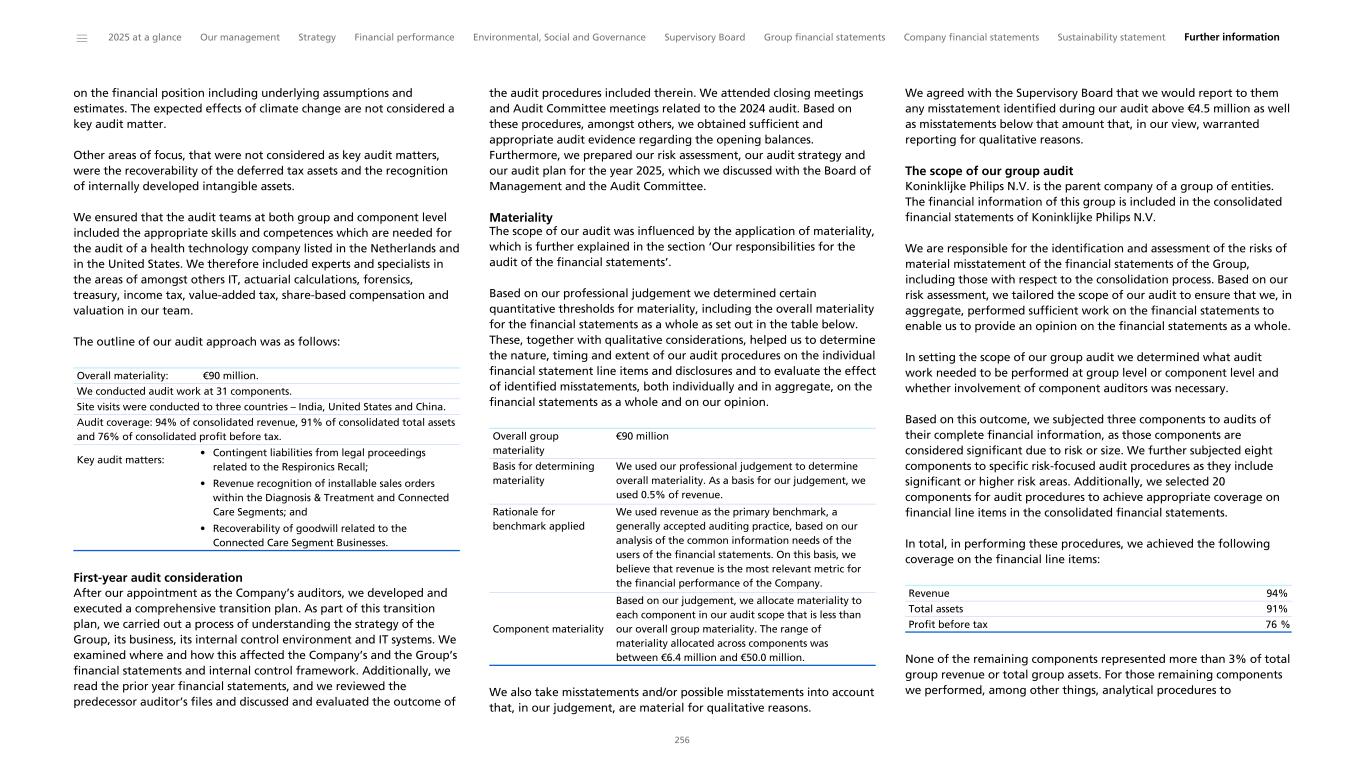 on the financial position including underlying assumptions and estimates. The expected effects of climate change are not considered a key audit matter. Other areas of focus, that were not considered as key audit matters, were the recoverability of the deferred tax assets and the recognition of internally developed intangible assets. We ensured that the audit teams at both group and component level included the appropriate skills and competences which are needed for the audit of a health technology company listed in the Netherlands and in the United States. We therefore included experts and specialists in the areas of amongst others IT, actuarial calculations, forensics, treasury, income tax, value-added tax, share-based compensation and valuation in our team. The outline of our audit approach was as follows: Overall materiality: €90 million. We conducted audit work at 31 components. Site visits were conducted to three countries – India, United States and China. Audit coverage: 94% of consolidated revenue, 91% of consolidated total assets and 76% of consolidated profit before tax. Key audit matters: • Contingent liabilities from legal proceedings related to the Respironics Recall; • Revenue recognition of installable sales orders within the Diagnosis & Treatment and Connected Care Segments; and • Recoverability of goodwill related to the Connected Care Segment Businesses. First-year audit consideration After our appointment as the Company’s auditors, we developed and executed a comprehensive transition plan. As part of this transition plan, we carried out a process of understanding the strategy of the Group, its business, its internal control environment and IT systems. We examined where and how this affected the Company’s and the Group’s financial statements and internal control framework. Additionally, we read the prior year financial statements, and we reviewed the predecessor auditor’s files and discussed and evaluated the outcome of the audit procedures included therein. We attended closing meetings and Audit Committee meetings related to the 2024 audit. Based on these procedures, amongst others, we obtained sufficient and appropriate audit evidence regarding the opening balances. Furthermore, we prepared our risk assessment, our audit strategy and our audit plan for the year 2025, which we discussed with the Board of Management and the Audit Committee. Materiality The scope of our audit was influenced by the application of materiality, which is further explained in the section ‘Our responsibilities for the audit of the financial statements’. Based on our professional judgement we determined certain quantitative thresholds for materiality, including the overall materiality for the financial statements as a whole as set out in the table below. These, together with qualitative considerations, helped us to determine the nature, timing and extent of our audit procedures on the individual financial statement line items and disclosures and to evaluate the effect of identified misstatements, both individually and in aggregate, on the financial statements as a whole and on our opinion. Overall group materiality €90 million Basis for determining materiality We used our professional judgement to determine overall materiality. As a basis for our judgement, we used 0.5% of revenue. Rationale for benchmark applied We used revenue as the primary benchmark, a generally accepted auditing practice, based on our analysis of the common information needs of the users of the financial statements. On this basis, we believe that revenue is the most relevant metric for the financial performance of the Company. Component materiality Based on our judgement, we allocate materiality to each component in our audit scope that is less than our overall group materiality. The range of materiality allocated across components was between €6.4 million and €50.0 million. We also take misstatements and/or possible misstatements into account that, in our judgement, are material for qualitative reasons. We agreed with the Supervisory Board that we would report to them any misstatement identified during our audit above €4.5 million as well as misstatements below that amount that, in our view, warranted reporting for qualitative reasons. The scope of our group audit Koninklijke Philips N.V. is the parent company of a group of entities. The financial information of this group is included in the consolidated financial statements of Koninklijke Philips N.V. We are responsible for the identification and assessment of the risks of material misstatement of the financial statements of the Group, including those with respect to the consolidation process. Based on our risk assessment, we tailored the scope of our audit to ensure that we, in aggregate, performed sufficient work on the financial statements to enable us to provide an opinion on the financial statements as a whole. In setting the scope of our group audit we determined what audit work needed to be performed at group level or component level and whether involvement of component auditors was necessary. Based on this outcome, we subjected three components to audits of their complete financial information, as those components are considered significant due to risk or size. We further subjected eight components to specific risk-focused audit procedures as they include significant or higher risk areas. Additionally, we selected 20 components for audit procedures to achieve appropriate coverage on financial line items in the consolidated financial statements. In total, in performing these procedures, we achieved the following coverage on the financial line items: Revenue 94% Total assets 91% Profit before tax 76 % None of the remaining components represented more than 3% of total group revenue or total group assets. For those remaining components we performed, among other things, analytical procedures to ______ 2025 at a glance Our management Strate