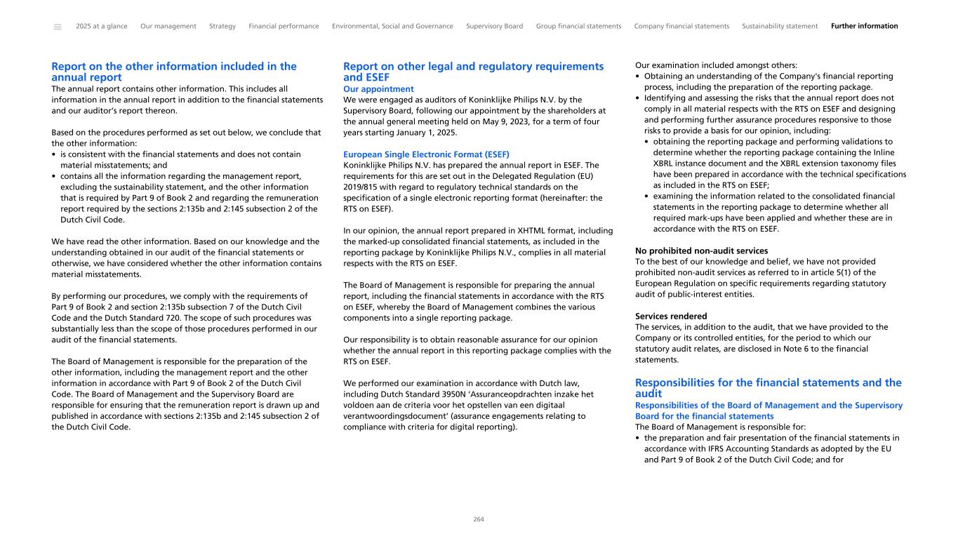 Report on the other information included in the annual report The annual report contains other information. This includes all information in the annual report in addition to the financial statements and our auditor’s report thereon. Based on the procedures performed as set out below, we conclude that the other information: • is consistent with the financial statements and does not contain material misstatements; and • contains all the information regarding the management report, excluding the sustainability statement, and the other information that is required by Part 9 of Book 2 and regarding the remuneration report required by the sections 2:135b and 2:145 subsection 2 of the Dutch Civil Code. We have read the other information. Based on our knowledge and the understanding obtained in our audit of the financial statements or otherwise, we have considered whether the other information contains material misstatements. By performing our procedures, we comply with the requirements of Part 9 of Book 2 and section 2:135b subsection 7 of the Dutch Civil Code and the Dutch Standard 720. The scope of such procedures was substantially less than the scope of those procedures performed in our audit of the financial statements. The Board of Management is responsible for the preparation of the other information, including the management report and the other information in accordance with Part 9 of Book 2 of the Dutch Civil Code. The Board of Management and the Supervisory Board are responsible for ensuring that the remuneration report is drawn up and published in accordance with sections 2:135b and 2:145 subsection 2 of the Dutch Civil Code. Report on other legal and regulatory requirements and ESEF Our appointment We were engaged as auditors of Koninklijke Philips N.V. by the Supervisory Board, following our appointment by the shareholders at the annual general meeting held on May 9, 2023, for a term of four years starting January 1, 2025. European Single Electronic Format (ESEF) Koninklijke Philips N.V. has prepared the annual report in ESEF. The requirements for this are set out in the Delegated Regulation (EU) 2019/815 with regard to regulatory technical standards on the specification of a single electronic reporting format (hereinafter: the RTS on ESEF). In our opinion, the annual report prepared in XHTML format, including the marked-up consolidated financial statements, as included in the reporting package by Koninklijke Philips N.V., complies in all material respects with the RTS on ESEF. The Board of Management is responsible for preparing the annual report, including the financial statements in accordance with the RTS on ESEF, whereby the Board of Management combines the various components into a single reporting package. Our responsibility is to obtain reasonable assurance for our opinion whether the annual report in this reporting package complies with the RTS on ESEF. We performed our examination in accordance with Dutch law, including Dutch Standard 3950N ‘Assuranceopdrachten inzake het voldoen aan de criteria voor het opstellen van een digitaal verantwoordingsdocument’ (assurance engagements relating to compliance with criteria for digital reporting). Our examination included amongst others: • Obtaining an understanding of the Company's financial reporting process, including the preparation of the reporting package. • Identifying and assessing the risks that the annual report does not comply in all material respects with the RTS on ESEF and designing and performing further assurance procedures responsive to those risks to provide a basis for our opinion, including: • obtaining the reporting package and performing validations to determine whether the reporting package containing the Inline XBRL instance document and the XBRL extension taxonomy files have been prepared in accordance with the technical specifications as included in the RTS on ESEF; • examining the information related to the consolidated financial statements in the reporting package to determine whether all required mark-ups have been applied and whether these are in accordance with the RTS on ESEF. No prohibited non-audit services To the best of our knowledge and belief, we have not provided prohibited non-audit services as referred to in article 5(1) of the European Regulation on specific requirements regarding statutory audit of public-interest entities. Services rendered The services, in addition to the audit, that we have provided to the Company or its controlled entities, for the period to which our statutory audit relates, are disclosed in Note 6 to the financial statements. Responsibilities for the financial statements and the audit Responsibilities of the Board of Management and the Supervisory Board for the financial statements The Board of Management is responsible for: • the preparation and fair presentation of the financial statements in accordance with IFRS Accounting Standards as adopted by the EU and Part 9 of Book 2 of the Dutch Civil Code; and for ______ 2025 at a glance Our management Strategy Financial performance Environmental, Social and Governance Supervisory Board Group financial statements Company financial statements Sustainability statement Further information 264