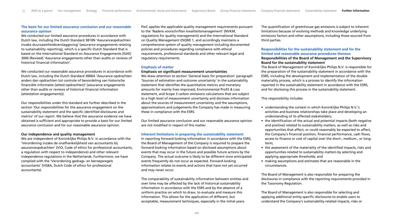 Assurance report of the independent auditor with limited assurance on the sustainability statement and reasonable assurance on specific identified disclosures and metrics To: the general meeting and the Supervisory Board of Koninklijke Philips N.V. Our engagement We have conducted a combined assurance engagement on the sustainability statement 2025 of Koninklijke Philips N.V., Eindhoven, comprising of: • Limited assurance procedures on the full sustainability statement 2025 in accordance with the Dutch Standard 3810N; and, • Reasonable assurance procedures on specific identified disclosures and metrics within the sustainability statement 2025 in accordance with the Dutch Standard 3000A. We report our conclusion resulting from our limited assurance procedures and our opinion resulting from our reasonable assurance procedures separately and under different standards. Our limited assurance conclusion on the sustainability statement Based on the procedures we have performed and the assurance evidence we have obtained, nothing has come to our attention that causes us to believe that the sustainability statement of Koninklijke Philips N.V. (the Company) for 2025 is not, in all material respects, • prepared in accordance with the European Sustainability Reporting Standards (ESRS) as adopted by the European Commission and in accordance with the process, carried out by the Company, to identify the information to be reported pursuant to the ESRS; and • compliant with the reporting requirements provided for in Article 8 of Regulation (EU) 2020/852 (the Taxonomy Regulation). The subject matter of our limited assurance procedures We have conducted limited assurance procedures on the sustainability statement of Koninklijke Philips N.V., Eindhoven, for 2025, included in section sustainability statement of the management report, including the information incorporated in the sustainability statement by reference (hereafter: the sustainability statement). In the sustainability statement, references are made to external sources or websites. The information on these external sources or websites is not subject to our limited assurance procedures for the sustainability statement. We therefore do not provide assurance on this information. Our reasonable assurance opinion on specific identified disclosures and metrics within the sustainability statement In our opinion, the specific identified disclosures and metrics, that are identified in the paragraph ‘The subject matter of our reasonable assurance procedures’, within the sustainability statement of Koninklijke Philips N.V., for 2025, are prepared, in all material respects, in accordance with the relevant disclosure requirements of the ESRS as adopted by the European Commission. The subject matter of our reasonable assurance procedures We have conducted reasonable assurance procedures on the following specific identified disclosures and metrics (the specific identified disclosures and metrics) within the sustainability statement of Koninklijke Philips N.V., Eindhoven, for 2025. Chapter Environmental, Social and Governance • Environmental, the paragraphs: • Measuring our environmental impact, the subparagraph Environmental Profit & Loss statement 2025; • Climate change; and • Resource use and circular economy. • Social, the paragraphs: • Improving people’s lives; • Our organization, people and culture, the subparagraph Leadership and people capabilities; and • Human rights. • Governance, the paragraphs: • The Philips integrated operating model; • Patient safety, quality and regulatory and the Medical Office; • General Business Principles (GBP); and • Working with stakeholders and advocacy. Chapter Sustainability statement • General basis for preparation, the paragraph Strategy. • Double Materiality Assessment. • Note I Climate change, the paragraphs: • Policies, metrics and targets; • Actions associated with climate change; and • Impact, risk and opportunity management, excluding subparagraph Transition plan for climate change mitigation. • Note II Resource use and circular economy, the paragraphs: • Policies, metrics, targets, excluding the EcoDesigned NPIs metric percentages and the subparagraphs Actions related to circular revenues and Allocated resources, but including graph Philips circular revenues as % of total Philips revenues and the subparagraph Circular end-of-use management: medical equipment; • EcoDesign; and • Waste. • Own workforce, the paragraphs: • Management of key material people topics (Impacts, Risks and Opportunities); and • Policies, metrics and targets. • Note IV Workforce of the future, the paragraph Total Workforce Strategy. • Note V Diversity, inclusion and well-being, the subparagraph Diverse talent reflecting those we serve, excluding subparagraph Employees with a disability. • Note VI Engaging with our employees, the paragraph Collective bargaining and social dialogue. • Note IX Health and safety. • Note X Workforce details, excluding the tables Employees per worker type in headcount and Employment in FTEs at year-end. • Note XI Supplier sustainability and workers in the value chain, the subparagraphs: • Policies and standards; and • Results. • Note XII Human rights. • Note XIV Lives improved. • Note XV Product responsibility and safety. • Note XVII Philips SpeakUp (Ethics Line). ______ 2025 at a glance Our management Strategy Financial performance Environmental, Social and Governance Supervisory Board Group financial statements Company financial statements Sustainability statement Further information 266