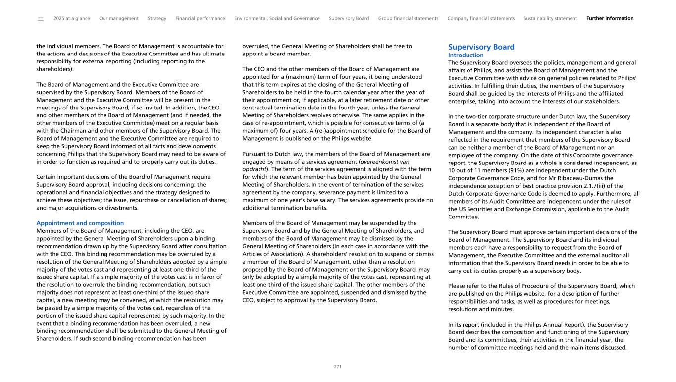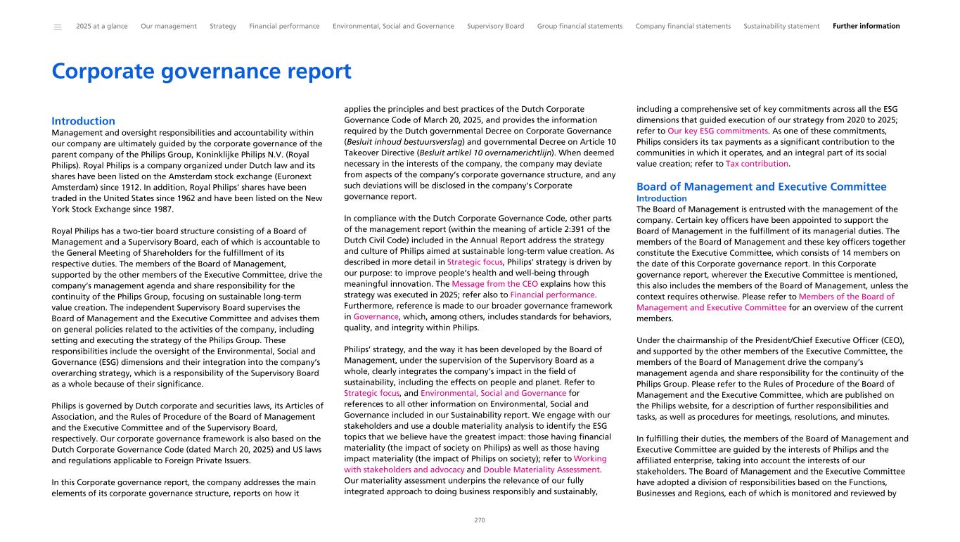 Corporate governance report Introduction Management and oversight responsibilities and accountability within our company are ultimately guided by the corporate governance of the parent company of the Philips Group, Koninklijke Philips N.V. (Royal Philips). Royal Philips is a company organized under Dutch law and its shares have been listed on the Amsterdam stock exchange (Euronext Amsterdam) since 1912. In addition, Royal Philips’ shares have been traded in the United States since 1962 and have been listed on the New York Stock Exchange since 1987. Royal Philips has a two-tier board structure consisting of a Board of Management and a Supervisory Board, each of which is accountable to the General Meeting of Shareholders for the fulfillment of its respective duties. The members of the Board of Management, supported by the other members of the Executive Committee, drive the company’s management agenda and share responsibility for the continuity of the Philips Group, focusing on sustainable long-term value creation. The independent Supervisory Board supervises the Board of Management and the Executive Committee and advises them on general policies related to the activities of the company, including setting and executing the strategy of the Philips Group. These responsibilities include the oversight of the Environmental, Social and Governance (ESG) dimensions and their integration into the company’s overarching strategy, which is a responsibility of the Supervisory Board as a whole because of their significance. Philips is governed by Dutch corporate and securities laws, its Articles of Association, and the Rules of Procedure of the Board of Management and the Executive Committee and of the Supervisory Board, respectively. Our corporate governance framework is also based on the Dutch Corporate Governance Code (dated March 20, 2025) and US laws and regulations applicable to Foreign Private Issuers. In this Corporate governance report, the company addresses the main elements of its corporate governance structure, reports on how it applies the principles and best practices of the Dutch Corporate Governance Code of March 20, 2025, and provides the information required by the Dutch governmental Decree on Corporate Governance (Besluit inhoud bestuursverslag) and governmental Decree on Article 10 Takeover Directive (Besluit artikel 10 overnamerichtlijn). When deemed necessary in the interests of the company, the company may deviate from aspects of the company’s corporate governance structure, and any such deviations will be disclosed in the company’s Corporate governance report. In compliance with the Dutch Corporate Governance Code, other parts of the management report (within the meaning of article 2:391 of the Dutch Civil Code) included in the Annual Report address the strategy and culture of Philips aimed at sustainable long-term value creation. As described in more detail in Strategic focus, Philips’ strategy is driven by our purpose: to improve people’s health and well-being through meaningful innovation. The Message from the CEO explains how this strategy was executed in 2025; refer also to Financial performance. Furthermore, reference is made to our broader governance framework in Governance, which, among others, includes standards for behaviors, quality, and integrity within Philips. Philips’ strategy, and the way it has been developed by the Board of Management, under the supervision of the Supervisory Board as a whole, clearly integrates the company’s impact in the field of sustainability, including the effects on people and planet. Refer to Strategic focus, and Environmental, Social and Governance for references to all other information on Environmental, Social and Governance included in our Sustainability report. We engage with our stakeholders and use a double materiality analysis to identify the ESG topics that we believe have the greatest impact: those having financial materiality (the impact of society on Philips) as well as those having impact materiality (the impact of Philips on society); refer to Working with stakeholders and advocacy and Double Materiality Assessment. Our materiality assessment underpins the relevance of our fully integrated approach to doing business responsibly and sustainably, including a comprehensive set of key commitments across all the ESG dimensions that guided execution of our strategy from 2020 to 2025; refer to Our key ESG commitments. As one of these commitments, Philips considers its tax payments as a significant contribution to the communities in which it operates, and an integral part of its social value creation; refer to Tax contribution. Board of Management and Executive Committee Introduction The Board of Management is entrusted with the management of the company. Certain key officers have been appointed to support the Board of Management in the fulfillment of its managerial duties. The members of the Board of Management and these key officers together constitute the Executive Committee, which consists of 14 members on the date of this Corporate governance report. In this Corporate governance report, wherever the Executive Committee is mentioned, this also includes the members of the Board of Management, unless the context requires otherwise. Please refer to Members of the Board of Management and Executive Committee for an overview of the current members. Under the chairmanship of the President/Chief Executive Officer (CEO), and supported by the other members of the Executive Committee, the members of the Board of Management drive the company’s management agenda and share responsibility for the continuity of the Philips Group. Please refer to the Rules of Procedure of the Board of Management and the Executive Committee, which are published on the Philips website, for a description of further responsibilities and tasks, as well as procedures for meetings, resolutions, and minutes. In fulfilling their duties, the members of 