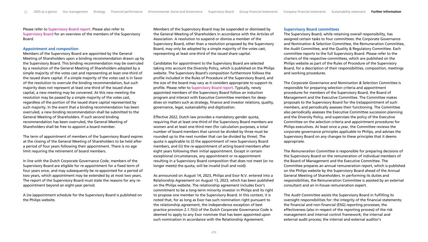Please refer to Supervisory Board report. Please also refer to Supervisory Board for an overview of the members of the Supervisory Board. Appointment and composition Members of the Supervisory Board are appointed by the General Meeting of Shareholders upon a binding recommendation drawn up by the Supervisory Board. This binding recommendation may be overruled by a resolution of the General Meeting of Shareholders adopted by a simple majority of the votes cast and representing at least one-third of the issued share capital. If a simple majority of the votes cast is in favor of the resolution to overrule the binding recommendation, but such majority does not represent at least one-third of the issued share capital, a new meeting may be convened. At this new meeting the resolution may be passed by a simple majority of the votes cast, regardless of the portion of the issued share capital represented by such majority. In the event that a binding recommendation has been overruled, a new binding recommendation shall be submitted to the General Meeting of Shareholders. If such second binding recommendation has been overruled, the General Meeting of Shareholders shall be free to appoint a board member. The term of appointment of members of the Supervisory Board expires at the closing of the General Meeting of Shareholders to be held after a period of four years following their appointment. There is no age limit requiring the retirement of board members. In line with the Dutch Corporate Governance Code, members of the Supervisory Board are eligible for re-appointment for a fixed term of four years once, and may subsequently be re-appointed for a period of two years, which appointment may be extended by at most two years. The report of the Supervisory Board must state the reasons for any re- appointment beyond an eight-year period. A (re-)appointment schedule for the Supervisory Board is published on the Philips website. Members of the Supervisory Board may be suspended or dismissed by the General Meeting of Shareholders in accordance with the Articles of Association. A resolution to suspend or dismiss a member of the Supervisory Board, other than a resolution proposed by the Supervisory Board, may only be adopted by a simple majority of the votes cast, representing at least one-third of the issued share capital. Candidates for appointment to the Supervisory Board are selected taking into account the Diversity Policy, which is published on the Philips website. The Supervisory Board’s composition furthermore follows the profile included in the Rules of Procedure of the Supervisory Board, and the size of the board may vary as it considers appropriate to support its profile. Please refer to Supervisory Board report. Typically, newly appointed members of the Supervisory Board follow an induction program and interact with Executive Committee members for deep- dives on matters such as strategy, finance and investor relations, quality, governance, legal, sustainability and digitization. Effective 2022, Dutch law provides a mandatory gender quota, requiring that at least one-third of the Supervisory Board members are women and at least one-third men (for calculation purposes, a total number of board members that cannot be divided by three must be rounded up to the next number that can be divided by three). The quota is applicable to (i) the appointment of new Supervisory Board members, and (ii) the re-appointment of acting board members after eight years following their initial appointment. Except in certain exceptional circumstances, any appointment or re-appointment resulting in a Supervisory Board composition that does not meet (or no longer meets) the quota, will be invalid (null and void). As announced on August 14, 2023, Philips and Exor N.V. entered into a Relationship Agreement on August 13, 2023, which has been published on the Philips website. The relationship agreement includes Exor’s commitment to be a long-term minority investor in Philips and its right to propose one member to the Supervisory Board. In this context, it is noted that, for as long as Exor has such nomination right pursuant to the relationship agreement, the independence exception of best practice provision 2.1.7(iii) of the Dutch Corporate Governance Code is deemed to apply to any Exor nominee that has been appointed upon such nomination in accordance with the Relationship Agreement. Supervisory Board committees The Supervisory Board, while retaining overall responsibility, has assigned certain tasks to four committees: the Corporate Governance and Nomination & Selection Committee, the Remuneration Committee, the Audit Committee, and the Quality & Regulatory Committee. Each committee reports to the full Supervisory Board. Please refer to the charters of the respective committees, which are published on the Philips website as part of the Rules of Procedure of the Supervisory Board, for a description of their responsibilities, composition, meetings and working procedures. The Corporate Governance and Nomination & Selection Committee is responsible for preparing selection criteria and appointment procedures for members of the Supervisory Board, the Board of Management and the Executive Committee. The Committee makes proposals to the Supervisory Board for the (re)appointment of such members, and periodically assesses their functioning. The Committee also periodically assesses the Executive Committee succession planning and the Diversity Policy, and supervises the policy of the Executive Committee on the selection criteria and appointment procedures for Philips executives. At least once a year, the Committee reviews the corporate governance principles applicable to Philips, and advises the Supervisory Board on any changes to these principles that it deems appropriate. The Remuneration Committee is responsible for preparing decisions of the Supervisory Board on the remuneration of individual members of the Board of Management and