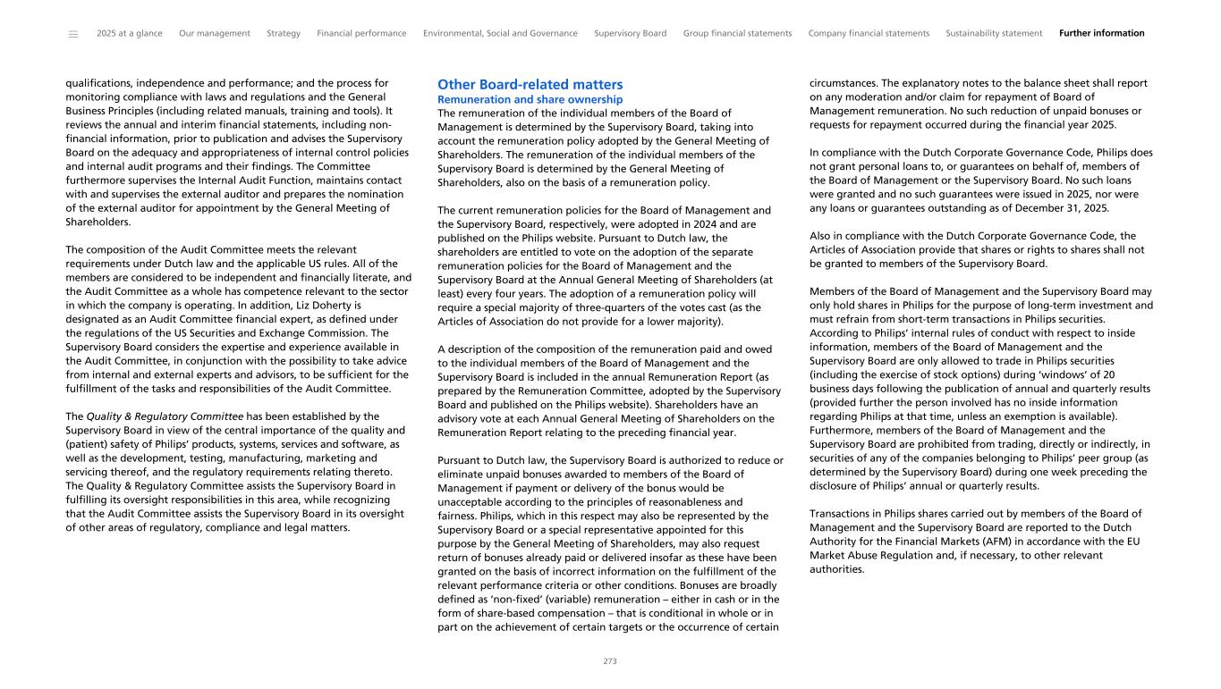 qualifications, independence and performance; and the process for monitoring compliance with laws and regulations and the General Business Principles (including related manuals, training and tools). It reviews the annual and interim financial statements, including non- financial information, prior to publication and advises the Supervisory Board on the adequacy and appropriateness of internal control policies and internal audit programs and their findings. The Committee furthermore supervises the Internal Audit Function, maintains contact with and supervises the external auditor and prepares the nomination of the external auditor for appointment by the General Meeting of Shareholders. The composition of the Audit Committee meets the relevant requirements under Dutch law and the applicable US rules. All of the members are considered to be independent and financially literate, and the Audit Committee as a whole has competence relevant to the sector in which the company is operating. In addition, Liz Doherty is designated as an Audit Committee financial expert, as defined under the regulations of the US Securities and Exchange Commission. The Supervisory Board considers the expertise and experience available in the Audit Committee, in conjunction with the possibility to take advice from internal and external experts and advisors, to be sufficient for the fulfillment of the tasks and responsibilities of the Audit Committee. The Quality & Regulatory Committee has been established by the Supervisory Board in view of the central importance of the quality and (patient) safety of Philips’ products, systems, services and software, as well as the development, testing, manufacturing, marketing and servicing thereof, and the regulatory requirements relating thereto. The Quality & Regulatory Committee assists the Supervisory Board in fulfilling its oversight responsibilities in this area, while recognizing that the Audit Committee assists the Supervisory Board in its oversight of other areas of regulatory, compliance and legal matters. Other Board-related matters Remuneration and share ownership The remuneration of the individual members of the Board of Management is determined by the Supervisory Board, taking into account the remuneration policy adopted by the General Meeting of Shareholders. The remuneration of the individual members of the Supervisory Board is determined by the General Meeting of Shareholders, also on the basis of a remuneration policy. The current remuneration policies for the Board of Management and the Supervisory Board, respectively, were adopted in 2024 and are published on the Philips website. Pursuant to Dutch law, the shareholders are entitled to vote on the adoption of the separate remuneration policies for the Board of Management and the Supervisory Board at the Annual General Meeting of Shareholders (at least) every four years. The adoption of a remuneration policy will require a special majority of three-quarters of the votes cast (as the Articles of Association do not provide for a lower majority). A description of the composition of the remuneration paid and owed to the individual members of the Board of Management and the Supervisory Board is included in the annual Remuneration Report (as prepared by the Remuneration Committee, adopted by the Supervisory Board and published on the Philips website). Shareholders have an advisory vote at each Annual General Meeting of Shareholders on the Remuneration Report relating to the preceding financial year. Pursuant to Dutch law, the Supervisory Board is authorized to reduce or eliminate unpaid bonuses awarded to members of the Board of Management if payment or delivery of the bonus would be unacceptable according to the principles of reasonableness and fairness. Philips, which in this respect may also be represented by the Supervisory Board or a special representative appointed for this purpose by the General Meeting of Shareholders, may also request return of bonuses already paid or delivered insofar as these have been granted on the basis of incorrect information on the fulfillment of the relevant performance criteria or other conditions. Bonuses are broadly defined as ‘non-fixed’ (variable) remuneration – either in cash or in the form of share-based compensation – that is conditional in whole or in part on the achievement of certain targets or the occurrence of certain circumstances. The explanatory notes to the balance sheet shall report on any moderation and/or claim for repayment of Board of Management remuneration. No such reduction of unpaid bonuses or requests for repayment occurred during the financial year 2025. In compliance with the Dutch Corporate Governance Code, Philips does not grant personal loans to, or guarantees on behalf of, members of the Board of Management or the Supervisory Board. No such loans were granted and no such guarantees were issued in 2025, nor were any loans or guarantees outstanding as of December 31, 2025. Also in compliance with the Dutch Corporate Governance Code, the Articles of Association provide that shares or rights to shares shall not be granted to members of the Supervisory Board. Members of the Board of Management and the Supervisory Board may only hold shares in Philips for the purpose of long-term investment and must refrain from short-term transactions in Philips securities. According to Philips’ internal rules of conduct with respect to inside information, members of the Board of Management and the Supervisory Board are only allowed to trade in Philips securities (including the exercise of stock options) during ‘windows’ of 20 business days following the publication of annual and quarterly results (provided further the person involved has no inside information regarding Philips at that time, unless an exemption is available). Furthermore, members of the Board of Management and the Supervisory Board are prohibited from trading, directly or indirectly, in secur