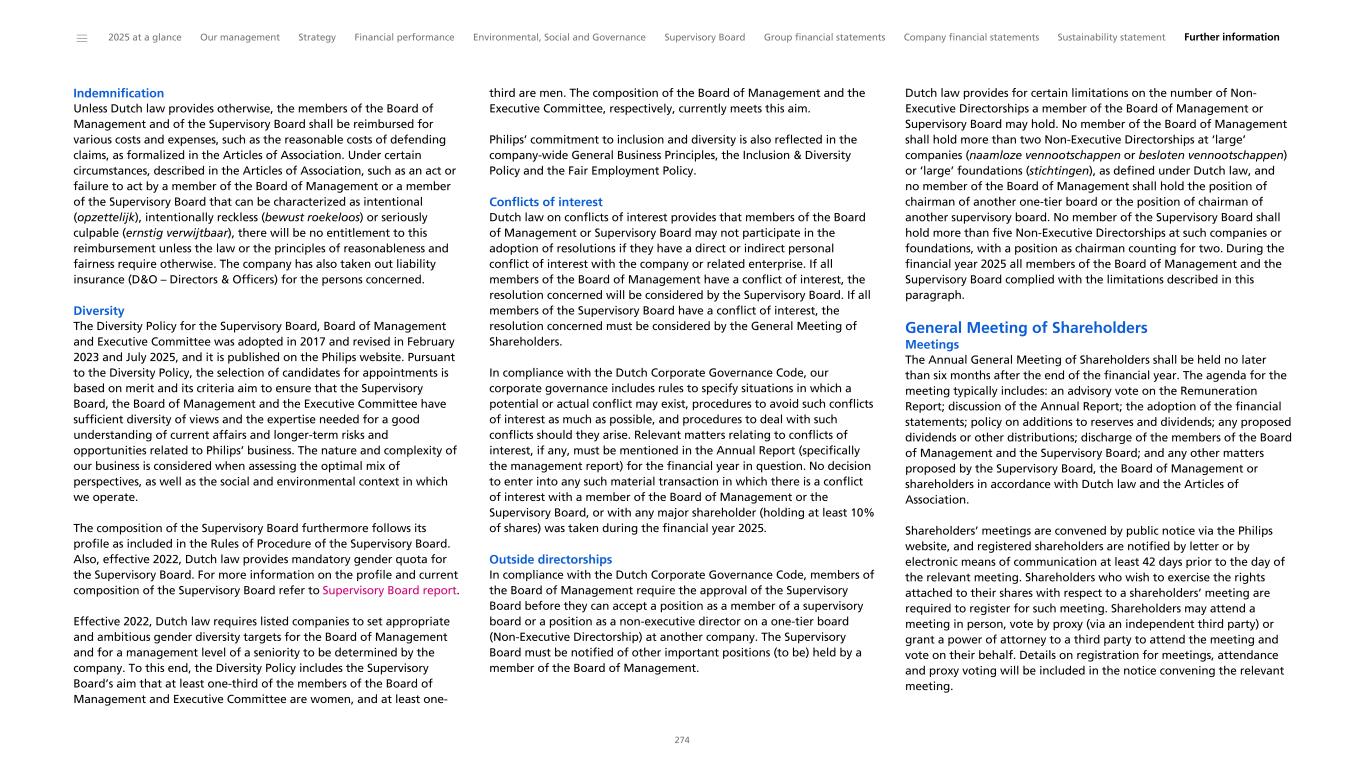Indemnification Unless Dutch law provides otherwise, the members of the Board of Management and of the Supervisory Board shall be reimbursed for various costs and expenses, such as the reasonable costs of defending claims, as formalized in the Articles of Association. Under certain circumstances, described in the Articles of Association, such as an act or failure to act by a member of the Board of Management or a member of the Supervisory Board that can be characterized as intentional (opzettelijk), intentionally reckless (bewust roekeloos) or seriously culpable (ernstig verwijtbaar), there will be no entitlement to this reimbursement unless the law or the principles of reasonableness and fairness require otherwise. The company has also taken out liability insurance (D&O – Directors & Officers) for the persons concerned. Diversity The Diversity Policy for the Supervisory Board, Board of Management and Executive Committee was adopted in 2017 and revised in February 2023 and July 2025, and it is published on the Philips website. Pursuant to the Diversity Policy, the selection of candidates for appointments is based on merit and its criteria aim to ensure that the Supervisory Board, the Board of Management and the Executive Committee have sufficient diversity of views and the expertise needed for a good understanding of current affairs and longer-term risks and opportunities related to Philips’ business. The nature and complexity of our business is considered when assessing the optimal mix of perspectives, as well as the social and environmental context in which we operate. The composition of the Supervisory Board furthermore follows its profile as included in the Rules of Procedure of the Supervisory Board. Also, effective 2022, Dutch law provides mandatory gender quota for the Supervisory Board. For more information on the profile and current composition of the Supervisory Board refer to Supervisory Board report. Effective 2022, Dutch law requires listed companies to set appropriate and ambitious gender diversity targets for the Board of Management and for a management level of a seniority to be determined by the company. To this end, the Diversity Policy includes the Supervisory Board’s aim that at least one-third of the members of the Board of Management and Executive Committee are women, and at least one- third are men. The composition of the Board of Management and the Executive Committee, respectively, currently meets this aim. Philips’ commitment to inclusion and diversity is also reflected in the company-wide General Business Principles, the Inclusion & Diversity Policy and the Fair Employment Policy. Conflicts of interest Dutch law on conflicts of interest provides that members of the Board of Management or Supervisory Board may not participate in the adoption of resolutions if they have a direct or indirect personal conflict of interest with the company or related enterprise. If all members of the Board of Management have a conflict of interest, the resolution concerned will be considered by the Supervisory Board. If all members of the Supervisory Board have a conflict of interest, the resolution concerned must be considered by the General Meeting of Shareholders. In compliance with the Dutch Corporate Governance Code, our corporate governance includes rules to specify situations in which a potential or actual conflict may exist, procedures to avoid such conflicts of interest as much as possible, and procedures to deal with such conflicts should they arise. Relevant matters relating to conflicts of interest, if any, must be mentioned in the Annual Report (specifically the management report) for the financial year in question. No decision to enter into any such material transaction in which there is a conflict of interest with a member of the Board of Management or the Supervisory Board, or with any major shareholder (holding at least 10% of shares) was taken during the financial year 2025. Outside directorships In compliance with the Dutch Corporate Governance Code, members of the Board of Management require the approval of the Supervisory Board before they can accept a position as a member of a supervisory board or a position as a non-executive director on a one-tier board (Non-Executive Directorship) at another company. The Supervisory Board must be notified of other important positions (to be) held by a member of the Board of Management. Dutch law provides for certain limitations on the number of Non- Executive Directorships a member of the Board of Management or Supervisory Board may hold. No member of the Board of Management shall hold more than two Non-Executive Directorships at ‘large’ companies (naamloze vennootschappen or besloten vennootschappen) or ‘large’ foundations (stichtingen), as defined under Dutch law, and no member of the Board of Management shall hold the position of chairman of another one-tier board or the position of chairman of another supervisory board. No member of the Supervisory Board shall hold more than five Non-Executive Directorships at such companies or foundations, with a position as chairman counting for two. During the financial year 2025 all members of the Board of Management and the Supervisory Board complied with the limitations described in this paragraph. General Meeting of Shareholders Meetings The Annual General Meeting of Shareholders shall be held no later than six months after the end of the financial year. The agenda for the meeting typically includes: an advisory vote on the Remuneration Report; discussion of the Annual Report; the adoption of the financial statements; policy on additions to reserves and dividends; any proposed dividends or other distributions; discharge of the members of the Board of Management and the Supervisory Board; and any other matters proposed by the Supervisory Board, the Board of Management or shareholders in accordance with Dutch law and the Articles of Association. Shareholders’ meeti