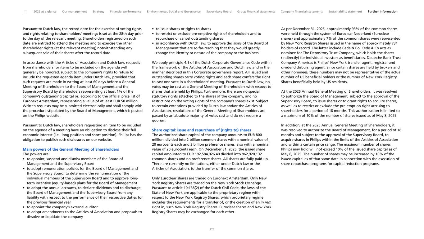 Pursuant to Dutch law, the record date for the exercise of voting rights and rights relating to shareholders’ meetings is set at the 28th day prior to the day of the relevant meeting. Shareholders registered on such date are entitled to attend the meeting and to exercise the other shareholder rights (at the relevant meeting) notwithstanding any subsequent sale of their shares after the record date. In accordance with the Articles of Association and Dutch law, requests from shareholders for items to be included on the agenda will generally be honored, subject to the company’s rights to refuse to include the requested agenda item under Dutch law, provided that such requests are made in writing at least 60 days before a General Meeting of Shareholders to the Board of Management and the Supervisory Board by shareholders representing at least 1% of the company’s outstanding capital or, according to the official price list of Euronext Amsterdam, representing a value of at least EUR 50 million. Written requests may be submitted electronically and shall comply with the procedure stipulated by the Board of Management, which is posted on the Philips website. Pursuant to Dutch law, shareholders requesting an item to be included on the agenda of a meeting have an obligation to disclose their full economic interest (i.e., long position and short position). Philips has the obligation to publish such disclosures on our website. Main powers of the General Meeting of Shareholders The powers are: • to appoint, suspend and dismiss members of the Board of Management and the Supervisory Board • to adopt remuneration policies for the Board of Management and the Supervisory Board, to determine the remuneration of the individual members of the Supervisory Board and to approve long- term incentive (equity-based) plans for the Board of Management • to adopt the annual accounts, to declare dividends and to discharge the Board of Management and the Supervisory Board from any liability with respect to the performance of their respective duties for the previous financial year • to appoint the company’s external auditor • to adopt amendments to the Articles of Association and proposals to dissolve or liquidate the company • to issue shares or rights to shares • to restrict or exclude pre-emptive rights of shareholders and to repurchase or cancel outstanding shares • in accordance with Dutch law, to approve decisions of the Board of Management that are so far-reaching that they would greatly change the identity or nature of the company or the business We apply principle 4.1 of the Dutch Corporate Governance Code within the framework of the Articles of Association and Dutch law and in the manner described in this Corporate governance report. All issued and outstanding shares carry voting rights and each share confers the right to cast one vote in a shareholders’ meeting. Pursuant to Dutch law, no votes may be cast at a General Meeting of Shareholders with respect to shares that are held by Philips. Furthermore, there are no special statutory rights attached to the shares of the company, and no restrictions on the voting rights of the company’s shares exist. Subject to certain exceptions provided by Dutch law and/or the Articles of Association, resolutions of the General Meeting of Shareholders are passed by an absolute majority of votes cast and do not require a quorum. Share capital: issue and repurchase of (rights to) shares The authorized share capital of the company amounts to EUR 800 million, divided into 2 billion common shares with a nominal value of 20 eurocents each and 2 billion preference shares, also with a nominal value of 20 eurocents each. On December 31, 2025, the issued share capital amounted to EUR 192,584,026.40 divided into 962,920,132 common shares and no preference shares. All shares are fully paid-up. There are currently no limitations, either under Dutch law or the Articles of Association, to the transfer of the common shares. Only Euroclear shares are traded on Euronext Amsterdam. Only New York Registry Shares are traded on the New York Stock Exchange. Pursuant to article 10:138(2) of the Dutch Civil Code, the laws of the State of New York are applicable to the proprietary regime with respect to the New York Registry Shares, which proprietary regime includes the requirements for a transfer of, or the creation of an in rem right in, such New York Registry Shares. Euroclear shares and New York Registry Shares may be exchanged for each other. As per December 31, 2025, approximately 93% of the common shares were held through the system of Euroclear Nederland (Euroclear shares) and approximately 7% of the common shares were represented by New York Registry Shares issued in the name of approximately 731 holders of record. The latter include Cede & Co. Cede & Co acts as nominee for The Depository Trust Company, which holds the shares (indirectly) for individual investors as beneficiaries. Deutsche Bank Trust Company Americas is Philips’ New York transfer agent, registrar and dividend disbursing agent. Since certain shares are held by brokers and other nominees, these numbers may not be representative of the actual number of US beneficial holders or the number of New York Registry Shares beneficially held by US residents. At the 2025 Annual General Meeting of Shareholders, it was resolved to authorize the Board of Management, subject to the approval of the Supervisory Board, to issue shares or to grant rights to acquire shares, as well as to restrict or exclude the pre-emption right accruing to shareholders for a period of 18 months. This authorization is limited to a maximum of 10% of the number of shares issued as of May 8, 2025. In addition, at the 2025 Annual General Meeting of Shareholders, it was resolved to authorize the Board of Management, for a period of 18 months and subject to the approval of the Supervisory Board, to acquire shares in Philips within the limits 