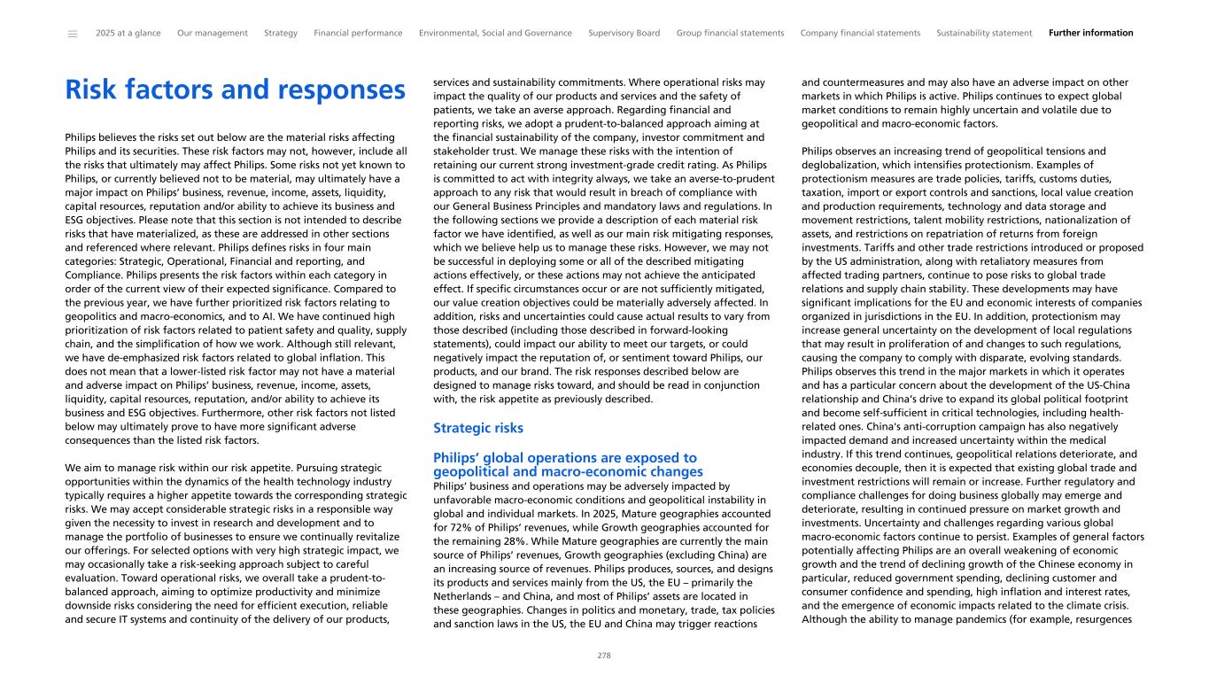 Risk factors and responses Philips believes the risks set out below are the material risks affecting Philips and its securities. These risk factors may not, however, include all the risks that ultimately may affect Philips. Some risks not yet known to Philips, or currently believed not to be material, may ultimately have a major impact on Philips’ business, revenue, income, assets, liquidity, capital resources, reputation and/or ability to achieve its business and ESG objectives. Please note that this section is not intended to describe risks that have materialized, as these are addressed in other sections and referenced where relevant. Philips defines risks in four main categories: Strategic, Operational, Financial and reporting, and Compliance. Philips presents the risk factors within each category in order of the current view of their expected significance. Compared to the previous year, we have further prioritized risk factors relating to geopolitics and macro-economics, and to AI. We have continued high prioritization of risk factors related to patient safety and quality, supply chain, and the simplification of how we work. Although still relevant, we have de-emphasized risk factors related to global inflation. This does not mean that a lower-listed risk factor may not have a material and adverse impact on Philips’ business, revenue, income, assets, liquidity, capital resources, reputation, and/or ability to achieve its business and ESG objectives. Furthermore, other risk factors not listed below may ultimately prove to have more significant adverse consequences than the listed risk factors. We aim to manage risk within our risk appetite. Pursuing strategic opportunities within the dynamics of the health technology industry typically requires a higher appetite towards the corresponding strategic risks. We may accept considerable strategic risks in a responsible way given the necessity to invest in research and development and to manage the portfolio of businesses to ensure we continually revitalize our offerings. For selected options with very high strategic impact, we may occasionally take a risk-seeking approach subject to careful evaluation. Toward operational risks, we overall take a prudent-to- balanced approach, aiming to optimize productivity and minimize downside risks considering the need for efficient execution, reliable and secure IT systems and continuity of the delivery of our products, services and sustainability commitments. Where operational risks may impact the quality of our products and services and the safety of patients, we take an averse approach. Regarding financial and reporting risks, we adopt a prudent-to-balanced approach aiming at the financial sustainability of the company, investor commitment and stakeholder trust. We manage these risks with the intention of retaining our current strong investment-grade credit rating. As Philips is committed to act with integrity always, we take an averse-to-prudent approach to any risk that would result in breach of compliance with our General Business Principles and mandatory laws and regulations. In the following sections we provide a description of each material risk factor we have identified, as well as our main risk mitigating responses, which we believe help us to manage these risks. However, we may not be successful in deploying some or all of the described mitigating actions effectively, or these actions may not achieve the anticipated effect. If specific circumstances occur or are not sufficiently mitigated, our value creation objectives could be materially adversely affected. In addition, risks and uncertainties could cause actual results to vary from those described (including those described in forward-looking statements), could impact our ability to meet our targets, or could negatively impact the reputation of, or sentiment toward Philips, our products, and our brand. The risk responses described below are designed to manage risks toward, and should be read in conjunction with, the risk appetite as previously described. Strategic risks Philips’ global operations are exposed to geopolitical and macro-economic changes Philips’ business and operations may be adversely impacted by unfavorable macro-economic conditions and geopolitical instability in global and individual markets. In 2025, Mature geographies accounted for 72% of Philips’ revenues, while Growth geographies accounted for the remaining 28%. While Mature geographies are currently the main source of Philips’ revenues, Growth geographies (excluding China) are an increasing source of revenues. Philips produces, sources, and designs its products and services mainly from the US, the EU – primarily the Netherlands – and China, and most of Philips’ assets are located in these geographies. Changes in politics and monetary, trade, tax policies and sanction laws in the US, the EU and China may trigger reactions and countermeasures and may also have an adverse impact on other markets in which Philips is active. Philips continues to expect global market conditions to remain highly uncertain and volatile due to geopolitical and macro-economic factors. Philips observes an increasing trend of geopolitical tensions and deglobalization, which intensifies protectionism. Examples of protectionism measures are trade policies, tariffs, customs duties, taxation, import or export controls and sanctions, local value creation and production requirements, technology and data storage and movement restrictions, talent mobility restrictions, nationalization of assets, and restrictions on repatriation of returns from foreign investments. Tariffs and other trade restrictions introduced or proposed by the US administration, along with retaliatory measures from affected trading partners, continue to pose risks to global trade relations and supply chain stability. These developments may have significant implications for the EU and economic interests of companies 