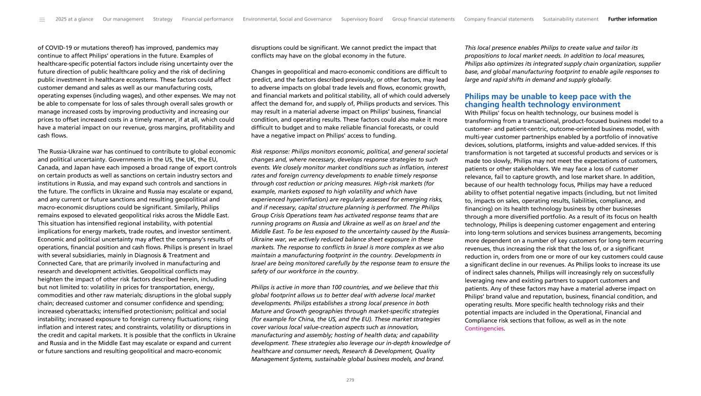 of COVID-19 or mutations thereof) has improved, pandemics may continue to affect Philips’ operations in the future. Examples of healthcare-specific potential factors include rising uncertainty over the future direction of public healthcare policy and the risk of declining public investment in healthcare ecosystems. These factors could affect customer demand and sales as well as our manufacturing costs, operating expenses (including wages), and other expenses. We may not be able to compensate for loss of sales through overall sales growth or manage increased costs by improving productivity and increasing our prices to offset increased costs in a timely manner, if at all, which could have a material impact on our revenue, gross margins, profitability and cash flows. The Russia-Ukraine war has continued to contribute to global economic and political uncertainty. Governments in the US, the UK, the EU, Canada, and Japan have each imposed a broad range of export controls on certain products as well as sanctions on certain industry sectors and institutions in Russia, and may expand such controls and sanctions in the future. The conflicts in Ukraine and Russia may escalate or expand, and any current or future sanctions and resulting geopolitical and macro-economic disruptions could be significant. Similarly, Philips remains exposed to elevated geopolitical risks across the Middle East. This situation has intensified regional instability, with potential implications for energy markets, trade routes, and investor sentiment. Economic and political uncertainty may affect the company’s results of operations, financial position and cash flows. Philips is present in Israel with several subsidiaries, mainly in Diagnosis & Treatment and Connected Care, that are primarily involved in manufacturing and research and development activities. Geopolitical conflicts may heighten the impact of other risk factors described herein, including but not limited to: volatility in prices for transportation, energy, commodities and other raw materials; disruptions in the global supply chain; decreased customer and consumer confidence and spending; increased cyberattacks; intensified protectionism; political and social instability; increased exposure to foreign currency fluctuations; rising inflation and interest rates; and constraints, volatility or disruptions in the credit and capital markets. It is possible that the conflicts in Ukraine and Russia and in the Middle East may escalate or expand and current or future sanctions and resulting geopolitical and macro-economic disruptions could be significant. We cannot predict the impact that conflicts may have on the global economy in the future. Changes in geopolitical and macro-economic conditions are difficult to predict, and the factors described previously, or other factors, may lead to adverse impacts on global trade levels and flows, economic growth, and financial markets and political stability, all of which could adversely affect the demand for, and supply of, Philips products and services. This may result in a material adverse impact on Philips’ business, financial condition, and operating results. These factors could also make it more difficult to budget and to make reliable financial forecasts, or could have a negative impact on Philips’ access to funding. Risk response: Philips monitors economic, political, and general societal changes and, where necessary, develops response strategies to such events. We closely monitor market conditions such as inflation, interest rates and foreign currency developments to enable timely response through cost reduction or pricing measures. High-risk markets (for example, markets exposed to high volatility and which have experienced hyperinflation) are regularly assessed for emerging risks, and if necessary, capital structure planning is performed. The Philips Group Crisis Operations team has activated response teams that are running programs on Russia and Ukraine as well as on Israel and the Middle East. To be less exposed to the uncertainty caused by the Russia- Ukraine war, we actively reduced balance sheet exposure in these markets. The response to conflicts in Israel is more complex as we also maintain a manufacturing footprint in the country. Developments in Israel are being monitored carefully by the response team to ensure the safety of our workforce in the country. Philips is active in more than 100 countries, and we believe that this global footprint allows us to better deal with adverse local market developments. Philips establishes a strong local presence in both Mature and Growth geographies through market-specific strategies (for example for China, the US, and the EU). These market strategies cover various local value-creation aspects such as innovation, manufacturing and assembly; hosting of health data; and capability development. These strategies also leverage our in-depth knowledge of healthcare and consumer needs, Research & Development, Quality Management Systems, sustainable global business models, and brand. This local presence enables Philips to create value and tailor its propositions to local market needs. In addition to local measures, Philips also optimizes its integrated supply chain organization, supplier base, and global manufacturing footprint to enable agile responses to large and rapid shifts in demand and supply globally. Philips may be unable to keep pace with the changing health technology environment With Philips’ focus on health technology, our business model is transforming from a transactional, product-focused business model to a customer- and patient-centric, outcome-oriented business model, with multi-year customer partnerships enabled by a portfolio of innovative devices, solutions, platforms, insights and value-added services. If this transformation is not targeted at successful products and services or is made too slowly, Philips may not meet the expectations of customers, p