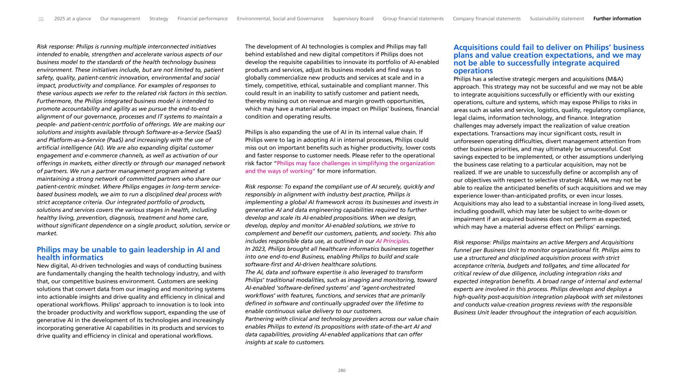 Risk response: Philips is running multiple interconnected initiatives intended to enable, strengthen and accelerate various aspects of our business model to the standards of the health technology business environment. These initiatives include, but are not limited to, patient safety, quality, patient-centric innovation, environmental and social impact, productivity and compliance. For examples of responses to these various aspects we refer to the related risk factors in this section. Furthermore, the Philips integrated business model is intended to promote accountability and agility as we pursue the end-to-end alignment of our governance, processes and IT systems to maintain a people- and patient-centric portfolio of offerings. We are making our solutions and insights available through Software-as-a-Service (SaaS) and Platform-as-a-Service (PaaS) and increasingly with the use of artificial intelligence (AI). We are also expanding digital customer engagement and e-commerce channels, as well as activation of our offerings in markets, either directly or through our managed network of partners. We run a partner management program aimed at maintaining a strong network of committed partners who share our patient-centric mindset. Where Philips engages in long-term service- based business models, we aim to run a disciplined deal process with strict acceptance criteria. Our integrated portfolio of products, solutions and services covers the various stages in health, including healthy living, prevention, diagnosis, treatment and home care, without significant dependence on a single product, solution, service or market. Philips may be unable to gain leadership in AI and health informatics New digital, AI-driven technologies and ways of conducting business are fundamentally changing the health technology industry, and with that, our competitive business environment. Customers are seeking solutions that convert data from our imaging and monitoring systems into actionable insights and drive quality and efficiency in clinical and operational workflows. Philips’ approach to innovation is to look into the broader productivity and workflow support, expanding the use of generative AI in the development of its technologies and increasingly incorporating generative AI capabilities in its products and services to drive quality and efficiency in clinical and operational workflows. The development of AI technologies is complex and Philips may fall behind established and new digital competitors if Philips does not develop the requisite capabilities to innovate its portfolio of AI-enabled products and services, adjust its business models and find ways to globally commercialize new products and services at scale and in a timely, competitive, ethical, sustainable and compliant manner. This could result in an inability to satisfy customer and patient needs, thereby missing out on revenue and margin growth opportunities, which may have a material adverse impact on Philips’ business, financial condition and operating results. Philips is also expanding the use of AI in its internal value chain. If Philips were to lag in adopting AI in internal processes, Philips could miss out on important benefits such as higher productivity, lower costs and faster response to customer needs. Please refer to the operational risk factor “Philips may face challenges in simplifying the organization and the ways of working” for more information. Risk response: To expand the compliant use of AI securely, quickly and responsibly in alignment with industry best practice, Philips is implementing a global AI framework across its businesses and invests in generative AI and data engineering capabilities required to further develop and scale its AI-enabled propositions. When we design, develop, deploy and monitor AI-enabled solutions, we strive to complement and benefit our customers, patients, and society. This also includes responsible data use, as outlined in our AI Principles. In 2023, Philips brought all healthcare informatics businesses together into one end-to-end Business, enabling Philips to build and scale software-first and AI-driven healthcare solutions. The AI, data and software expertise is also leveraged to transform Philips’ traditional modalities, such as imaging and monitoring, toward AI-enabled ‘software-defined systems’ and ‘agent-orchestrated workflows’ with features, functions, and services that are primarily defined in software and continually upgraded over the lifetime to enable continuous value delivery to our customers. Partnering with clinical and technology providers across our value chain enables Philips to extend its propositions with state-of-the-art AI and data capabilities, providing AI-enabled applications that can offer insights at scale to customers. Acquisitions could fail to deliver on Philips’ business plans and value creation expectations, and we may not be able to successfully integrate acquired operations Philips has a selective strategic mergers and acquisitions (M&A) approach. This strategy may not be successful and we may not be able to integrate acquisitions successfully or efficiently with our existing operations, culture and systems, which may expose Philips to risks in areas such as sales and service, logistics, quality, regulatory compliance, legal claims, information technology, and finance. Integration challenges may adversely impact the realization of value creation expectations. Transactions may incur significant costs, result in unforeseen operating difficulties, divert management attention from other business priorities, and may ultimately be unsuccessful. Cost savings expected to be implemented, or other assumptions underlying the business case relating to a particular acquisition, may not be realized. If we are unable to successfully define or accomplish any of our objectives with respect to selective strategic M&A, we may not be able to realize the anticipated benefits