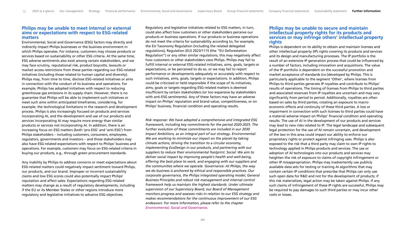 Philips may be unable to meet internal or external aims or expectations with respect to ESG-related matters Environmental, Social and Governance (ESG) factors may directly and indirectly impact Philips businesses or the business environment in which Philips operates. For instance, customers may choose products or services based on sustainability or other ESG criteria. At the same time, ESG adverse sentiments also exist among certain stakeholders, and we may face scrutiny, reputational risk, product boycotts, lawsuits or market access restrictions from these parties regarding our ESG-related initiatives (including those related to human capital and diversity). Philips may, from time to time, disclose ESG-related initiatives or aims in connection with the conduct of its business and operations. For example, Philips has adopted initiatives with respect to reducing greenhouse gas emissions in its supply chain. However, there is no guarantee that Philips will be able to implement such initiatives or meet such aims within anticipated timeframes, considering, for example, the technological limitations in the research and development process. Philips is also increasingly focused on products and services incorporating AI, and the development and use of our products and services incorporating AI may require more energy than similar products or services not incorporating AI. In addition, there is an increasing focus on ESG matters (both ‘pro-ESG’ and ‘anti-ESG’) from Philips stakeholders – including customers, consumers, employees, regulators, governments and investors – and those stakeholders may also have ESG-related expectations with respect to Philips’ business and operations. For example, customers may focus on ESG-related criteria in buying our products, e.g., through green procurement standards. Any inability by Philips to address concerns or meet expectations about ESG-related matters could negatively impact sentiment toward Philips, our products, and our brand. Improper or incorrect sustainability claims and low ESG scores could also potentially impact Philips’ reputation and affect sales. Expectations regarding ESG-related matters may change as a result of regulatory developments, including if the EU or its Member States or other regions introduce more regulatory and legislative initiatives to advance ESG objectives. Regulatory and legislative initiatives related to ESG matters, in turn, could also affect how customers or other stakeholders perceive our products or business operations. If our products or business operations do not meet the criteria for sustainability according to, for example, the EU Taxonomy Regulation (including the related delegated regulations), Regulation (EU) 2023/1115 (the “EU Deforestation Regulation”) or any other similar regulations, this may negatively affect how customers or other stakeholders view Philips. Philips may fail to fulfill internal or external ESG-related initiatives, aims, goals, targets or expectations, or be perceived to do so, or we may fail to report performance or developments adequately or accurately with respect to such initiatives, aims, goals, targets or expectations. In addition, Philips could be criticized or held responsible if the scope of its initiatives, aims, goals or targets regarding ESG-related matters is deemed insufficient by certain stakeholders (or too expansive by stakeholders with anti-ESG sentiments). Any of these factors may have an adverse impact on Philips’ reputation and brand value, competitiveness, or on Philips’ business, financial condition and operating results. Risk response: We have adopted a comprehensive and integrated ESG framework, including key commitments for the period 2020-2025. The further evolution of these commitments are included in our 2030 Impact Ambitions, as an integral part of our strategy. Environmental: We are working to minimize our impact on the planet by taking climate actions, driving the transition to a circular economy, implementing EcoDesign in our products, and partnering with our suppliers to reduce their environmental footprint. Social: We aim to deliver social impact by improving people’s health and well-being, offering the best place to work, and engaging with our suppliers and the communities where we operate. Governance: At Philips, the way we do business is anchored by ethical and responsible practices. Our corporate governance, the Philips integrated operating model, General Business Principles and robust risk management and internal control framework help us maintain the highest standards. Under ultimate supervision of our Supervisory Board, our Board of Management monitors progress and assesses risks in relation to our ESG strategy and makes recommendations for the continuous improvement of our ESG endeavors. For more information, please refer to the chapter Environmental, Social and Governance. Philips may be unable to secure and maintain intellectual property rights for its products and services or may infringe others’ intellectual property rights Philips is dependent on its ability to obtain and maintain licenses and other intellectual property (IP) rights covering its products and services and its design and manufacturing processes. The IP portfolio is the result of an extensive IP generation process that could be influenced by a number of factors, including innovation and acquisitions. The value of the IP portfolio is dependent on the successful promotion and market acceptance of standards (co-)developed by Philips. This is particularly applicable to the segment ‘Other’, where licenses from Philips to third parties generate IP royalties and contribute to Philips’ results of operations. The timing of licenses from Philips to third parties and associated revenues from IP royalties are uncertain and may vary significantly from period to period. Additionally, royalties are often based on sales by third parties, creating an exposure to macro