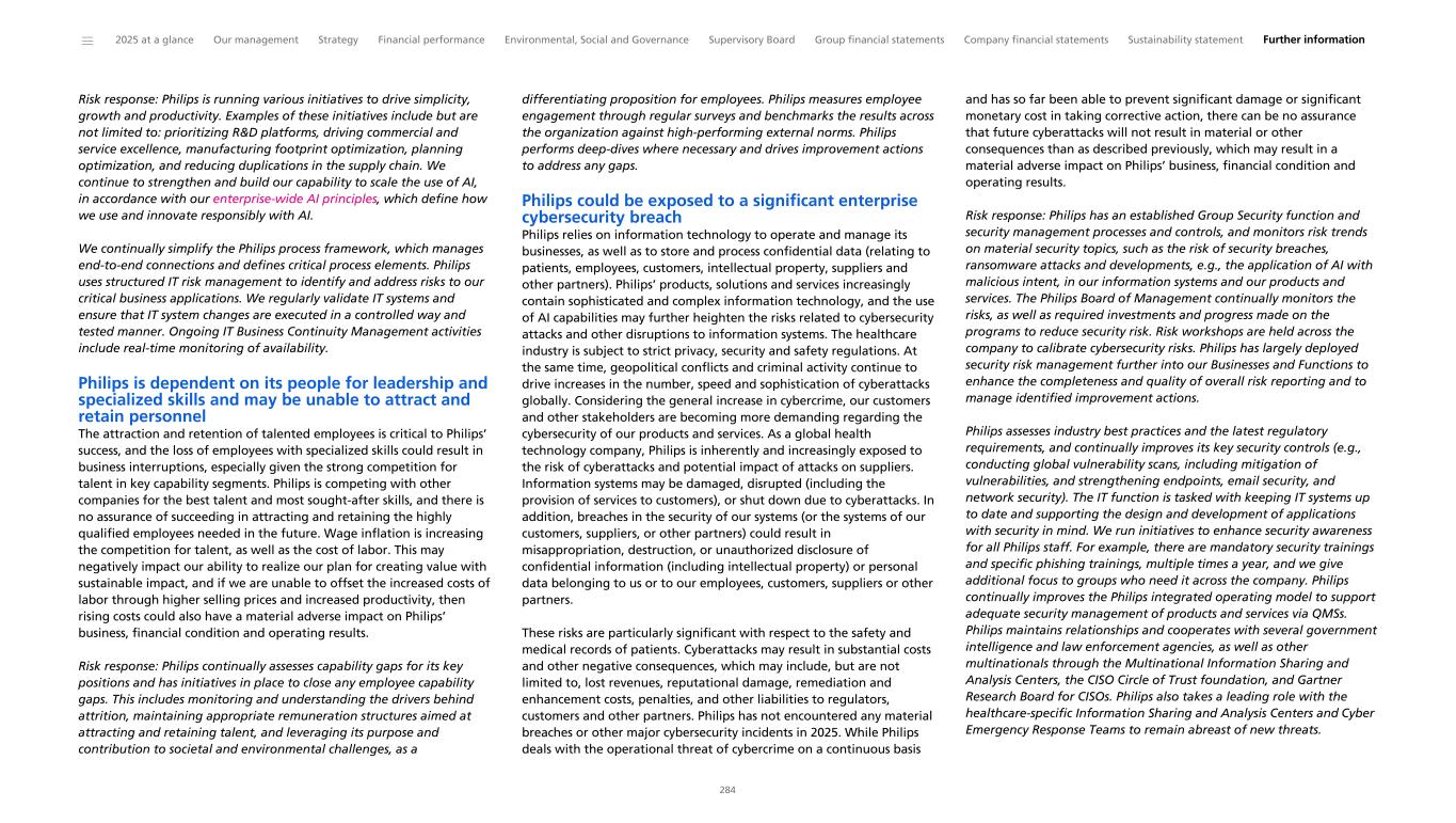Risk response: Philips is running various initiatives to drive simplicity, growth and productivity. Examples of these initiatives include but are not limited to: prioritizing R&D platforms, driving commercial and service excellence, manufacturing footprint optimization, planning optimization, and reducing duplications in the supply chain. We continue to strengthen and build our capability to scale the use of AI, in accordance with our enterprise-wide AI principles, which define how we use and innovate responsibly with AI. We continually simplify the Philips process framework, which manages end-to-end connections and defines critical process elements. Philips uses structured IT risk management to identify and address risks to our critical business applications. We regularly validate IT systems and ensure that IT system changes are executed in a controlled way and tested manner. Ongoing IT Business Continuity Management activities include real-time monitoring of availability. Philips is dependent on its people for leadership and specialized skills and may be unable to attract and retain personnel The attraction and retention of talented employees is critical to Philips’ success, and the loss of employees with specialized skills could result in business interruptions, especially given the strong competition for talent in key capability segments. Philips is competing with other companies for the best talent and most sought-after skills, and there is no assurance of succeeding in attracting and retaining the highly qualified employees needed in the future. Wage inflation is increasing the competition for talent, as well as the cost of labor. This may negatively impact our ability to realize our plan for creating value with sustainable impact, and if we are unable to offset the increased costs of labor through higher selling prices and increased productivity, then rising costs could also have a material adverse impact on Philips’ business, financial condition and operating results. Risk response: Philips continually assesses capability gaps for its key positions and has initiatives in place to close any employee capability gaps. This includes monitoring and understanding the drivers behind attrition, maintaining appropriate remuneration structures aimed at attracting and retaining talent, and leveraging its purpose and contribution to societal and environmental challenges, as a differentiating proposition for employees. Philips measures employee engagement through regular surveys and benchmarks the results across the organization against high-performing external norms. Philips performs deep-dives where necessary and drives improvement actions to address any gaps. Philips could be exposed to a significant enterprise cybersecurity breach Philips relies on information technology to operate and manage its businesses, as well as to store and process confidential data (relating to patients, employees, customers, intellectual property, suppliers and other partners). Philips’ products, solutions and services increasingly contain sophisticated and complex information technology, and the use of AI capabilities may further heighten the risks related to cybersecurity attacks and other disruptions to information systems. The healthcare industry is subject to strict privacy, security and safety regulations. At the same time, geopolitical conflicts and criminal activity continue to drive increases in the number, speed and sophistication of cyberattacks globally. Considering the general increase in cybercrime, our customers and other stakeholders are becoming more demanding regarding the cybersecurity of our products and services. As a global health technology company, Philips is inherently and increasingly exposed to the risk of cyberattacks and potential impact of attacks on suppliers. Information systems may be damaged, disrupted (including the provision of services to customers), or shut down due to cyberattacks. In addition, breaches in the security of our systems (or the systems of our customers, suppliers, or other partners) could result in misappropriation, destruction, or unauthorized disclosure of confidential information (including intellectual property) or personal data belonging to us or to our employees, customers, suppliers or other partners. These risks are particularly significant with respect to the safety and medical records of patients. Cyberattacks may result in substantial costs and other negative consequences, which may include, but are not limited to, lost revenues, reputational damage, remediation and enhancement costs, penalties, and other liabilities to regulators, customers and other partners. Philips has not encountered any material breaches or other major cybersecurity incidents in 2025. While Philips deals with the operational threat of cybercrime on a continuous basis and has so far been able to prevent significant damage or significant monetary cost in taking corrective action, there can be no assurance that future cyberattacks will not result in material or other consequences than as described previously, which may result in a material adverse impact on Philips’ business, financial condition and operating results. Risk response: Philips has an established Group Security function and security management processes and controls, and monitors risk trends on material security topics, such as the risk of security breaches, ransomware attacks and developments, e.g., the application of AI with malicious intent, in our information systems and our products and services. The Philips Board of Management continually monitors the risks, as well as required investments and progress made on the programs to reduce security risk. Risk workshops are held across the company to calibrate cybersecurity risks. Philips has largely deployed security risk management further into our Businesses and Functions to enhance the completeness and quality of overall risk reporting and to manage identif