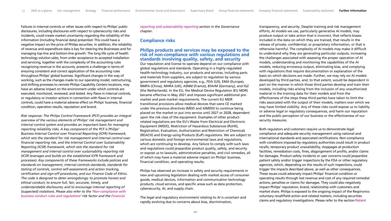 Failures in internal controls or other issues with respect to Philips’ public disclosures, including disclosures with respect to cybersecurity risks and incidents, could create market uncertainty regarding the reliability of the information (including financial data) presented. This could have a negative impact on the price of Philips securities. In addition, the reliability of revenue and expenditure data is key for steering the Businesses and for managing top-line and bottom-line growth. The long life cycle of health technology solution sales, from order acceptance to accepted installation and servicing, together with the complexity of the accounting rules recognizing revenue in the accounts, presents a challenge in terms of ensuring consistent and correct application of the accounting rules throughout Philips’ global business. Significant changes in the way of working, such as the changes made to our operating model, restructuring, and shifting processes to remote Philips Capability Centers locations, may have an adverse impact on the environment under which controls are executed, monitored, reviewed, and tested. Any flaws in internal controls, or regulatory or investor actions in connection with flaws in internal controls, could have a material adverse effect on Philips’ business, financial condition, operation results, reputation and brand. Risk response: The Philips Control Framework (PCF) provides an integral overview of the various elements of Philips’ risk management and internal control system and provides an important basis for managing reporting reliability risks. A key component of the PCF is Philips’ Business Internal Control over Financial Reporting (ICFR) framework, which sets the standard for risk management and internal control over financial reporting risk, and the Internal Control over Sustainability Reporting (ICSR) framework, which sets the standard for risk management and internal control over sustainability reporting risk (ICSR leverages and builds on the established ICFR framework and processes). Key components of these frameworks include policies and standards on management, internal controls standards, standards for testing of controls, control self-assessments and action tracking, certification and sign-off procedures, and our Finance Code of Ethics. The code is designed to deter wrongdoings; to promote honest and ethical conduct; to ensure full, fair, accurate, timely, and understandable disclosures; and to encourage internal reporting of (suspected) violations. Please also refer to the ‘Non-compliance with business conduct rules and regulations’ risk factor and the Financial reporting and sustainability reporting section in the Governance chapter. Compliance risks Philips products and services may be exposed to the risk of non-compliance with various regulations and standards involving quality, safety, and security Our reputation and license to operate depend on our compliance with global regulations and standards. Operating in a highly regulated health-technology industry, our products and services, including parts and materials from suppliers, are subject to regulation by various government and regulatory agencies, e.g., FDA (US), EMA (Europe), NMPA (China), MHRA (UK), ASNM (France), BfArM (Germany), and IGZ (the Netherlands). In the EU, the Medical Device Regulation (EU MDR) became effective in May 2021 and imposes significant additional pre- market and post-market requirements. The current EU MDR transitional provisions allow medical devices that were CE marked under the previous directives (MDD and AIMDD) to continue being placed on the market or put into service until 2027 or 2028, dependent upon the risk class of the equipment. Examples of other product- related regulations are the EU’s Waste from Electrical and Electronic Equipment (WEEE), Restriction of Hazardous Substances (RoHS), Registration, Evaluation, Authorization and Restriction of Chemicals (REACH) and Energy-using Products (EuP) regulations. We are subject to various domestic and foreign environmental laws and regulations, which are continuing to develop. Any failure to comply with such laws and regulations could jeopardize product quality, safety, and security or expose us to lawsuits, administrative penalties, and civil remedies, all of which may have a material adverse impact on Philips’ business, financial condition, and operating results. Philips has observed an increase in safety and security requirements in new and upcoming legislation dealing with market access of consumer goods, medical devices, information and communication technology products, cloud services, and specific areas such as data protection, cybersecurity, AI, and supply chain. The legal and regulatory environment relating to AI is uncertain and rapidly evolving due to concerns about bias, discrimination, transparency, and security. Despite training and risk management efforts, AI models we use, particularly generative AI models, may produce output or take action that is incorrect, that reflects biases included in the data on which they are trained, that results in the release of private, confidential, or proprietary information, or that is otherwise harmful. The complexity of AI models may make it difficult to understand why they are generating particular outputs, increasing the challenges associated with assessing the proper operation of AI models, understanding and monitoring the capabilities of the AI models, reducing erroneous output, eliminating bias, and complying with regulations that require documentation or explanation of the basis on which decisions are made. Further, we may rely on AI models developed by third parties, and, to that extent, would be dependent in part on the manner in which those third parties develop and train their models, including risks arising from the inclusion of any unauthorized material in the training data for their models and from the effectiveness of the steps t