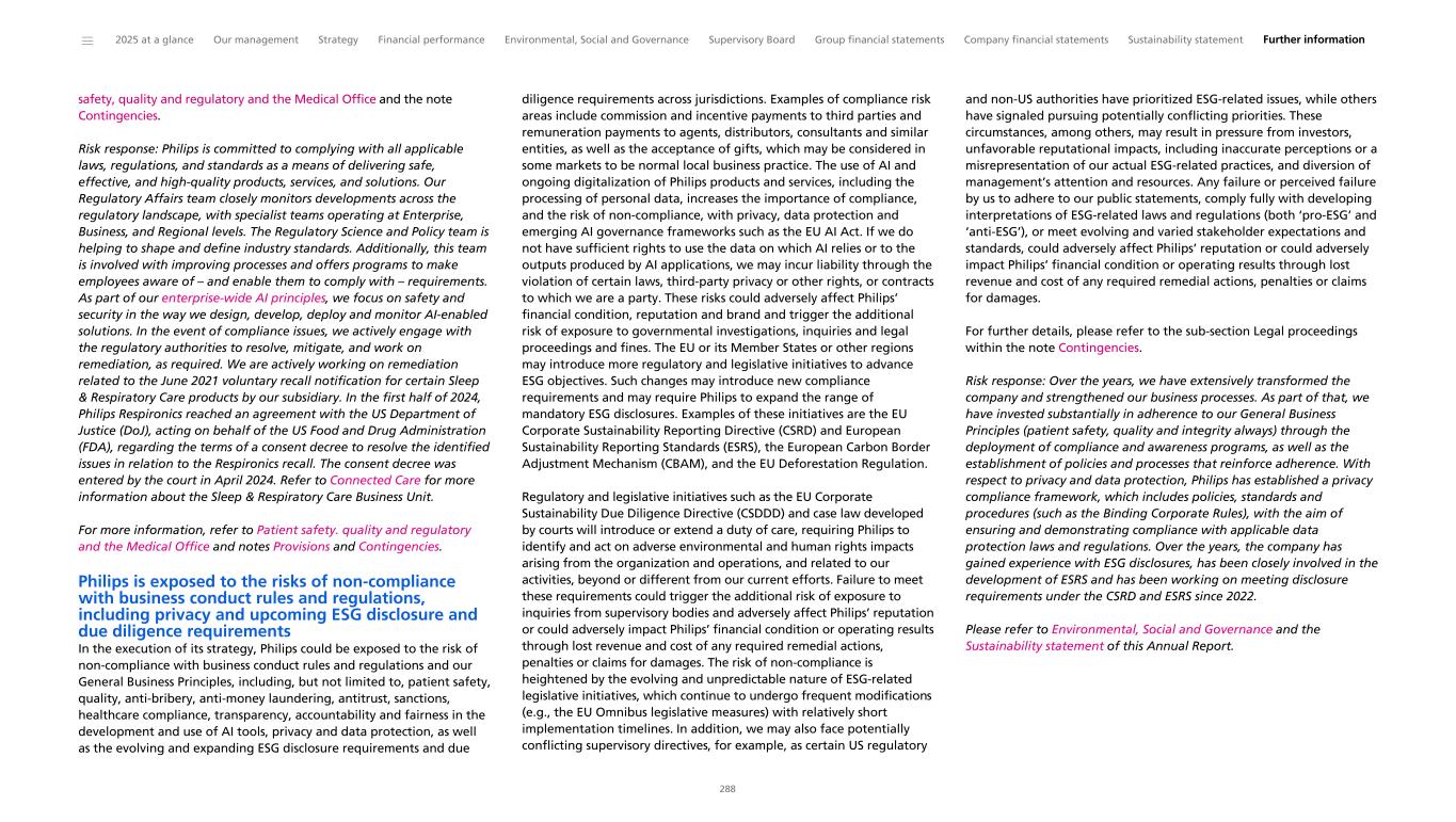 safety, quality and regulatory and the Medical Office and the note Contingencies. Risk response: Philips is committed to complying with all applicable laws, regulations, and standards as a means of delivering safe, effective, and high-quality products, services, and solutions. Our Regulatory Affairs team closely monitors developments across the regulatory landscape, with specialist teams operating at Enterprise, Business, and Regional levels. The Regulatory Science and Policy team is helping to shape and define industry standards. Additionally, this team is involved with improving processes and offers programs to make employees aware of – and enable them to comply with – requirements. As part of our enterprise-wide AI principles, we focus on safety and security in the way we design, develop, deploy and monitor AI-enabled solutions. In the event of compliance issues, we actively engage with the regulatory authorities to resolve, mitigate, and work on remediation, as required. We are actively working on remediation related to the June 2021 voluntary recall notification for certain Sleep & Respiratory Care products by our subsidiary. In the first half of 2024, Philips Respironics reached an agreement with the US Department of Justice (DoJ), acting on behalf of the US Food and Drug Administration (FDA), regarding the terms of a consent decree to resolve the identified issues in relation to the Respironics recall. The consent decree was entered by the court in April 2024. Refer to Connected Care for more information about the Sleep & Respiratory Care Business Unit. For more information, refer to Patient safety. quality and regulatory and the Medical Office and notes Provisions and Contingencies. Philips is exposed to the risks of non-compliance with business conduct rules and regulations, including privacy and upcoming ESG disclosure and due diligence requirements In the execution of its strategy, Philips could be exposed to the risk of non-compliance with business conduct rules and regulations and our General Business Principles, including, but not limited to, patient safety, quality, anti-bribery, anti-money laundering, antitrust, sanctions, healthcare compliance, transparency, accountability and fairness in the development and use of AI tools, privacy and data protection, as well as the evolving and expanding ESG disclosure requirements and due diligence requirements across jurisdictions. Examples of compliance risk areas include commission and incentive payments to third parties and remuneration payments to agents, distributors, consultants and similar entities, as well as the acceptance of gifts, which may be considered in some markets to be normal local business practice. The use of AI and ongoing digitalization of Philips products and services, including the processing of personal data, increases the importance of compliance, and the risk of non-compliance, with privacy, data protection and emerging AI governance frameworks such as the EU AI Act. If we do not have sufficient rights to use the data on which AI relies or to the outputs produced by AI applications, we may incur liability through the violation of certain laws, third-party privacy or other rights, or contracts to which we are a party. These risks could adversely affect Philips’ financial condition, reputation and brand and trigger the additional risk of exposure to governmental investigations, inquiries and legal proceedings and fines. The EU or its Member States or other regions may introduce more regulatory and legislative initiatives to advance ESG objectives. Such changes may introduce new compliance requirements and may require Philips to expand the range of mandatory ESG disclosures. Examples of these initiatives are the EU Corporate Sustainability Reporting Directive (CSRD) and European Sustainability Reporting Standards (ESRS), the European Carbon Border Adjustment Mechanism (CBAM), and the EU Deforestation Regulation. Regulatory and legislative initiatives such as the EU Corporate Sustainability Due Diligence Directive (CSDDD) and case law developed by courts will introduce or extend a duty of care, requiring Philips to identify and act on adverse environmental and human rights impacts arising from the organization and operations, and related to our activities, beyond or different from our current efforts. Failure to meet these requirements could trigger the additional risk of exposure to inquiries from supervisory bodies and adversely affect Philips’ reputation or could adversely impact Philips’ financial condition or operating results through lost revenue and cost of any required remedial actions, penalties or claims for damages. The risk of non-compliance is heightened by the evolving and unpredictable nature of ESG-related legislative initiatives, which continue to undergo frequent modifications (e.g., the EU Omnibus legislative measures) with relatively short implementation timelines. In addition, we may also face potentially conflicting supervisory directives, for example, as certain US regulatory and non-US authorities have prioritized ESG-related issues, while others have signaled pursuing potentially conflicting priorities. These circumstances, among others, may result in pressure from investors, unfavorable reputational impacts, including inaccurate perceptions or a misrepresentation of our actual ESG-related practices, and diversion of management’s attention and resources. Any failure or perceived failure by us to adhere to our public statements, comply fully with developing interpretations of ESG-related laws and regulations (both ‘pro-ESG’ and ‘anti-ESG’), or meet evolving and varied stakeholder expectations and standards, could adversely affect Philips’ reputation or could adversely impact Philips’ financial condition or operating results through lost revenue and cost of any required remedial actions, penalties or claims for damages. For further details, please refer to the sub