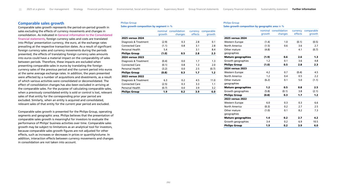 Comparable sales growth Comparable sales growth represents the period-on-period growth in sales excluding the effects of currency movements and changes in consolidation. As indicated in General information to the Consolidated financial statements, foreign currency sales and costs are translated into Philips’ presentation currency, the euro, at the exchange rates prevailing at the respective transaction dates. As a result of significant foreign currency sales and currency movements during the periods presented, the effects of translating foreign currency sales amounts into euros could have a material impact on the comparability of sales between periods. Therefore, these impacts are excluded when presenting comparable sales in euros by translating the foreign currency sales of the previous period and the current period into euros at the same average exchange rates. In addition, the years presented were affected by a number of acquisitions and divestments, as a result of which various activities were consolidated or deconsolidated. The effect of consolidation changes has also been excluded in arriving at the comparable sales. For the purpose of calculating comparable sales, when a previously consolidated entity is sold or control is lost, relevant sales of that entity for the corresponding prior year period are excluded. Similarly, when an entity is acquired and consolidated, relevant sales of that entity for the current year period are excluded. Comparable sales growth is presented for the Philips Group, operating segments and geographic area. Philips believes that the presentation of comparable sales growth is meaningful for investors to evaluate the performance of Philips’ business activities over time. Comparable sales growth may be subject to limitations as an analytical tool for investors, because comparable sales growth figures are not adjusted for other effects, such as increases or decreases in prices or quantity/volume. In addition, interaction effects between currency movements and changes in consolidation are not taken into account. Philips Group Sales growth composition by segment in % 2025 versus 2024 Diagnosis & Treatment (2.9) 0.3 2.8 0.1 Connected Care (1.1) 0.8 3.1 2.8 Personal Health 5.4 - 3.1 8.4 Philips Group (1.0) 0.5 2.8 2.3 2024 versus 2023 Diagnosis & Treatment (0.4) 0.0 1.7 1.3 Connected Care (0.1) 0.8 1.3 2.0 Personal Health (3.2) 0.0 2.5 (0.7) Philips Group (0.8) 0.3 1.7 1.2 2023 versus 2022 Diagnosis & Treatment 6.3 0.2 4.5 11.0 Connected Care (2.5) 0.3 3.3 1.1 Personal Health (0.7) 0.0 3.9 3.2 Philips Group 1.9 0.2 3.9 6.0 nominal growth consolidation changes currency effects comparable growth Philips Group Sales growth composition by geographic area in % 2025 versus 2024 Western Europe (1.4) 1.0 (0.1) (0.5) North America (1.5) 0.6 3.6 2.7 Other mature geographies (4.8) - 4.1 (0.7) Mature geographies (1.9) 0.6 2.6 1.3 Growth geographies 1.2 0.1 3.6 4.8 Philips Group (1.0) 0.5 2.8 2.3 2024 versus 2023 Western Europe 4.2 0.7 (0.4) 4.5 North America 1.2 0.4 0.5 2.2 Other mature geographies (6.2) 0.1 5.0 (1.1) Mature geographies 1.2 0.5 0.8 2.5 Growth geographies (5.8) (0.1) 3.8 (2.1) Philips Group (0.8) 0.3 1.7 1.2 2023 versus 2022 Western Europe 6.0 0.3 0.3 6.6 North America (0.3) 0.2 2.7 2.5 Other mature geographies (1.0) 0.1 8.2 7.3 Mature geographies 1.4 0.2 2.7 4.2 Growth geographies 3.4 0.2 6.9 10.5 Philips Group 1.9 0.2 3.9 6.0 nominal growth consolidation changes currency effects comparable growth ______ 2025 at a glance Our management Strategy Financial performance Environmental, Social and Governance Supervisory Board Group financial statements Company financial statements Sustainability statement Further information 292