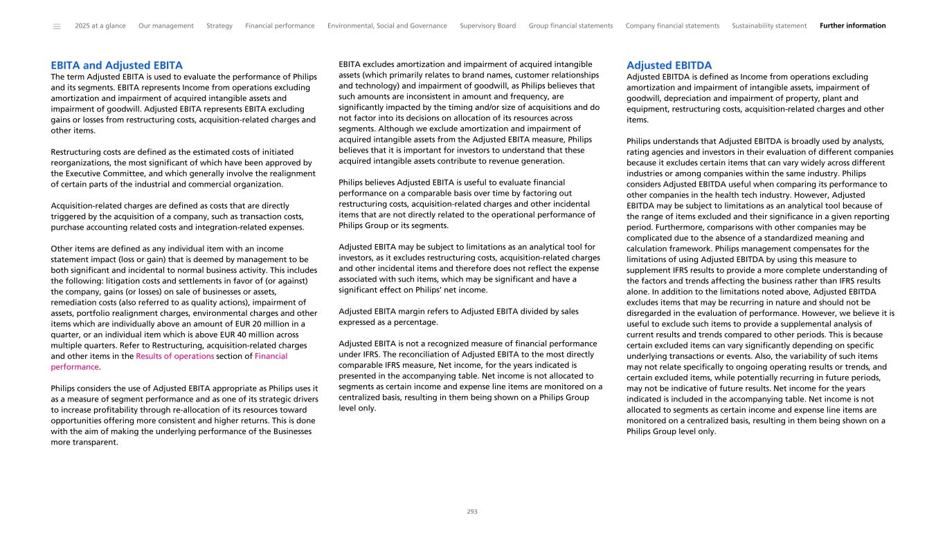 EBITA and Adjusted EBITA The term Adjusted EBITA is used to evaluate the performance of Philips and its segments. EBITA represents Income from operations excluding amortization and impairment of acquired intangible assets and impairment of goodwill. Adjusted EBITA represents EBITA excluding gains or losses from restructuring costs, acquisition-related charges and other items. Restructuring costs are defined as the estimated costs of initiated reorganizations, the most significant of which have been approved by the Executive Committee, and which generally involve the realignment of certain parts of the industrial and commercial organization. Acquisition-related charges are defined as costs that are directly triggered by the acquisition of a company, such as transaction costs, purchase accounting related costs and integration-related expenses. Other items are defined as any individual item with an income statement impact (loss or gain) that is deemed by management to be both significant and incidental to normal business activity. This includes the following: litigation costs and settlements in favor of (or against) the company, gains (or losses) on sale of businesses or assets, remediation costs (also referred to as quality actions), impairment of assets, portfolio realignment charges, environmental charges and other items which are individually above an amount of EUR 20 million in a quarter, or an individual item which is above EUR 40 million across multiple quarters. Refer to Restructuring, acquisition-related charges and other items in the Results of operations section of Financial performance. Philips considers the use of Adjusted EBITA appropriate as Philips uses it as a measure of segment performance and as one of its strategic drivers to increase profitability through re-allocation of its resources toward opportunities offering more consistent and higher returns. This is done with the aim of making the underlying performance of the Businesses more transparent. EBITA excludes amortization and impairment of acquired intangible assets (which primarily relates to brand names, customer relationships and technology) and impairment of goodwill, as Philips believes that such amounts are inconsistent in amount and frequency, are significantly impacted by the timing and/or size of acquisitions and do not factor into its decisions on allocation of its resources across segments. Although we exclude amortization and impairment of acquired intangible assets from the Adjusted EBITA measure, Philips believes that it is important for investors to understand that these acquired intangible assets contribute to revenue generation. Philips believes Adjusted EBITA is useful to evaluate financial performance on a comparable basis over time by factoring out restructuring costs, acquisition-related charges and other incidental items that are not directly related to the operational performance of Philips Group or its segments. Adjusted EBITA may be subject to limitations as an analytical tool for investors, as it excludes restructuring costs, acquisition-related charges and other incidental items and therefore does not reflect the expense associated with such items, which may be significant and have a significant effect on Philips’ net income. Adjusted EBITA margin refers to Adjusted EBITA divided by sales expressed as a percentage. Adjusted EBITA is not a recognized measure of financial performance under IFRS. The reconciliation of Adjusted EBITA to the most directly comparable IFRS measure, Net income, for the years indicated is presented in the accompanying table. Net income is not allocated to segments as certain income and expense line items are monitored on a centralized basis, resulting in them being shown on a Philips Group level only. Adjusted EBITDA Adjusted EBITDA is defined as Income from operations excluding amortization and impairment of intangible assets, impairment of goodwill, depreciation and impairment of property, plant and equipment, restructuring costs, acquisition-related charges and other items. Philips understands that Adjusted EBITDA is broadly used by analysts, rating agencies and investors in their evaluation of different companies because it excludes certain items that can vary widely across different industries or among companies within the same industry. Philips considers Adjusted EBITDA useful when comparing its performance to other companies in the health tech industry. However, Adjusted EBITDA may be subject to limitations as an analytical tool because of the range of items excluded and their significance in a given reporting period. Furthermore, comparisons with other companies may be complicated due to the absence of a standardized meaning and calculation framework. Philips management compensates for the limitations of using Adjusted EBITDA by using this measure to supplement IFRS results to provide a more complete understanding of the factors and trends affecting the business rather than IFRS results alone. In addition to the limitations noted above, Adjusted EBITDA excludes items that may be recurring in nature and should not be disregarded in the evaluation of performance. However, we believe it is useful to exclude such items to provide a supplemental analysis of current results and trends compared to other periods. This is because certain excluded items can vary significantly depending on specific underlying transactions or events. Also, the variability of such items may not relate specifically to ongoing operating results or trends, and certain excluded items, while potentially recurring in future periods, may not be indicative of future results. Net income for the years indicated is included in the accompanying table. Net income is not allocated to segments as certain income and expense line items are monitored on a centralized basis, resulting in them being shown on a Philips Group level only. ______ 2025 at a glance Our management Strategy Financial performance 