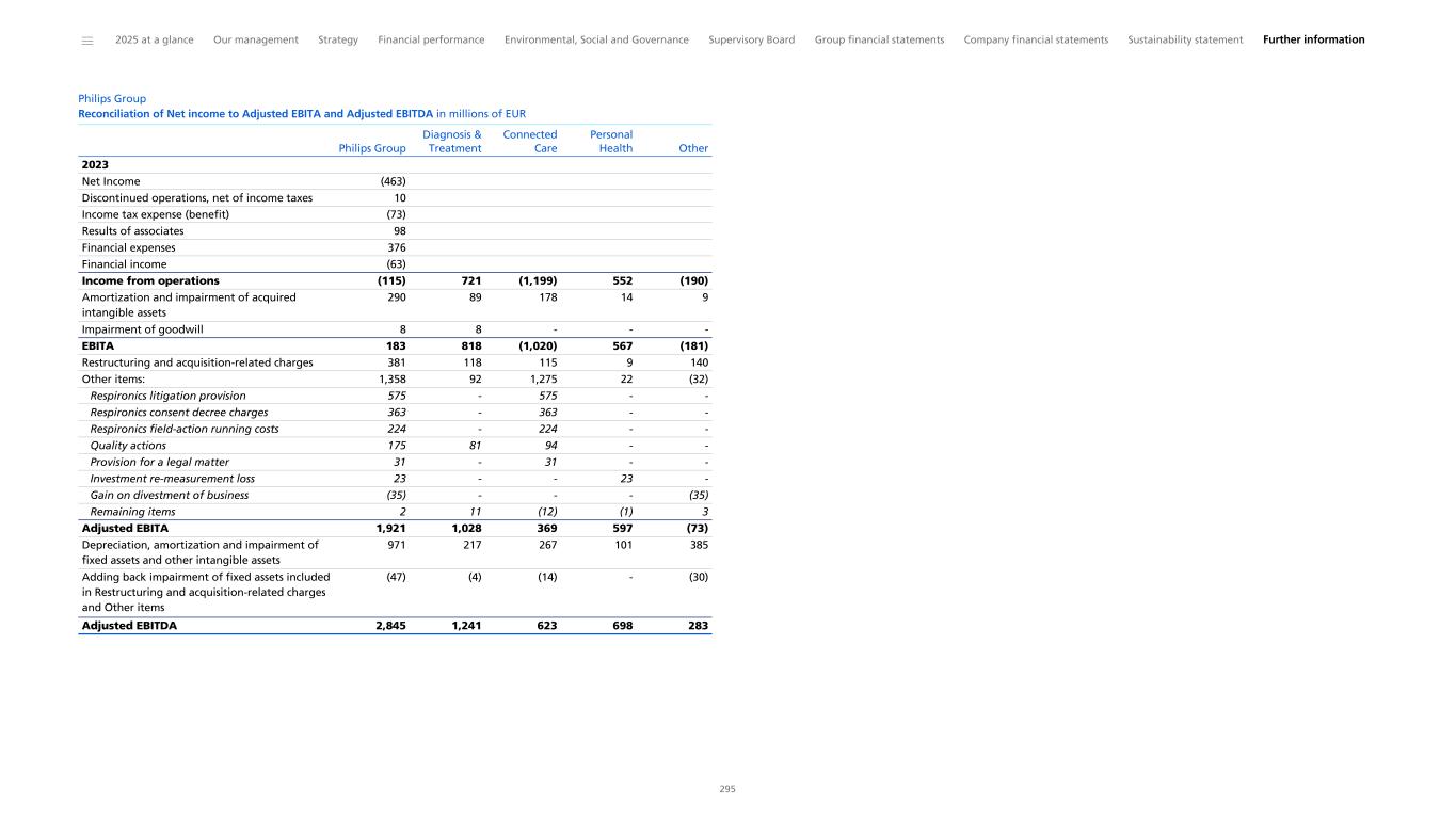 Philips Group Reconciliation of Net income to Adjusted EBITA and Adjusted EBITDA in millions of EUR 2023 Net Income (463) Discontinued operations, net of income taxes 10 Income tax expense (benefit) (73) Results of associates 98 Financial expenses 376 Financial income (63) Income from operations (115) 721 (1,199) 552 (190) Amortization and impairment of acquired intangible assets 290 89 178 14 9 Impairment of goodwill 8 8 - - - EBITA 183 818 (1,020) 567 (181) Restructuring and acquisition-related charges 381 118 115 9 140 Other items: 1,358 92 1,275 22 (32) Respironics litigation provision 575 - 575 - - Respironics consent decree charges 363 - 363 - - Respironics field-action running costs 224 - 224 - - Quality actions 175 81 94 - - Provision for a legal matter 31 - 31 - - Investment re-measurement loss 23 - - 23 - Gain on divestment of business (35) - - - (35) Remaining items 2 11 (12) (1) 3 Adjusted EBITA 1,921 1,028 369 597 (73) Depreciation, amortization and impairment of fixed assets and other intangible assets 971 217 267 101 385 Adding back impairment of fixed assets included in Restructuring and acquisition-related charges and Other items (47) (4) (14) - (30) Adjusted EBITDA 2,845 1,241 623 698 283 Philips Group Diagnosis & Treatment Connected Care Personal Health Other ______ 2025 at a glance Our management Strategy Financial performance Environmental, Social and Governance Supervisory Board Group financial statements Company financial statements Sustainability statement Further information 295