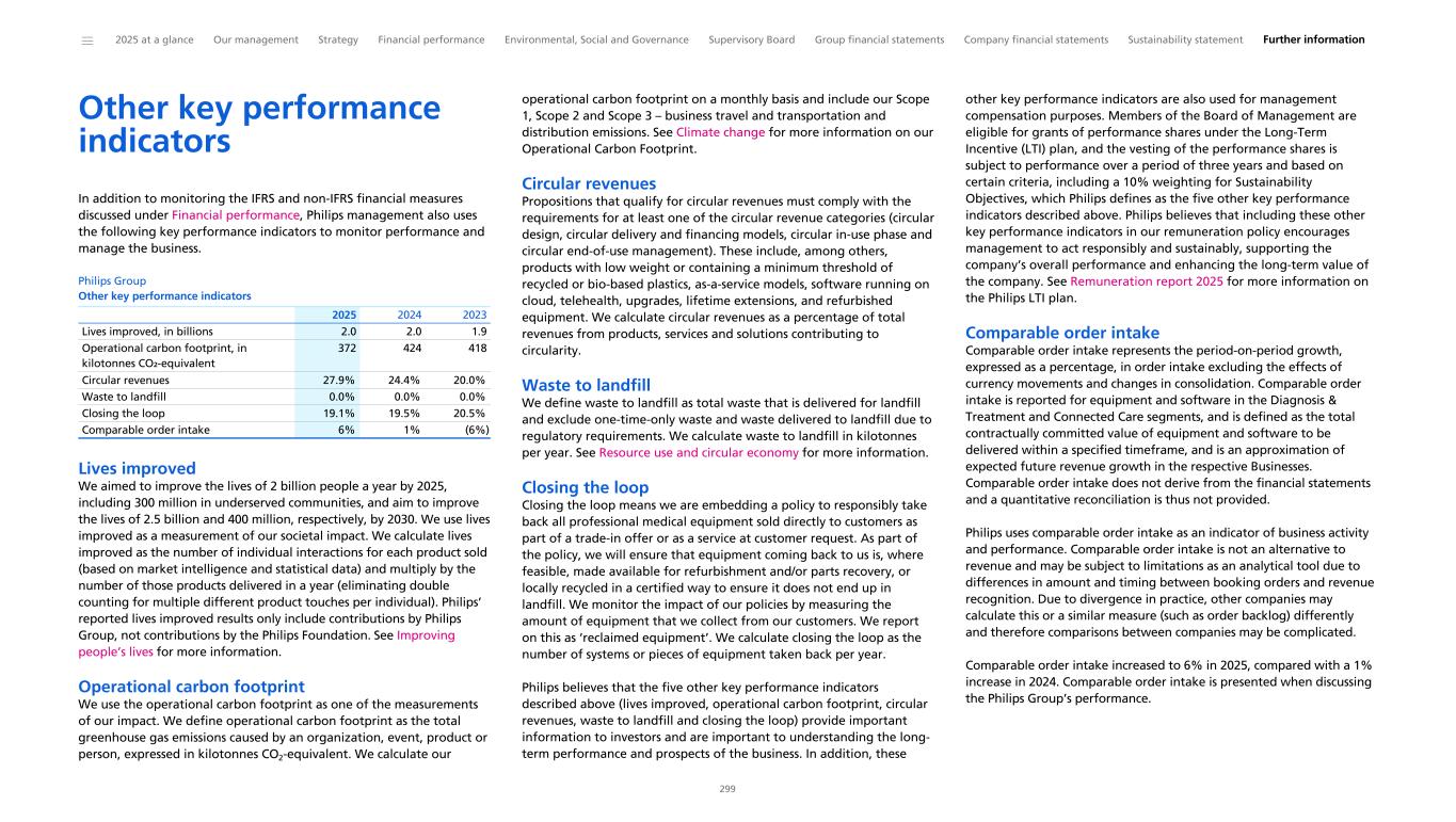 Other key performance indicators In addition to monitoring the IFRS and non-IFRS financial measures discussed under Financial performance, Philips management also uses the following key performance indicators to monitor performance and manage the business. Philips Group Other key performance indicators Lives improved, in billions 2.0 2.0 1.9 Operational carbon footprint, in kilotonnes CO₂-equivalent 372 424 418 Circular revenues 27.9% 24.4% 20.0% Waste to landfill 0.0% 0.0% 0.0% Closing the loop 19.1% 19.5% 20.5% Comparable order intake 6% 1% (6%) 2025 2024 2023 Lives improved We aimed to improve the lives of 2 billion people a year by 2025, including 300 million in underserved communities, and aim to improve the lives of 2.5 billion and 400 million, respectively, by 2030. We use lives improved as a measurement of our societal impact. We calculate lives improved as the number of individual interactions for each product sold (based on market intelligence and statistical data) and multiply by the number of those products delivered in a year (eliminating double counting for multiple different product touches per individual). Philips’ reported lives improved results only include contributions by Philips Group, not contributions by the Philips Foundation. See Improving people’s lives for more information. Operational carbon footprint We use the operational carbon footprint as one of the measurements of our impact. We define operational carbon footprint as the total greenhouse gas emissions caused by an organization, event, product or person, expressed in kilotonnes CO2-equivalent. We calculate our operational carbon footprint on a monthly basis and include our Scope 1, Scope 2 and Scope 3 – business travel and transportation and distribution emissions. See Climate change for more information on our Operational Carbon Footprint. Circular revenues Propositions that qualify for circular revenues must comply with the requirements for at least one of the circular revenue categories (circular design, circular delivery and financing models, circular in-use phase and circular end-of-use management). These include, among others, products with low weight or containing a minimum threshold of recycled or bio-based plastics, as-a-service models, software running on cloud, telehealth, upgrades, lifetime extensions, and refurbished equipment. We calculate circular revenues as a percentage of total revenues from products, services and solutions contributing to circularity. Waste to landfill We define waste to landfill as total waste that is delivered for landfill and exclude one-time-only waste and waste delivered to landfill due to regulatory requirements. We calculate waste to landfill in kilotonnes per year. See Resource use and circular economy for more information. Closing the loop Closing the loop means we are embedding a policy to responsibly take back all professional medical equipment sold directly to customers as part of a trade-in offer or as a service at customer request. As part of the policy, we will ensure that equipment coming back to us is, where feasible, made available for refurbishment and/or parts recovery, or locally recycled in a certified way to ensure it does not end up in landfill. We monitor the impact of our policies by measuring the amount of equipment that we collect from our customers. We report on this as ‘reclaimed equipment’. We calculate closing the loop as the number of systems or pieces of equipment taken back per year. Philips believes that the five other key performance indicators described above (lives improved, operational carbon footprint, circular revenues, waste to landfill and closing the loop) provide important information to investors and are important to understanding the long- term performance and prospects of the business. In addition, these other key performance indicators are also used for management compensation purposes. Members of the Board of Management are eligible for grants of performance shares under the Long-Term Incentive (LTI) plan, and the vesting of the performance shares is subject to performance over a period of three years and based on certain criteria, including a 10% weighting for Sustainability Objectives, which Philips defines as the five other key performance indicators described above. Philips believes that including these other key performance indicators in our remuneration policy encourages management to act responsibly and sustainably, supporting the company’s overall performance and enhancing the long-term value of the company. See Remuneration report 2025 for more information on the Philips LTI plan. Comparable order intake Comparable order intake represents the period-on-period growth, expressed as a percentage, in order intake excluding the effects of currency movements and changes in consolidation. Comparable order intake is reported for equipment and software in the Diagnosis & Treatment and Connected Care segments, and is defined as the total contractually committed value of equipment and software to be delivered within a specified timeframe, and is an approximation of expected future revenue growth in the respective Businesses. Comparable order intake does not derive from the financial statements and a quantitative reconciliation is thus not provided. Philips uses comparable order intake as an indicator of business activity and performance. Comparable order intake is not an alternative to revenue and may be subject to limitations as an analytical tool due to differences in amount and timing between booking orders and revenue recognition. Due to divergence in practice, other companies may calculate this or a similar measure (such as order backlog) differently and therefore comparisons between companies may be complicated. Comparable order intake increased to 6% in 2025, compared with a 1% increase in 2024. Comparable order intake is presented when discussing the Philips Group’s performance. ______ 2025 at a gl