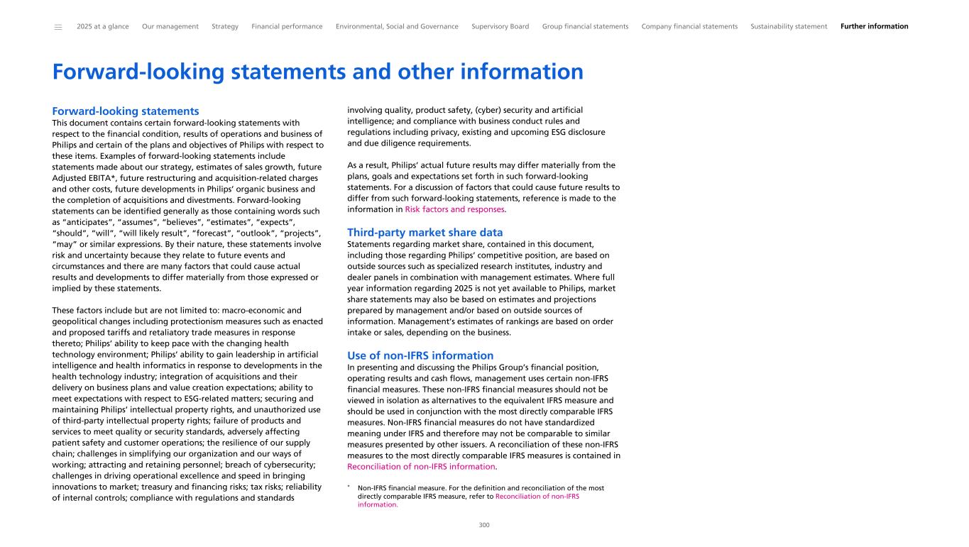 Forward-looking statements and other information Forward-looking statements This document contains certain forward-looking statements with respect to the financial condition, results of operations and business of Philips and certain of the plans and objectives of Philips with respect to these items. Examples of forward-looking statements include statements made about our strategy, estimates of sales growth, future Adjusted EBITA*, future restructuring and acquisition-related charges and other costs, future developments in Philips’ organic business and the completion of acquisitions and divestments. Forward-looking statements can be identified generally as those containing words such as “anticipates”, “assumes”, “believes”, “estimates”, “expects”, “should”, “will”, “will likely result”, “forecast”, “outlook”, “projects”, “may” or similar expressions. By their nature, these statements involve risk and uncertainty because they relate to future events and circumstances and there are many factors that could cause actual results and developments to differ materially from those expressed or implied by these statements. These factors include but are not limited to: macro-economic and geopolitical changes including protectionism measures such as enacted and proposed tariffs and retaliatory trade measures in response thereto; Philips’ ability to keep pace with the changing health technology environment; Philips’ ability to gain leadership in artificial intelligence and health informatics in response to developments in the health technology industry; integration of acquisitions and their delivery on business plans and value creation expectations; ability to meet expectations with respect to ESG-related matters; securing and maintaining Philips’ intellectual property rights, and unauthorized use of third-party intellectual property rights; failure of products and services to meet quality or security standards, adversely affecting patient safety and customer operations; the resilience of our supply chain; challenges in simplifying our organization and our ways of working; attracting and retaining personnel; breach of cybersecurity; challenges in driving operational excellence and speed in bringing innovations to market; treasury and financing risks; tax risks; reliability of internal controls; compliance with regulations and standards involving quality, product safety, (cyber) security and artificial intelligence; and compliance with business conduct rules and regulations including privacy, existing and upcoming ESG disclosure and due diligence requirements. As a result, Philips’ actual future results may differ materially from the plans, goals and expectations set forth in such forward-looking statements. For a discussion of factors that could cause future results to differ from such forward-looking statements, reference is made to the information in Risk factors and responses. Third-party market share data Statements regarding market share, contained in this document, including those regarding Philips’ competitive position, are based on outside sources such as specialized research institutes, industry and dealer panels in combination with management estimates. Where full year information regarding 2025 is not yet available to Philips, market share statements may also be based on estimates and projections prepared by management and/or based on outside sources of information. Management’s estimates of rankings are based on order intake or sales, depending on the business. Use of non-IFRS information In presenting and discussing the Philips Group’s financial position, operating results and cash flows, management uses certain non-IFRS financial measures. These non-IFRS financial measures should not be viewed in isolation as alternatives to the equivalent IFRS measure and should be used in conjunction with the most directly comparable IFRS measures. Non-IFRS financial measures do not have standardized meaning under IFRS and therefore may not be comparable to similar measures presented by other issuers. A reconciliation of these non-IFRS measures to the most directly comparable IFRS measures is contained in Reconciliation of non-IFRS information. * Non-IFRS financial measure. For the definition and reconciliation of the most directly comparable IFRS measure, refer to Reconciliation of non-IFRS information. ______ 2025 at a glance Our management Strategy Financial performance Environmental, Social and Governance Supervisory Board Group financial statements Company financial statements Sustainability statement Further information 300