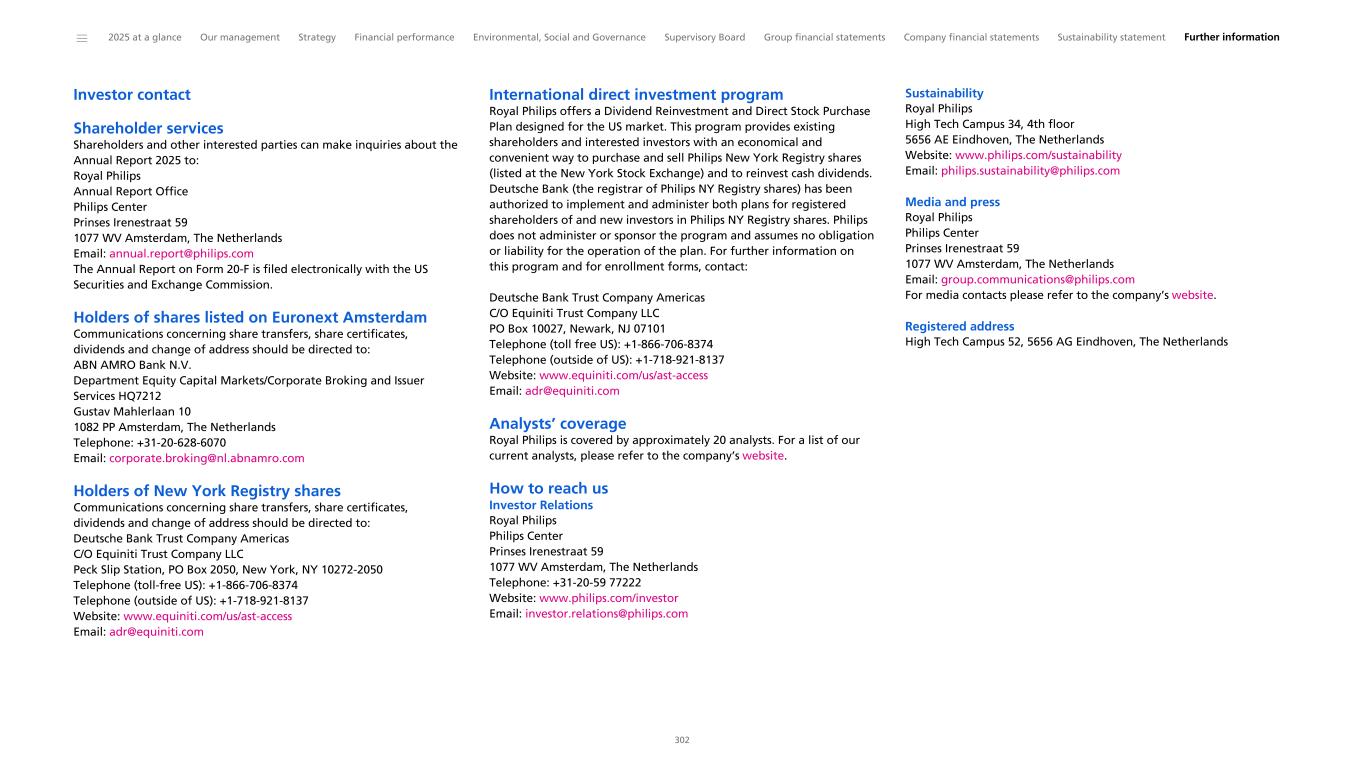 Investor contact Shareholder services Shareholders and other interested parties can make inquiries about the Annual Report 2025 to: Royal Philips Annual Report Office Philips Center Prinses Irenestraat 59 1077 WV Amsterdam, The Netherlands Email: annual.report@philips.com The Annual Report on Form 20-F is filed electronically with the US Securities and Exchange Commission. Holders of shares listed on Euronext Amsterdam Communications concerning share transfers, share certificates, dividends and change of address should be directed to: ABN AMRO Bank N.V. Department Equity Capital Markets/Corporate Broking and Issuer Services HQ7212 Gustav Mahlerlaan 10 1082 PP Amsterdam, The Netherlands Telephone: +31-20-628-6070 Email: corporate.broking@nl.abnamro.com Holders of New York Registry shares Communications concerning share transfers, share certificates, dividends and change of address should be directed to: Deutsche Bank Trust Company Americas C/O Equiniti Trust Company LLC Peck Slip Station, PO Box 2050, New York, NY 10272-2050 Telephone (toll-free US): +1-866-706-8374 Telephone (outside of US): +1-718-921-8137 Website: www.equiniti.com/us/ast-access Email: adr@equiniti.com International direct investment program Royal Philips offers a Dividend Reinvestment and Direct Stock Purchase Plan designed for the US market. This program provides existing shareholders and interested investors with an economical and convenient way to purchase and sell Philips New York Registry shares (listed at the New York Stock Exchange) and to reinvest cash dividends. Deutsche Bank (the registrar of Philips NY Registry shares) has been authorized to implement and administer both plans for registered shareholders of and new investors in Philips NY Registry shares. Philips does not administer or sponsor the program and assumes no obligation or liability for the operation of the plan. For further information on this program and for enrollment forms, contact: Deutsche Bank Trust Company Americas C/O Equiniti Trust Company LLC PO Box 10027, Newark, NJ 07101 Telephone (toll free US): +1-866-706-8374 Telephone (outside of US): +1-718-921-8137 Website: www.equiniti.com/us/ast-access Email: adr@equiniti.com Analysts’ coverage Royal Philips is covered by approximately 20 analysts. For a list of our current analysts, please refer to the company’s website. How to reach us Investor Relations Royal Philips Philips Center Prinses Irenestraat 59 1077 WV Amsterdam, The Netherlands Telephone: +31-20-59 77222 Website: www.philips.com/investor Email: investor.relations@philips.com Sustainability Royal Philips High Tech Campus 34, 4th floor 5656 AE Eindhoven, The Netherlands Website: www.philips.com/sustainability Email: philips.sustainability@philips.com Media and press Royal Philips Philips Center Prinses Irenestraat 59 1077 WV Amsterdam, The Netherlands Email: group.communications@philips.com For media contacts please refer to the company’s website. Registered address High Tech Campus 52, 5656 AG Eindhoven, The Netherlands ______ 2025 at a glance Our management Strategy Financial performance Environmental, Social and Governance Supervisory Board Group financial statements Company financial statements Sustainability statement Further information 302